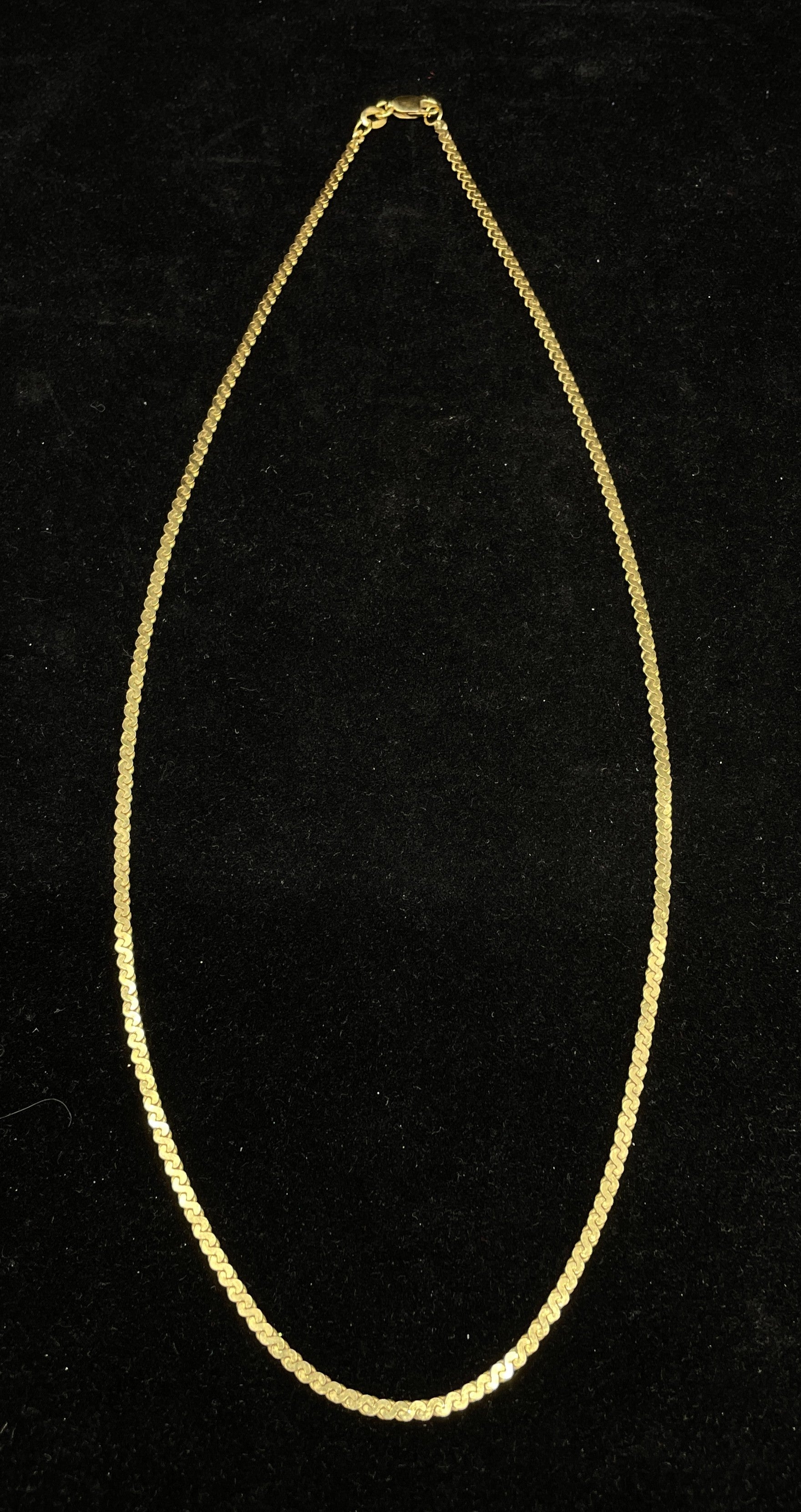 10k gold S-link chain. This gorgeous 10k yellow gold chain has a streamlined and sleek S-link design. The flat links intertwine in a way that allows this necklace to move and shimmer in a unique fashion. The shape of the links catches light beautifully, giving this chain an alluring shine. The chain is fastened with a lobster claw clasp. A versatile chain for both men and women that is sure to elevate any outfit.