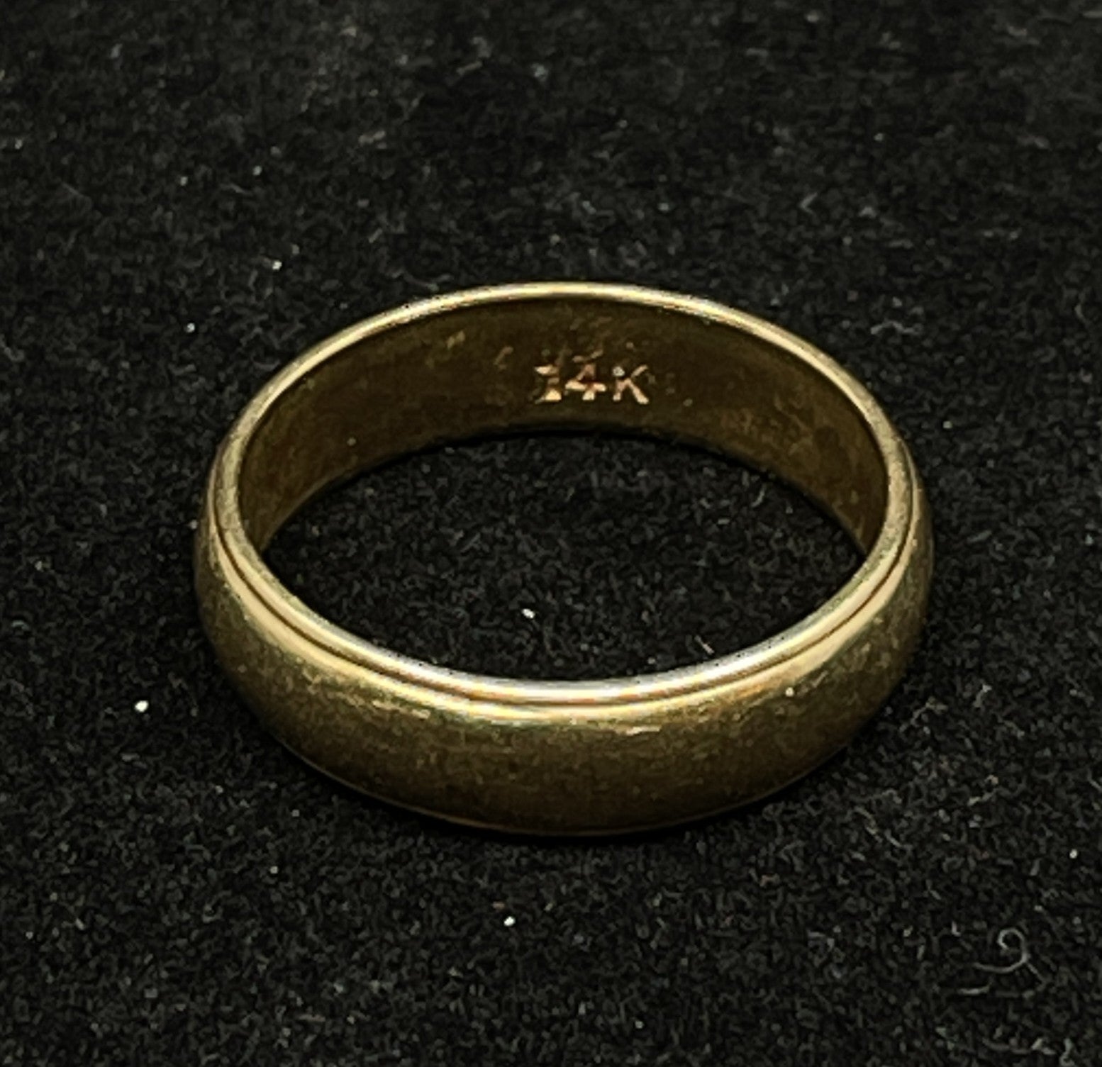 14k gold band. This simple gold band is beautifully crafted with a sleek design. The plain yellow gold band has a slight curve that catches light beautifully. Though the ring is simple, its design is timeless and comfortable with an overall smooth surface. A classic and elegant ring that is unisex in design and is sure to elevate any outfit.