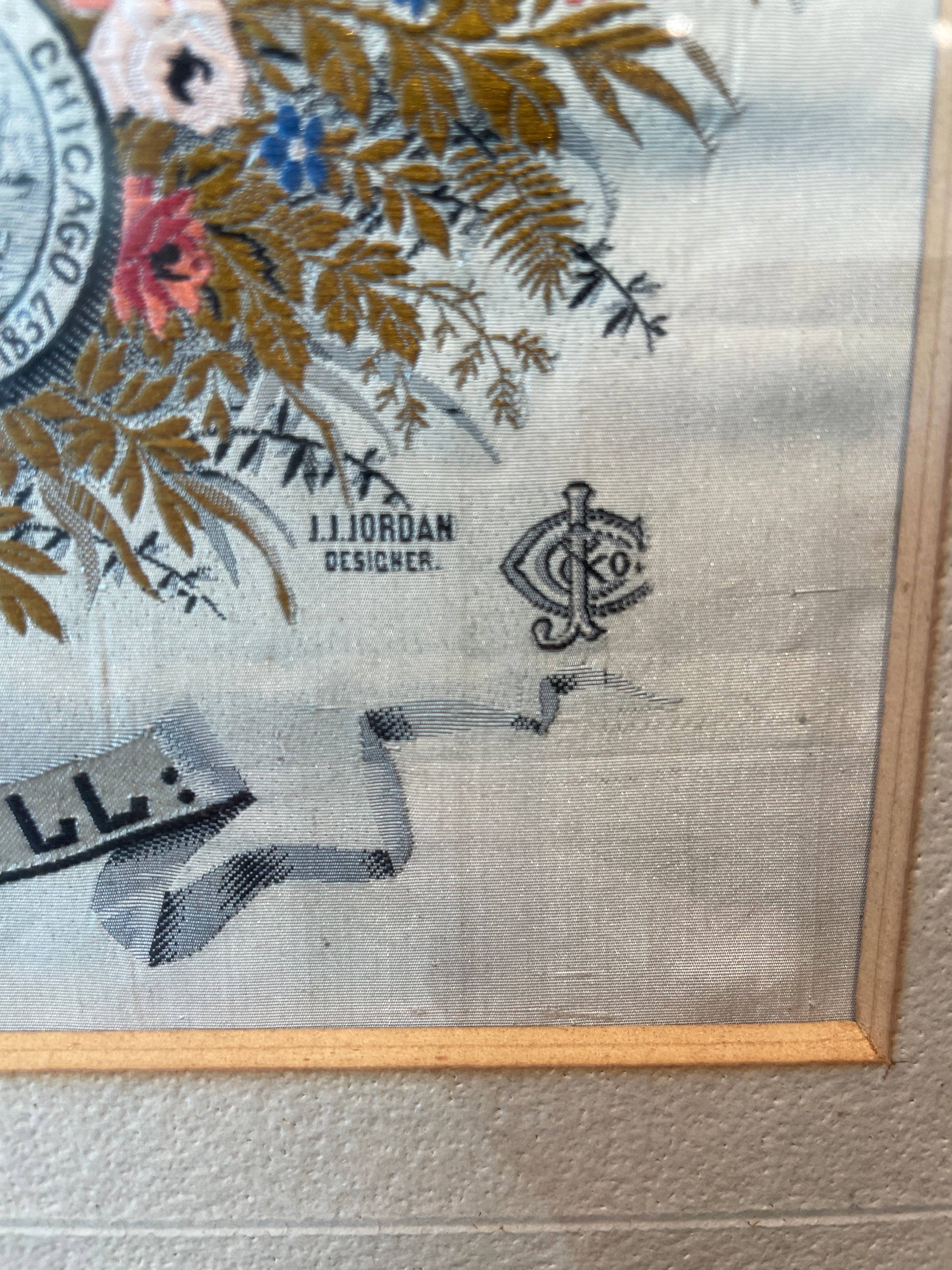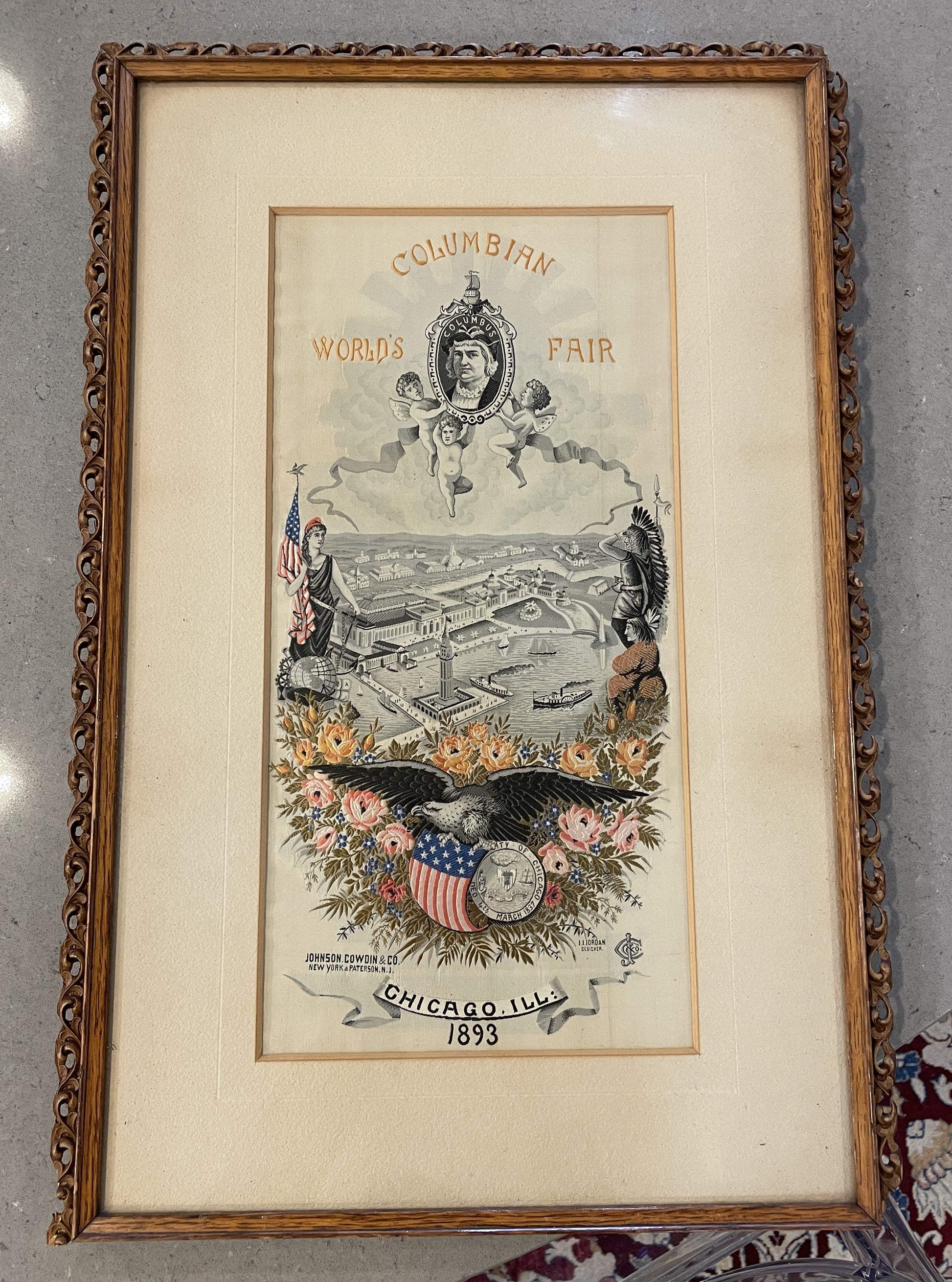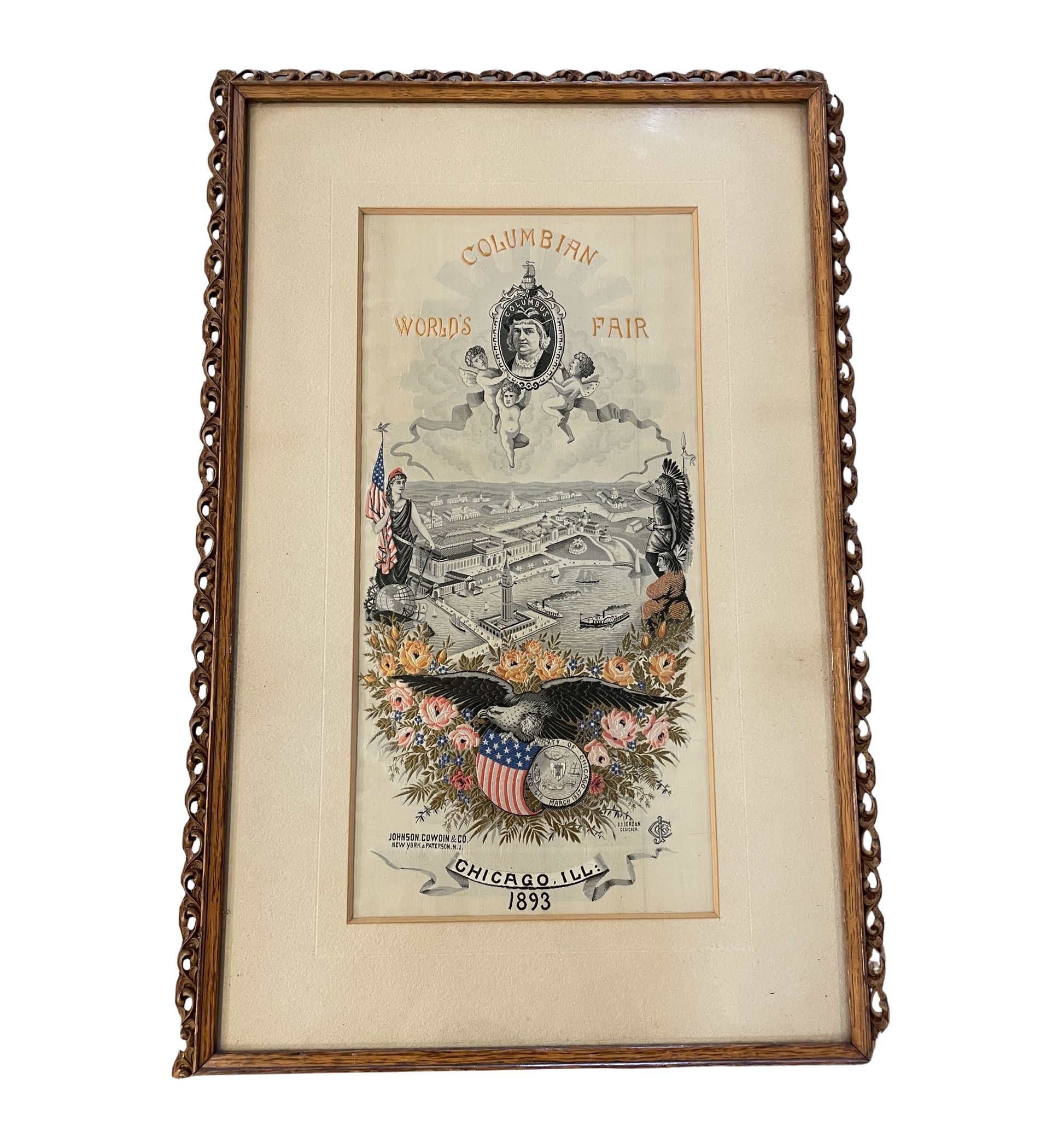 Embroidered silk 1893 World's Fair. Marked J. J. Jordan lower right, and Johnson Cowdin Co. lower left. This unique piece is a commemorative silk ribbon from the 1893 World's Fair in Chicago. The piece includes a black and white aerial view of the location, an American flag, colorful florals, a bust portrait of Christopher Columbus, and other American cultural figures. The piece is matted in beige and set in a wood frame with carved details. A beautiful piece of American history that's sure to elevate a space.