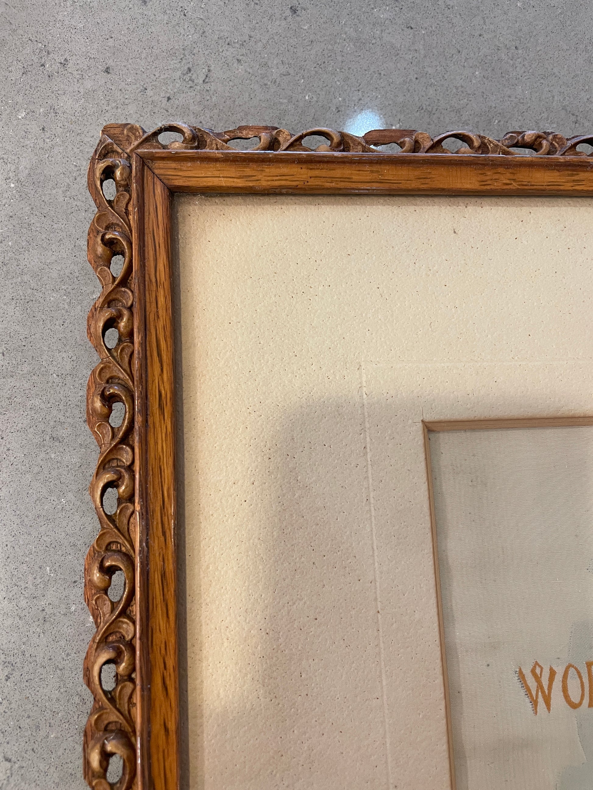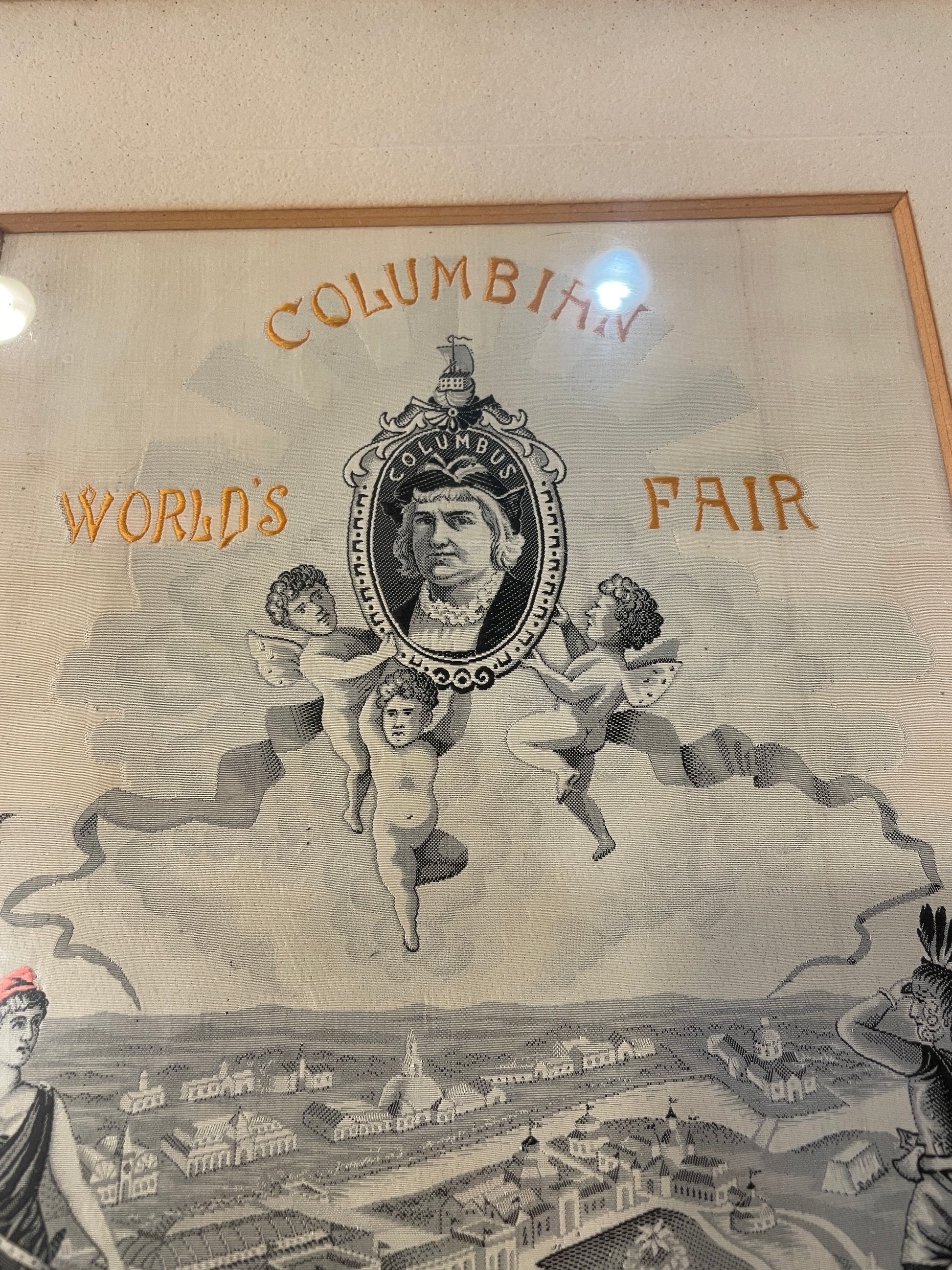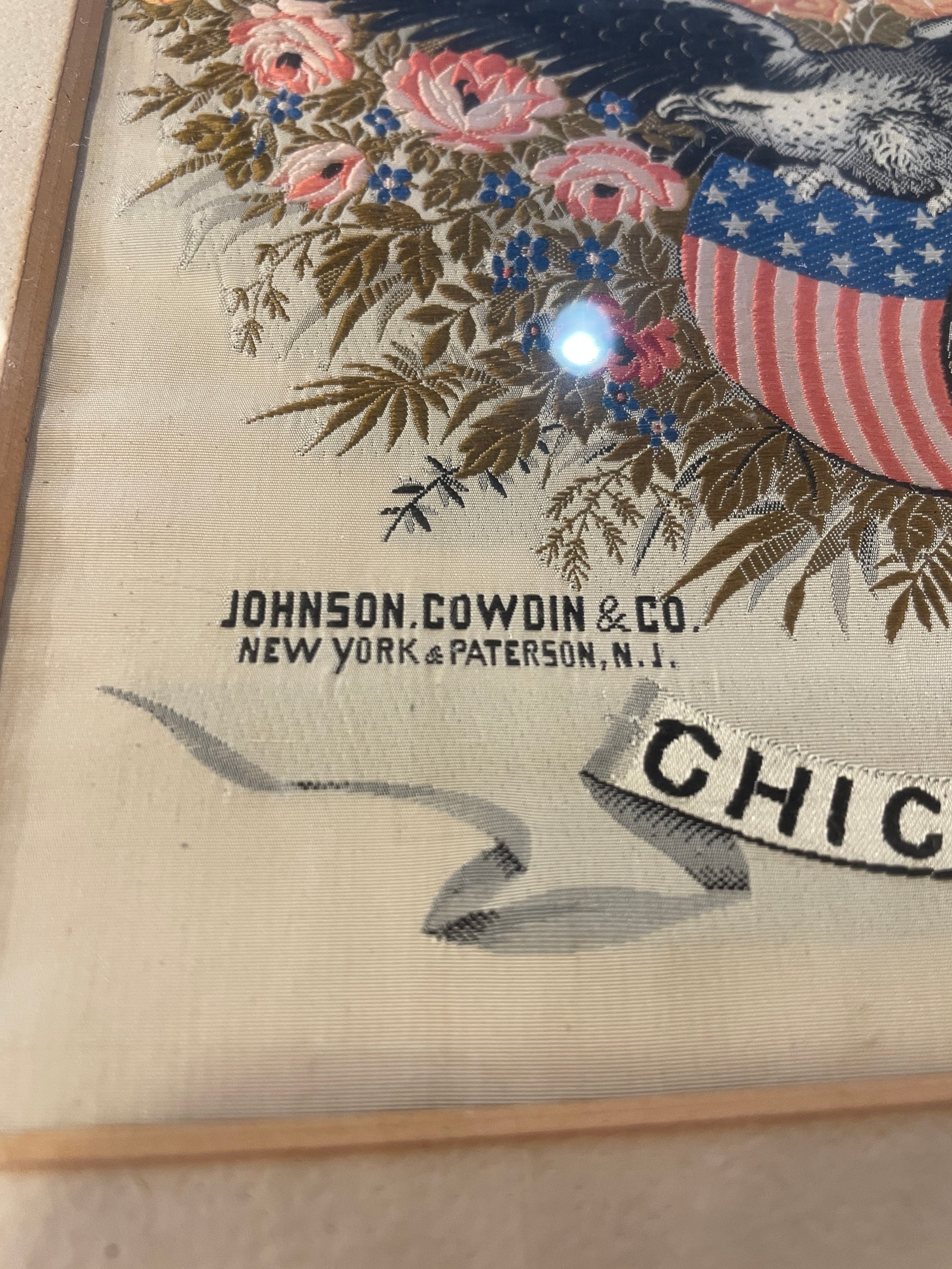 Embroidered silk 1893 World's Fair. Marked J. J. Jordan lower right, and Johnson Cowdin Co. lower left. This unique piece is a commemorative silk ribbon from the 1893 World's Fair in Chicago. The piece includes a black and white aerial view of the location, an American flag, colorful florals, a bust portrait of Christopher Columbus, and other American cultural figures. The piece is matted in beige and set in a wood frame with carved details. A beautiful piece of American history that's sure to elevate a space.