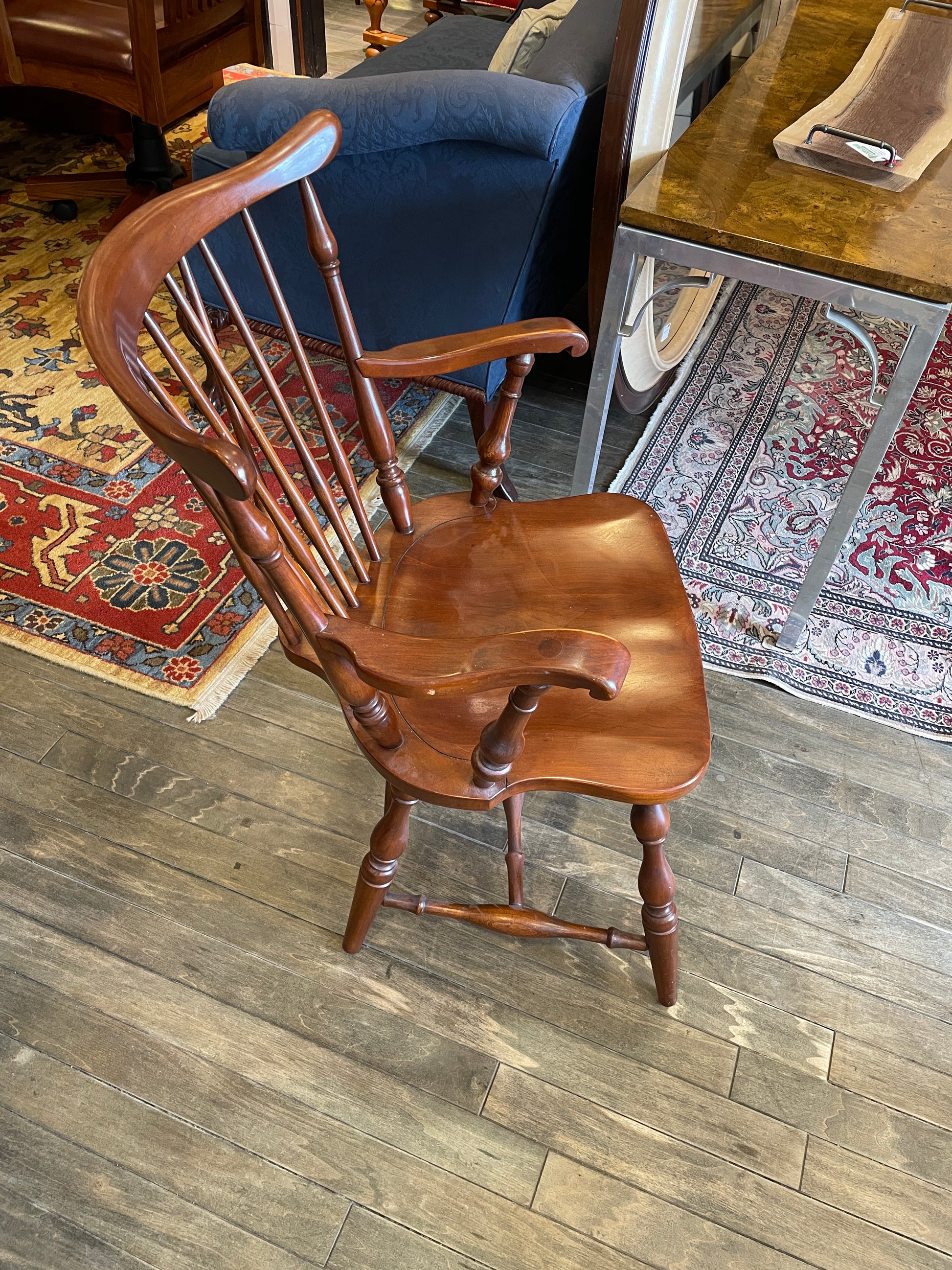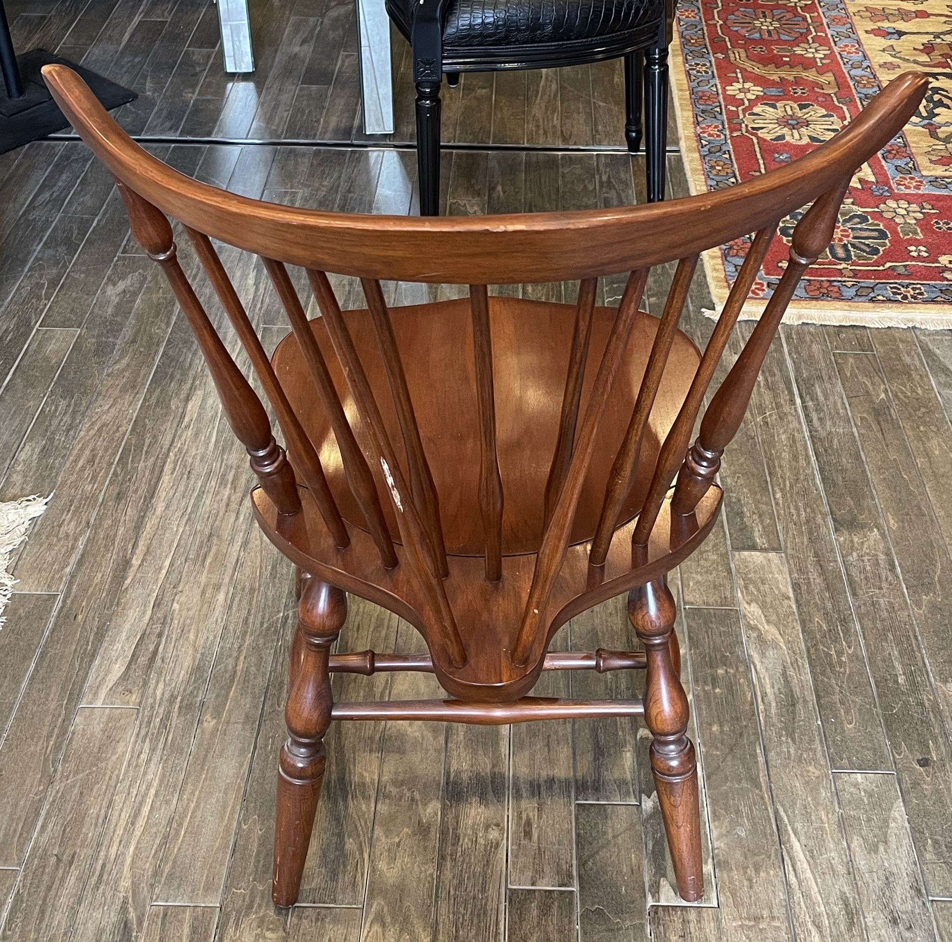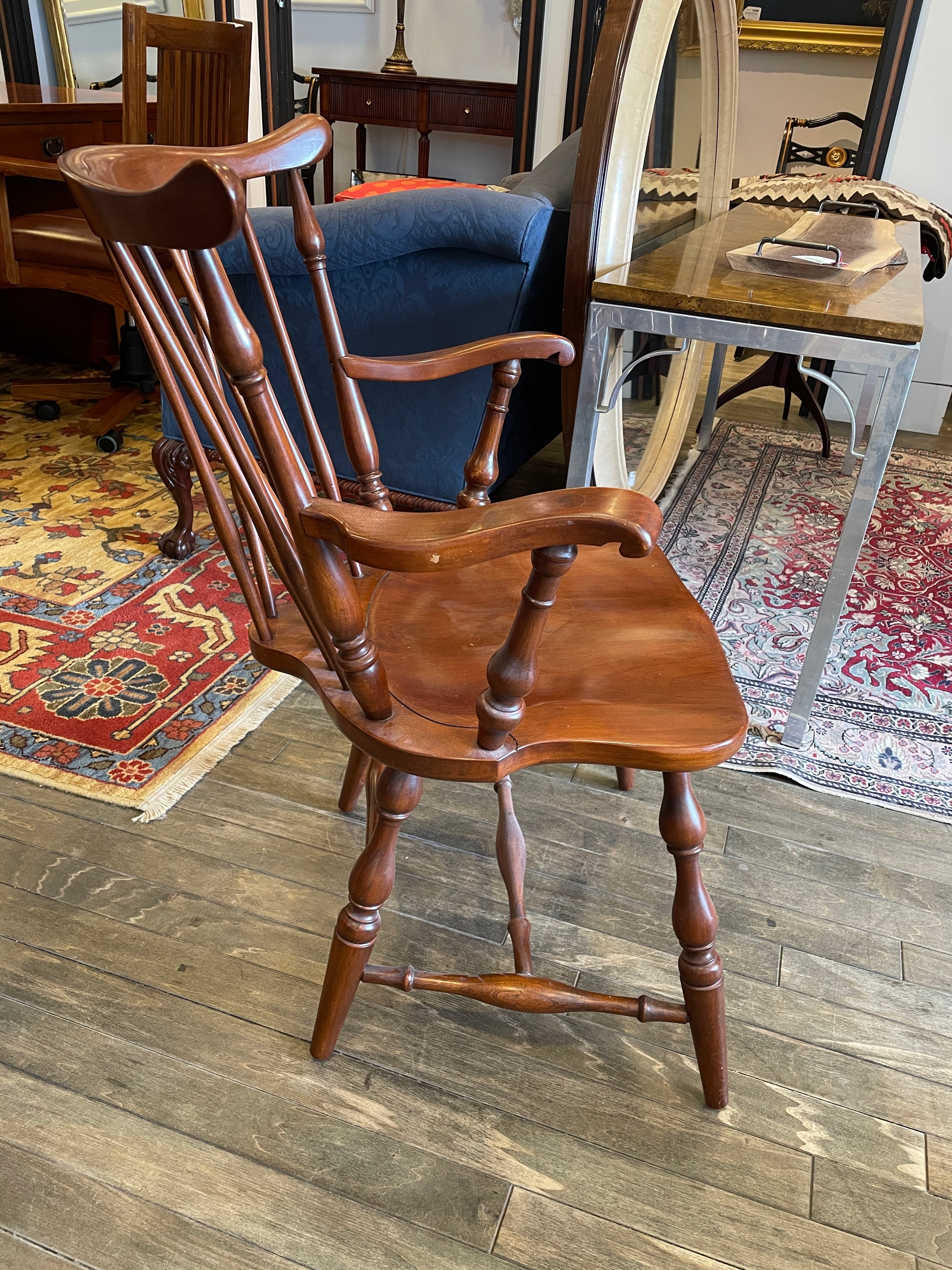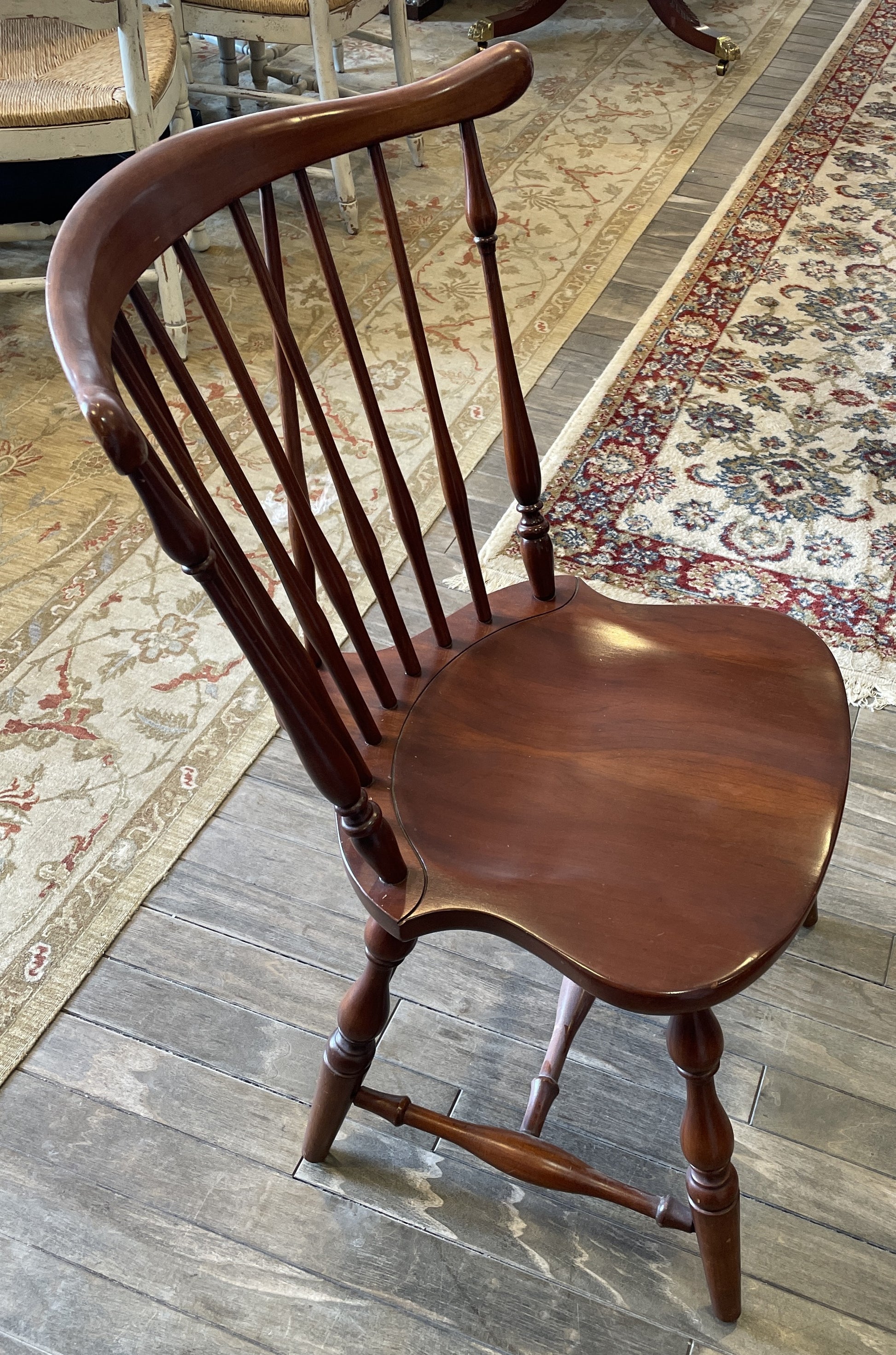 Set of 6 cherry wood Windsor style dining chairs by the brand Pennsylvania House. Includes two armchairs and four side chairs. Each side chair features carved legs and a carved stretcher. An X-shaped wooden back is present on the back of each chair for additional back support. The finish is a rich medium brown color with a subtle gloss.