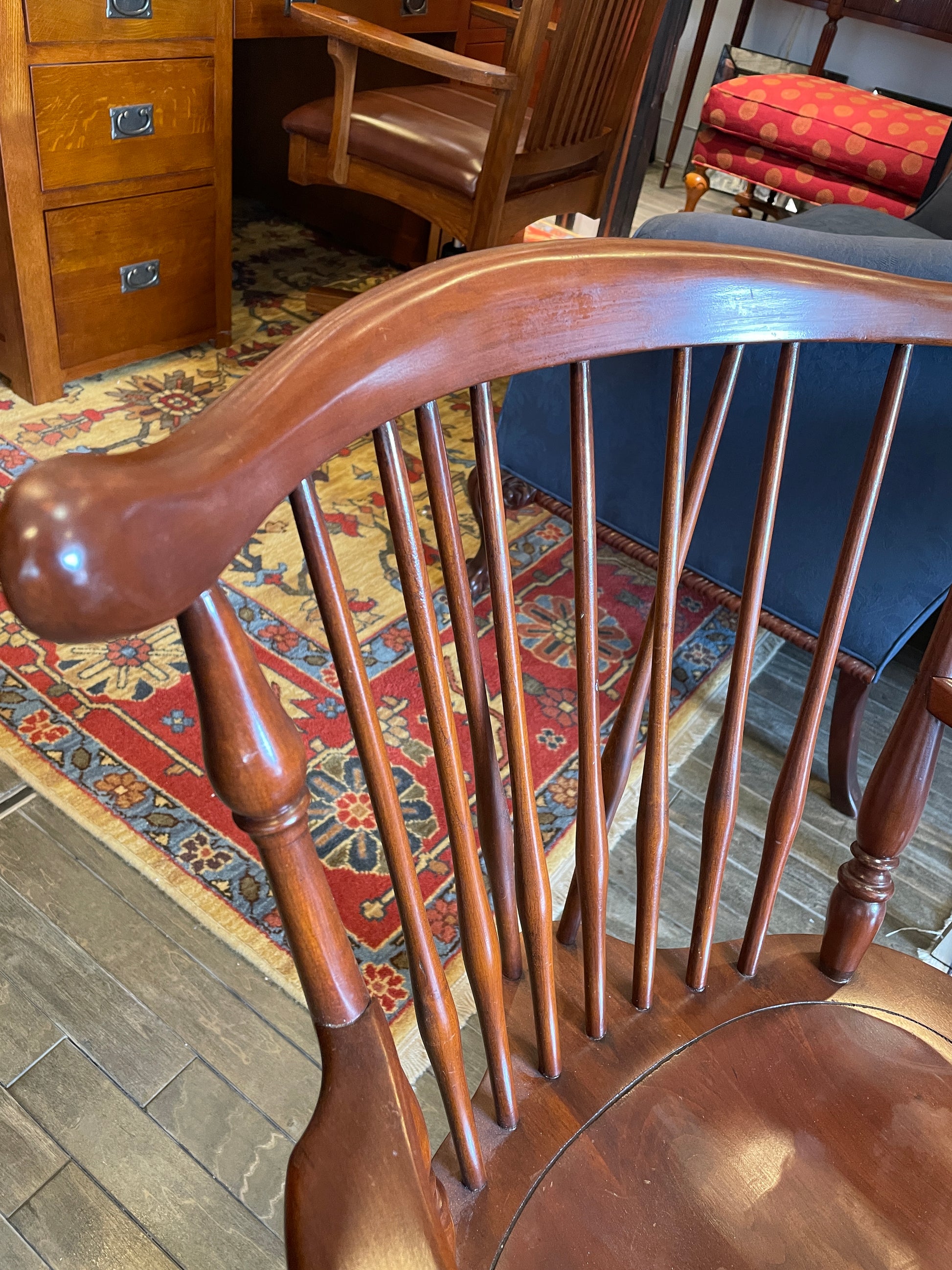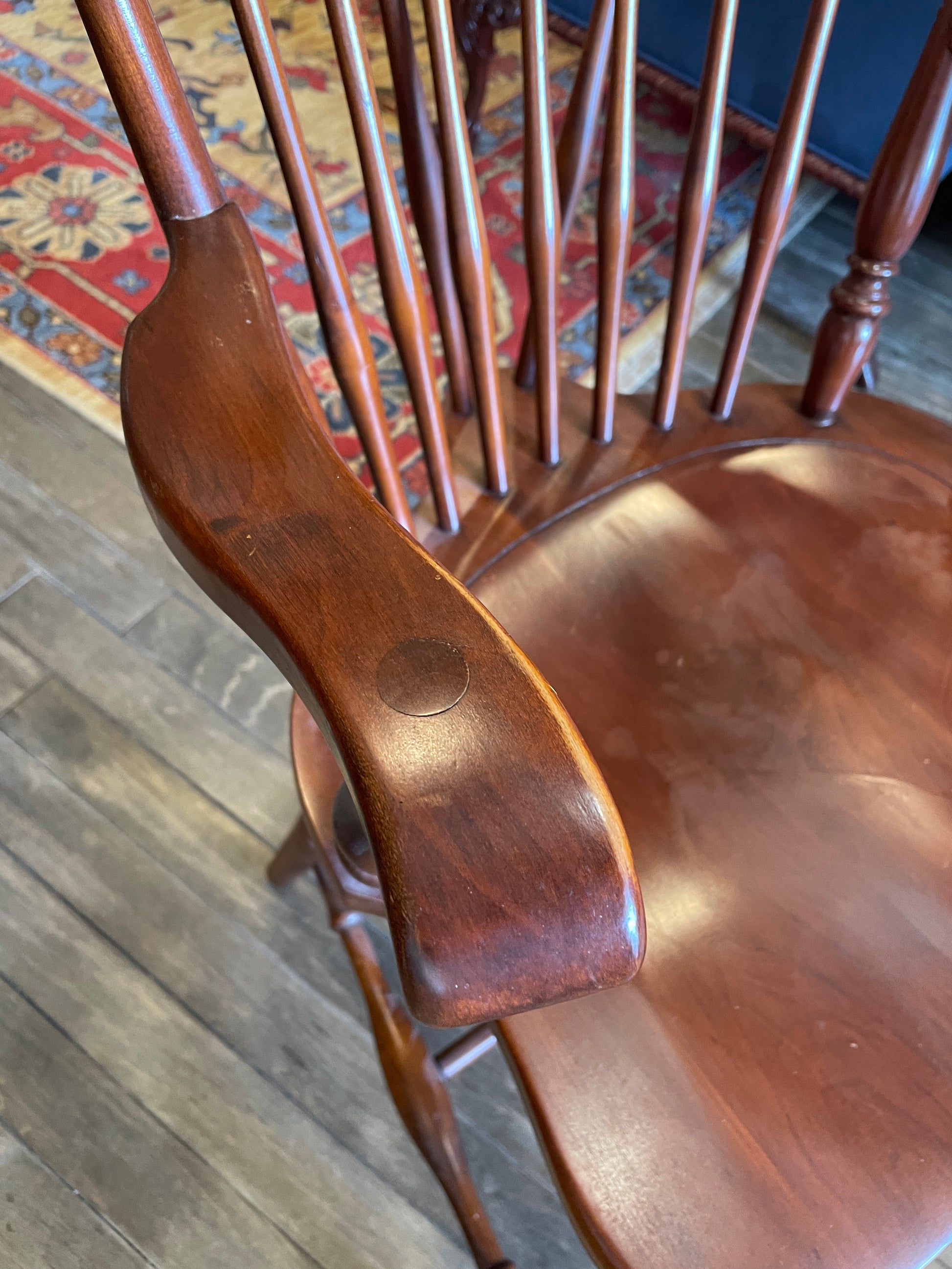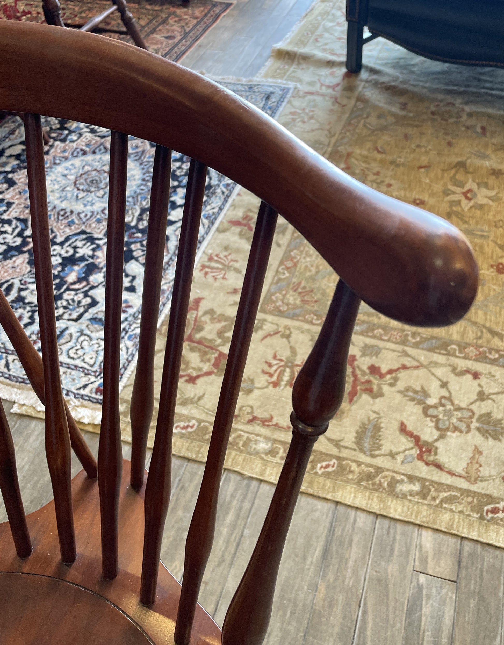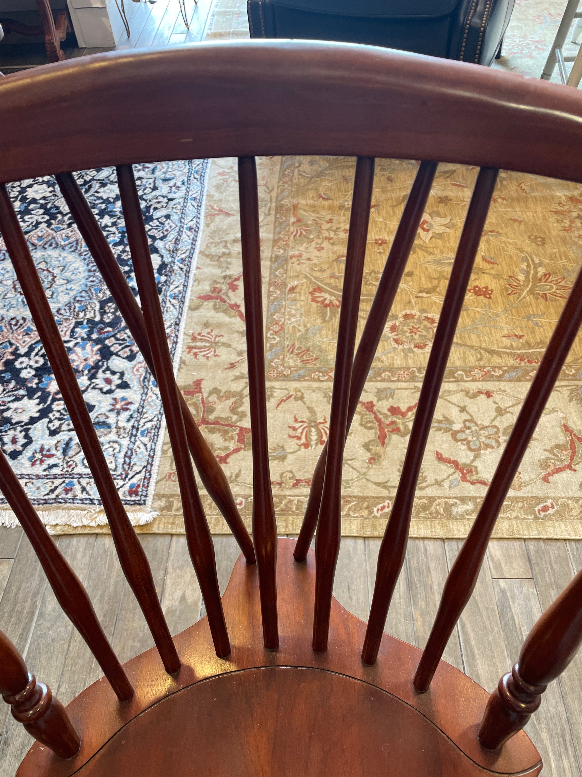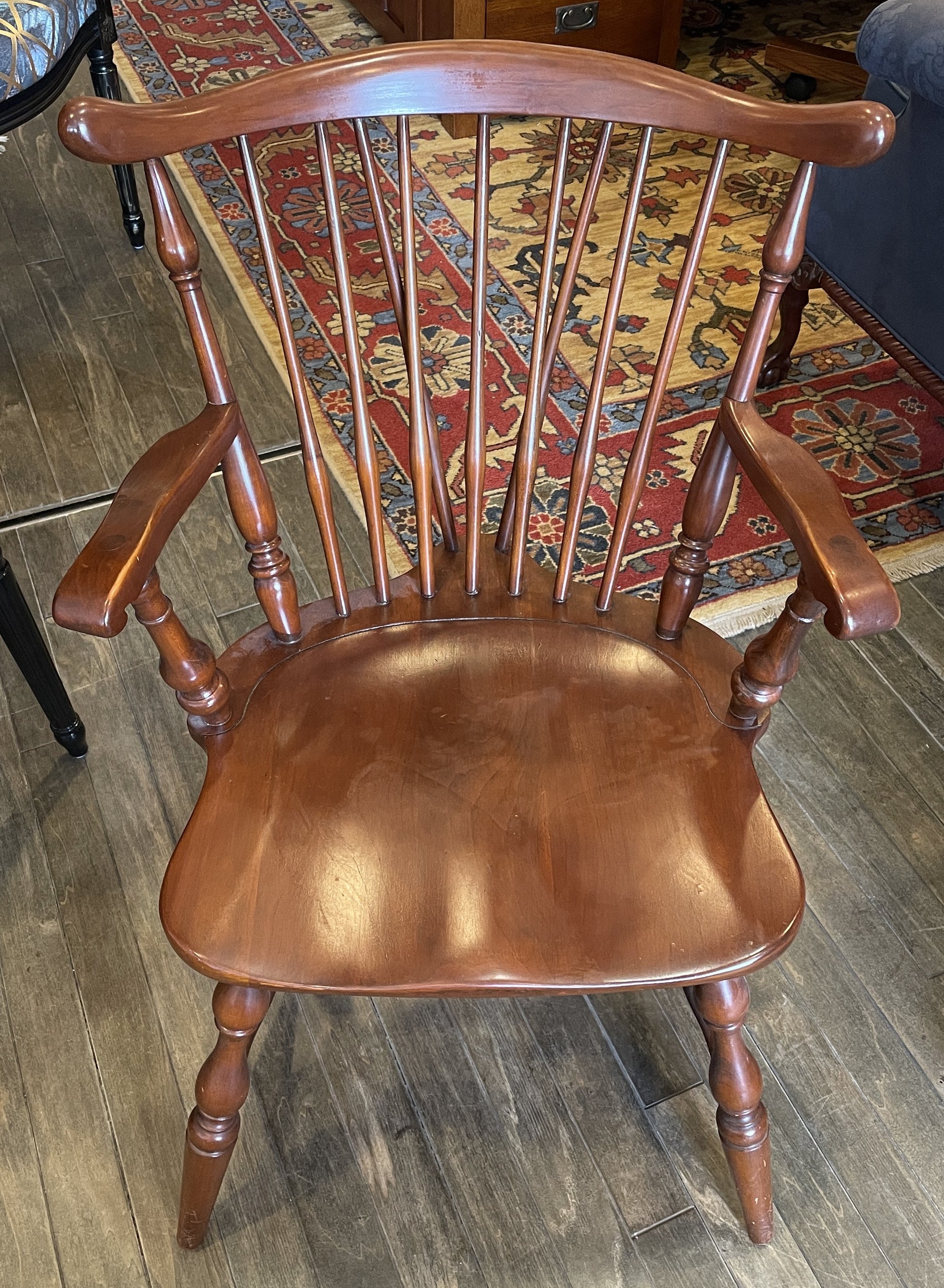 Set of 6 cherry wood Windsor style dining chairs by the brand Pennsylvania House. Includes two armchairs and four side chairs. Each side chair features carved legs and a carved stretcher. An X-shaped wooden back is present on the back of each chair for additional back support. The finish is a rich medium brown color with a subtle gloss.
