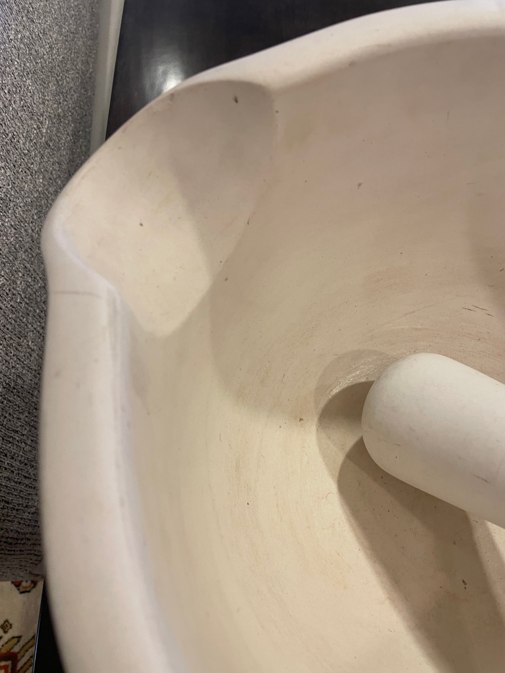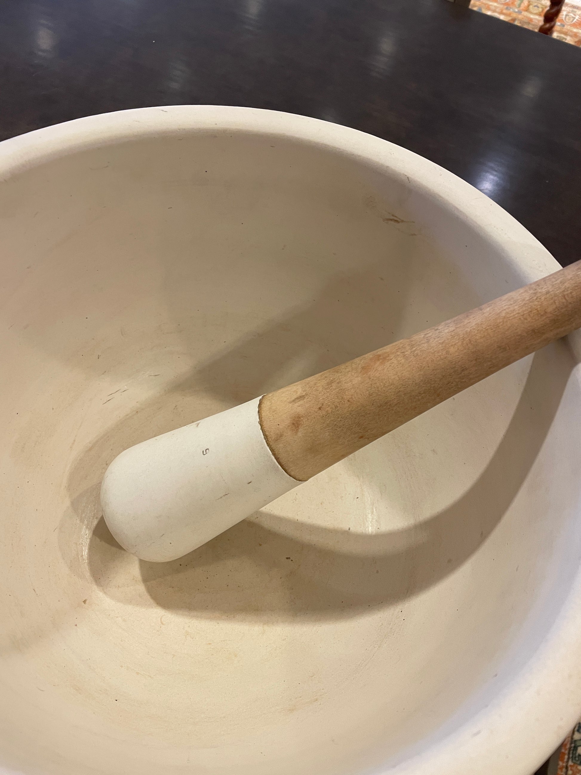 Acme extra large mortar and pestle. This sleek piece features a white mortar with a pour spout. The pestle has the same white tip, but also has a light toned wooden handle. The bowl is made of concrete and has a sturdy heft to it. An understated piece perfect as a decorative accent.