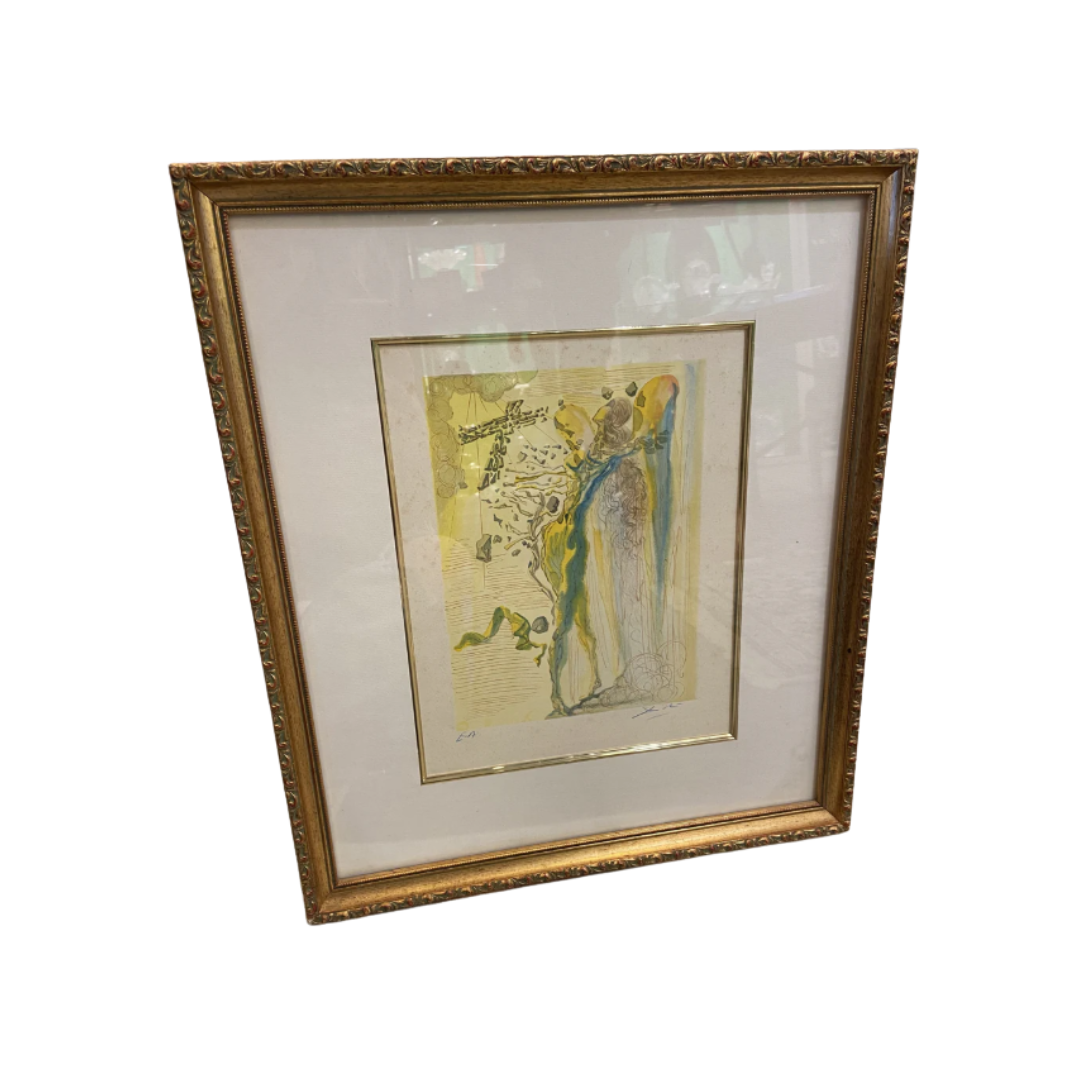From Dalí produced a series of illustrations for the Divine Comedy. This piece portrays St. Buonaventura’s narrative of St. Dominic’s life, juxtaposed with the current state of the Franciscan Order. His piece reflects the saint’s piety and the order’s challenges, using surreal elements to highlight this contrast.