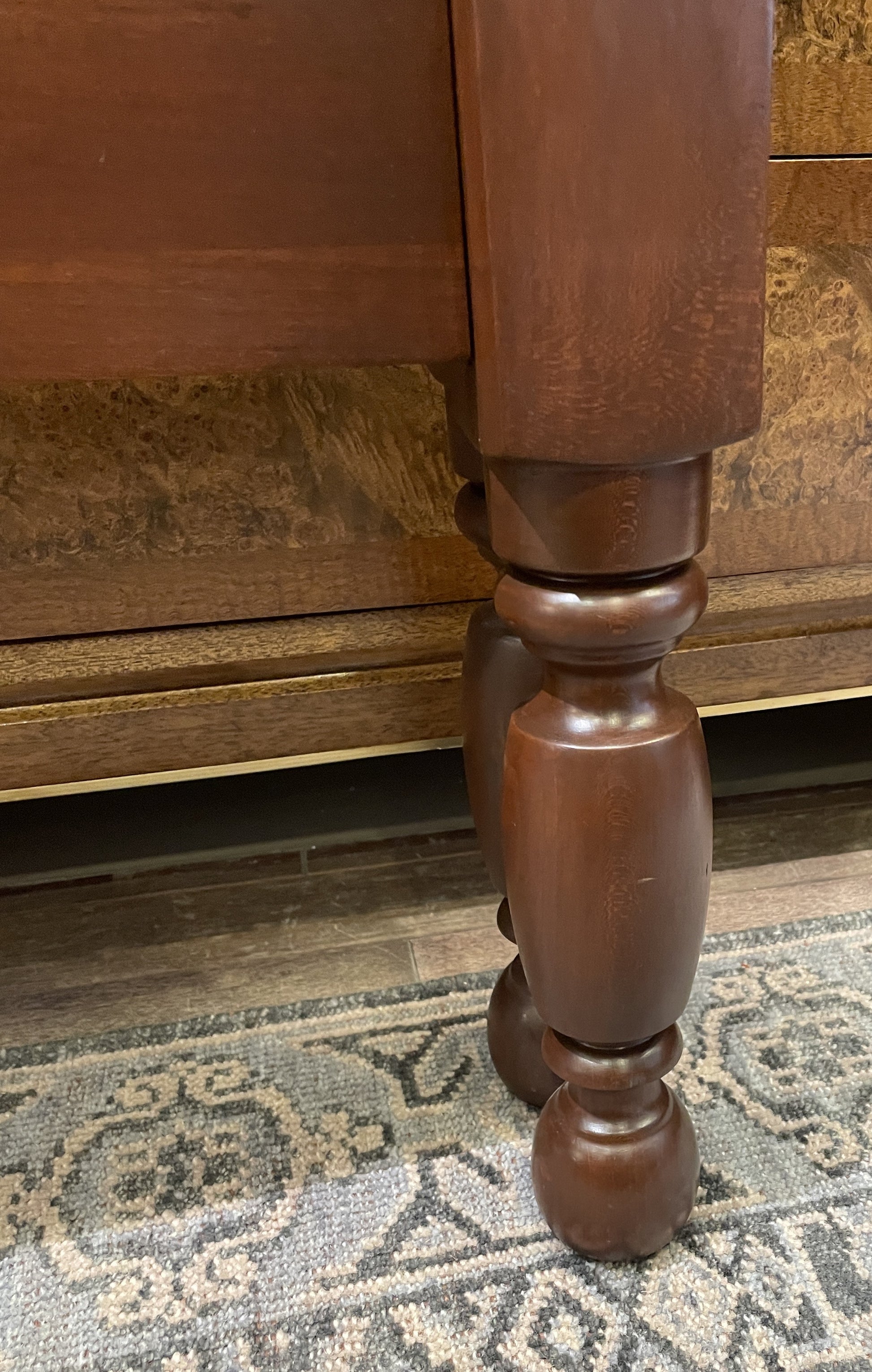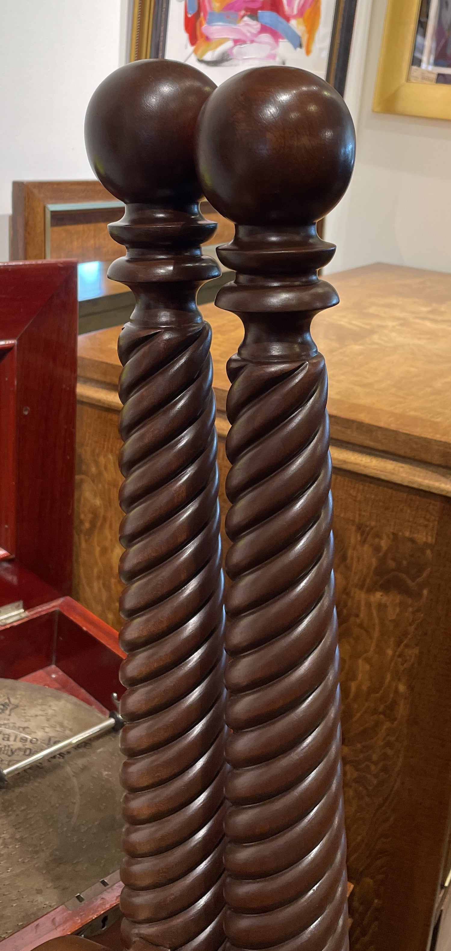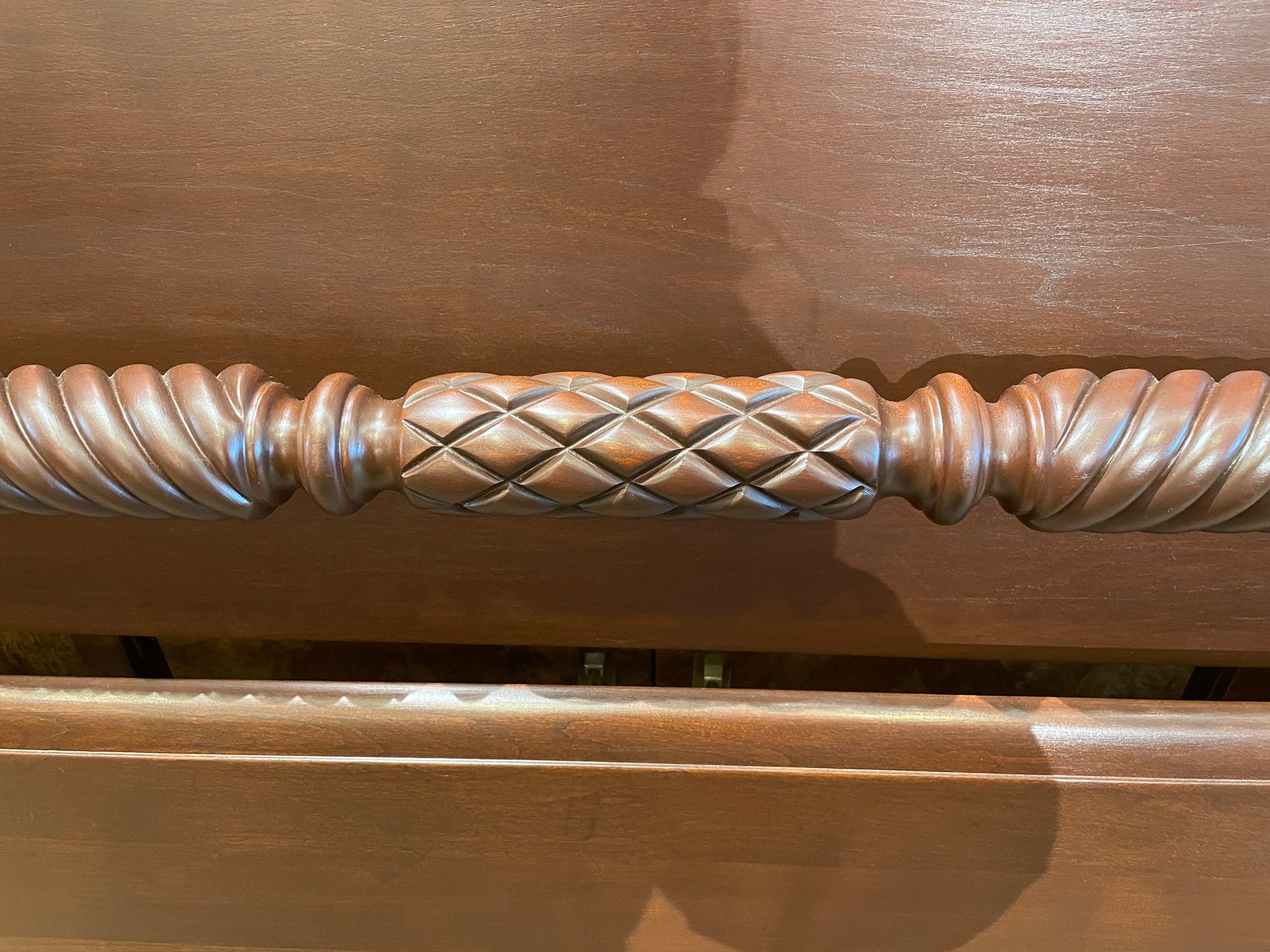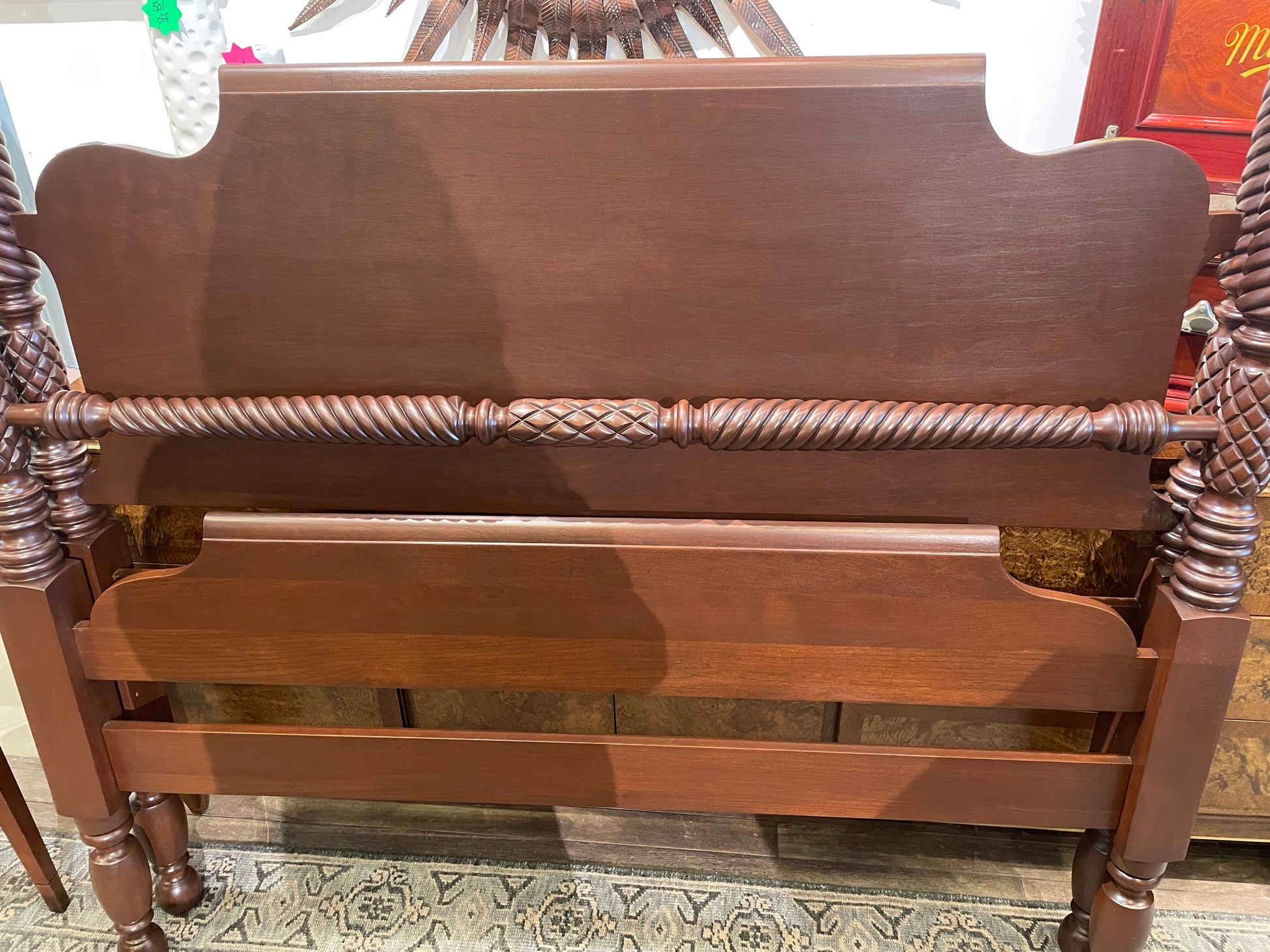 American Empire Revival full bed. This beautiful medium toned wood piece has beautiful carved details on its posts that include spiral and crisscross designs. The frame sits atop ball shaped feet that are topped with turned details. A beautiful full size bed with an empire revival flare.