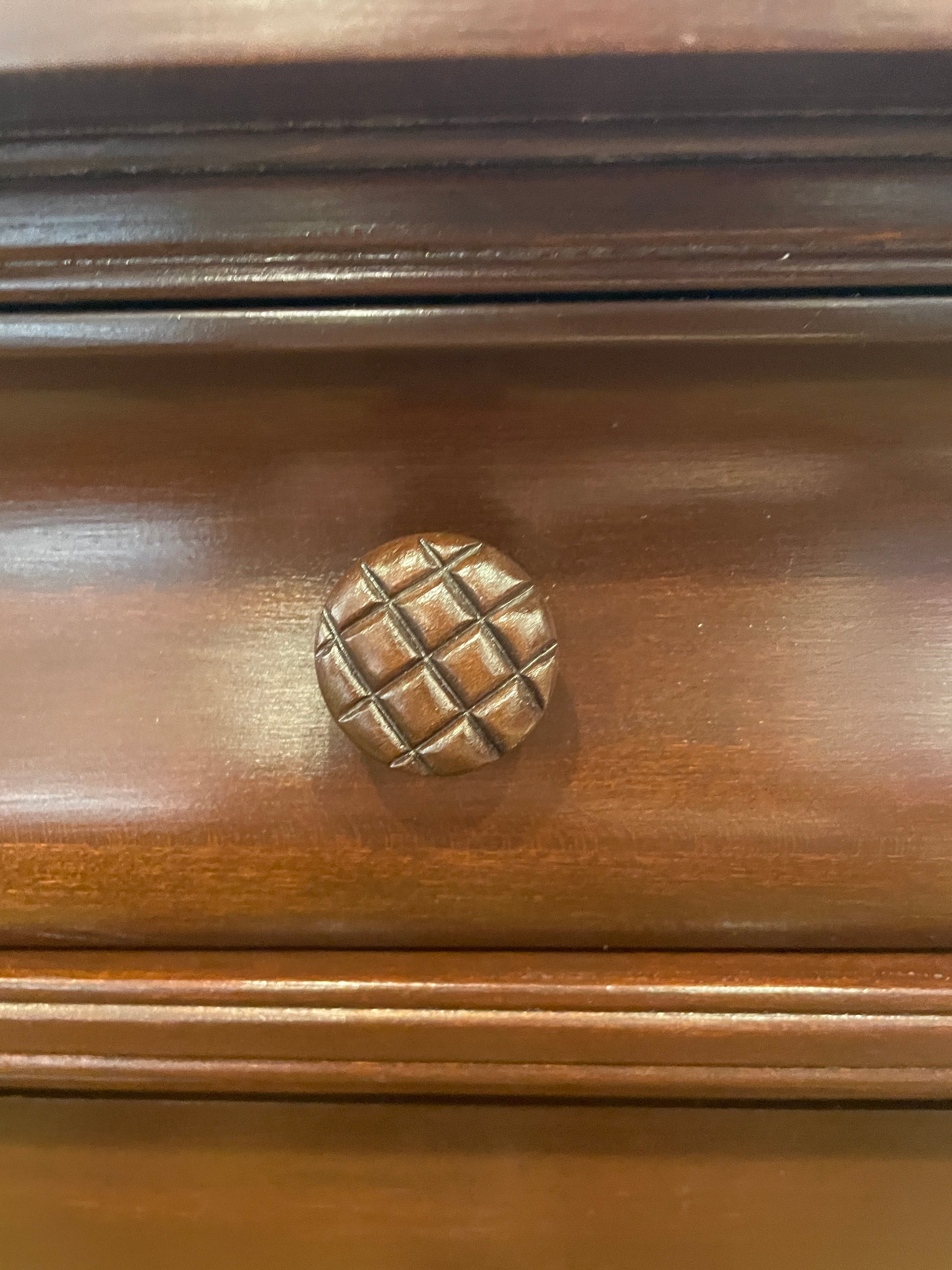 American Empire Revival vanity with mirror. This beautiful medium toned wood piece features seven drawers in varying sizes. The lower four drawers are all the same size and have one pull knob each. The upper three are arranged with two smaller drawers each with one pull knob, and one larger one in the center with two knobs. The knobs have a crisscross pattern carved into them which gives this piece a unique pop of texture. The sides of this piece are accented with carved leg details that include spirals and a similar crisscross pattern to match the knobs. The legs are held up by cylindrical feet. This piece also includes a mirror with a slightly rounded top. It mounts to the base of this piece and has carved details similar to the rest of the piece. This elegant and timeless vanity is sure to elevate any space and would match nicely in an Empire style home.