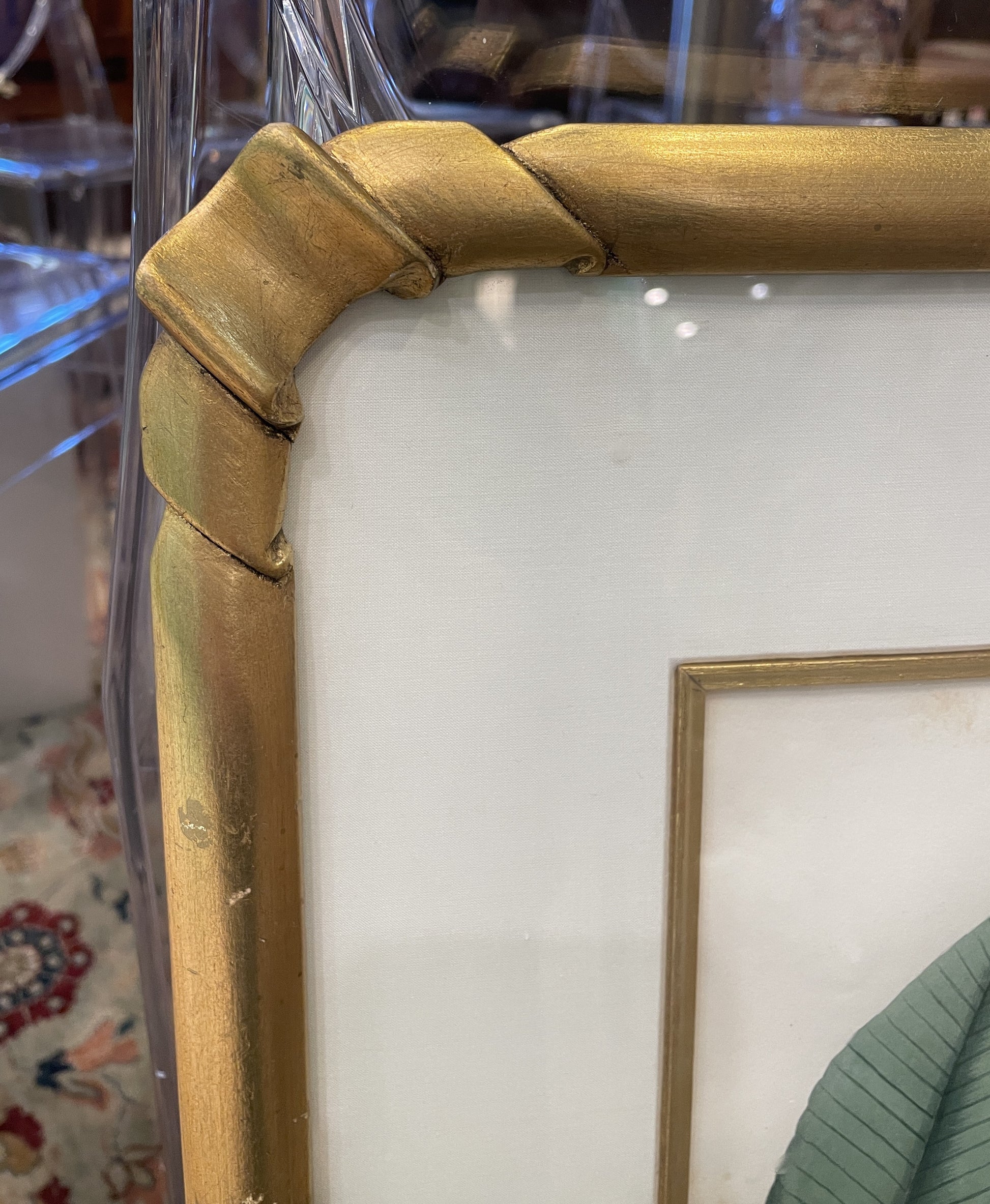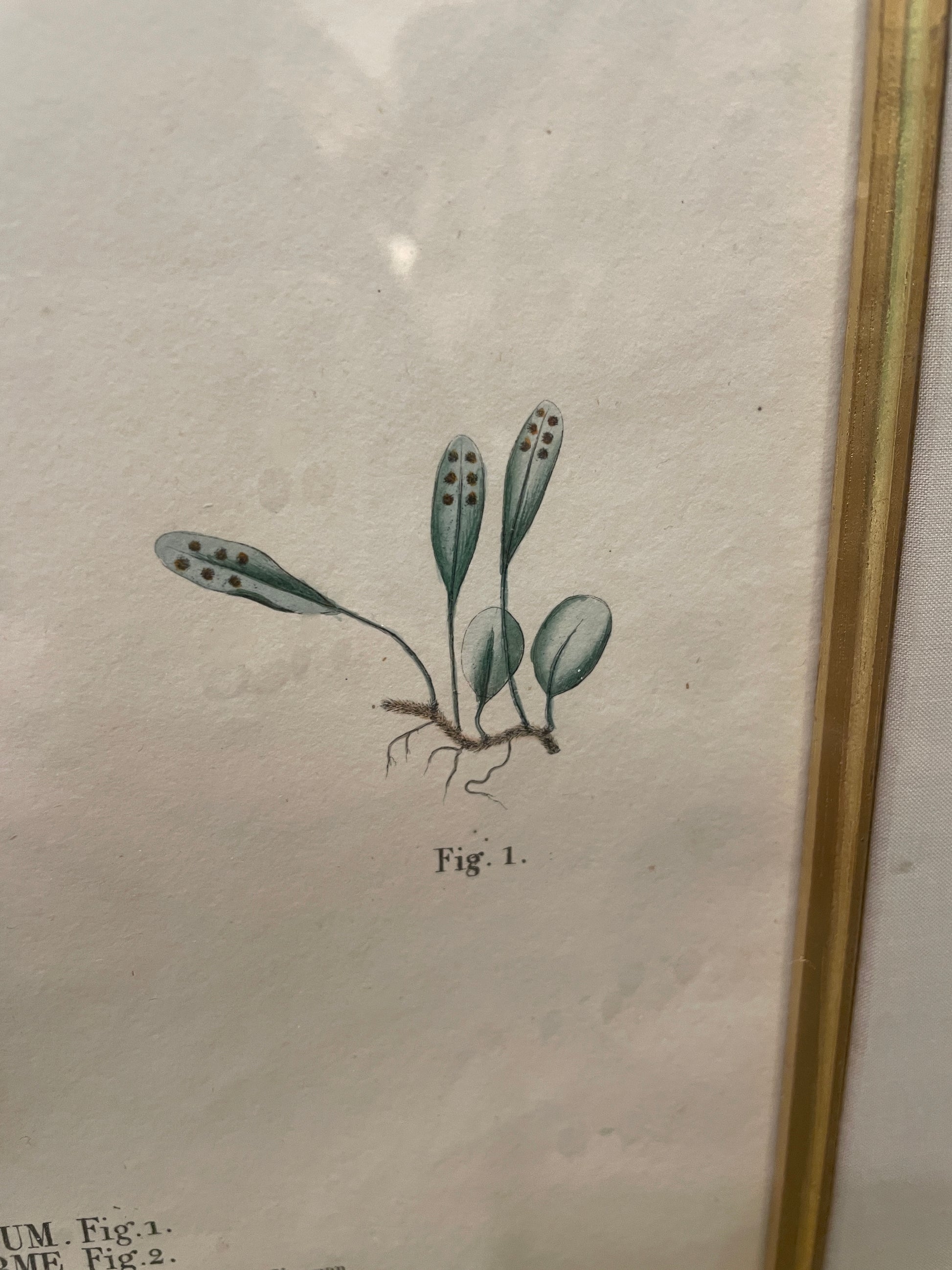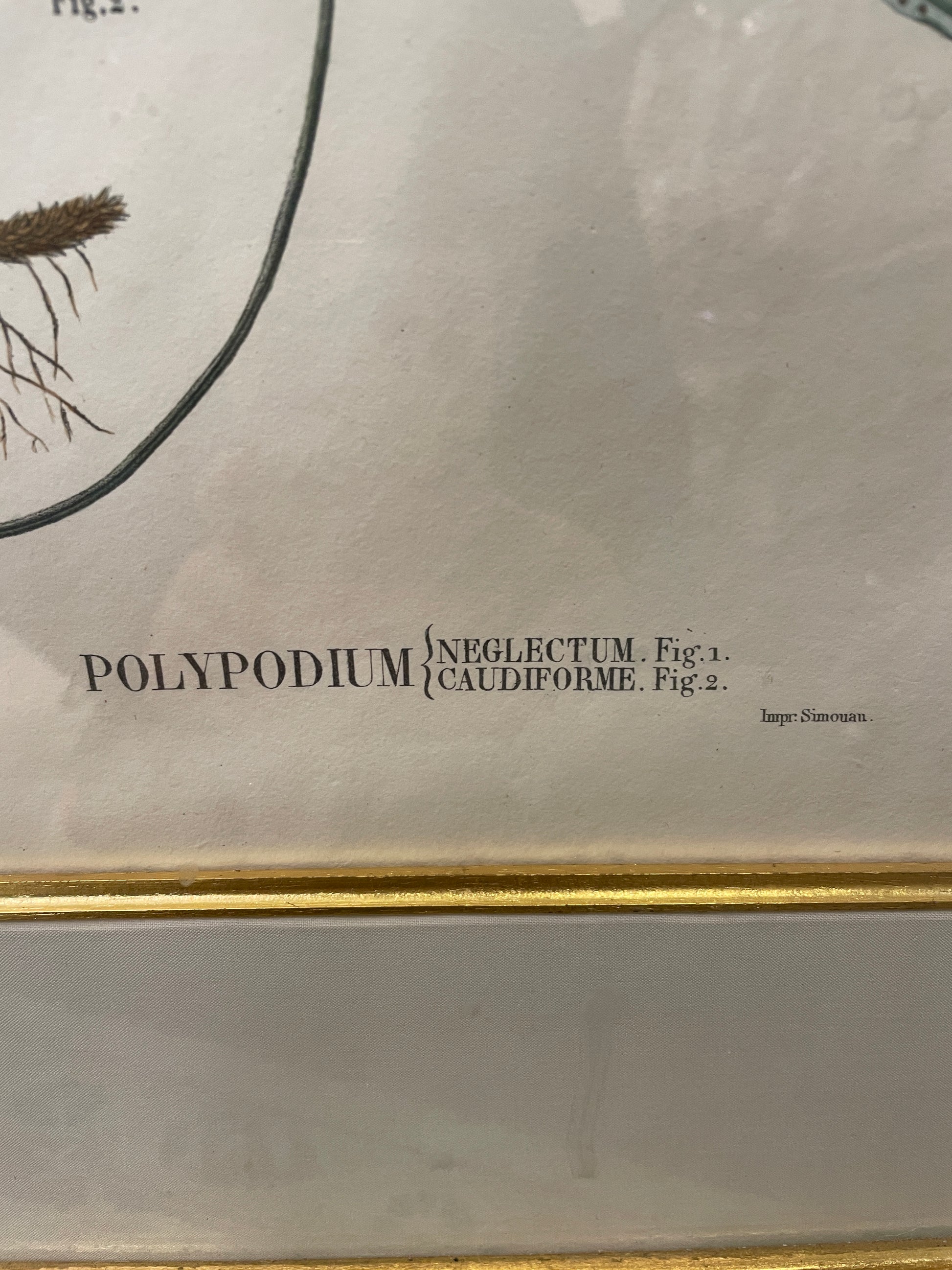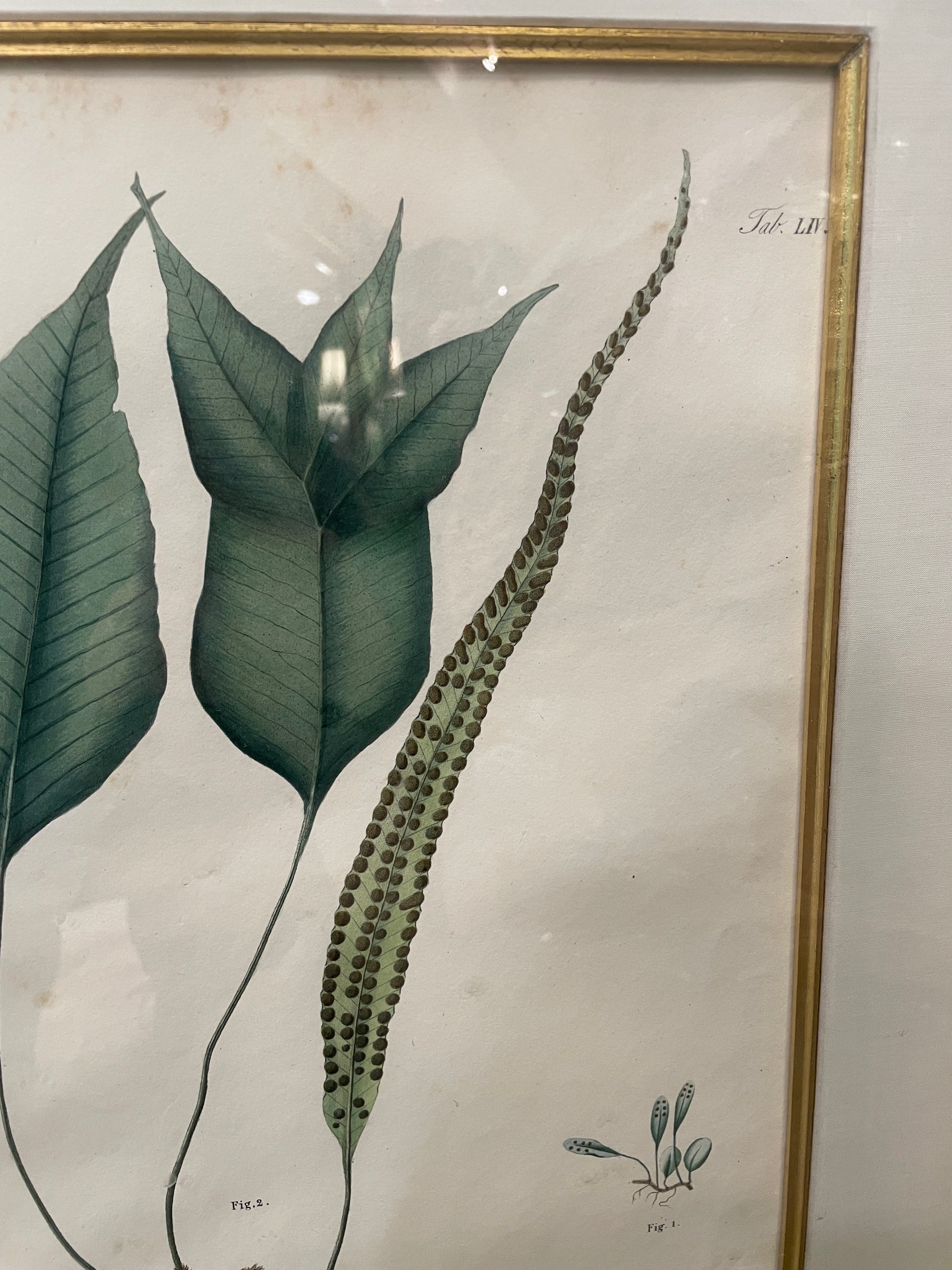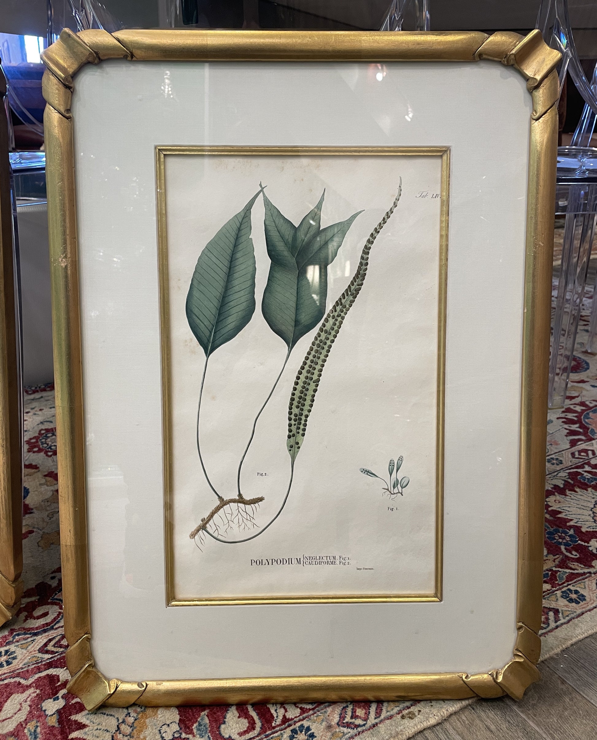 Antique botanical print of Polypodium Neglectum and Polypodium Caudiforme, framed and hand colored. This beautiful print depicts two different species of fern. The print has been hand colored. It is an antique piece that is sure to elevate a space with charm that only comes from age. It is set on a white mat with a gold inner border, and held in a gold frame with ribbon-like details on the corners. A beautiful botanical diagram that's the perfect blend of science and art.