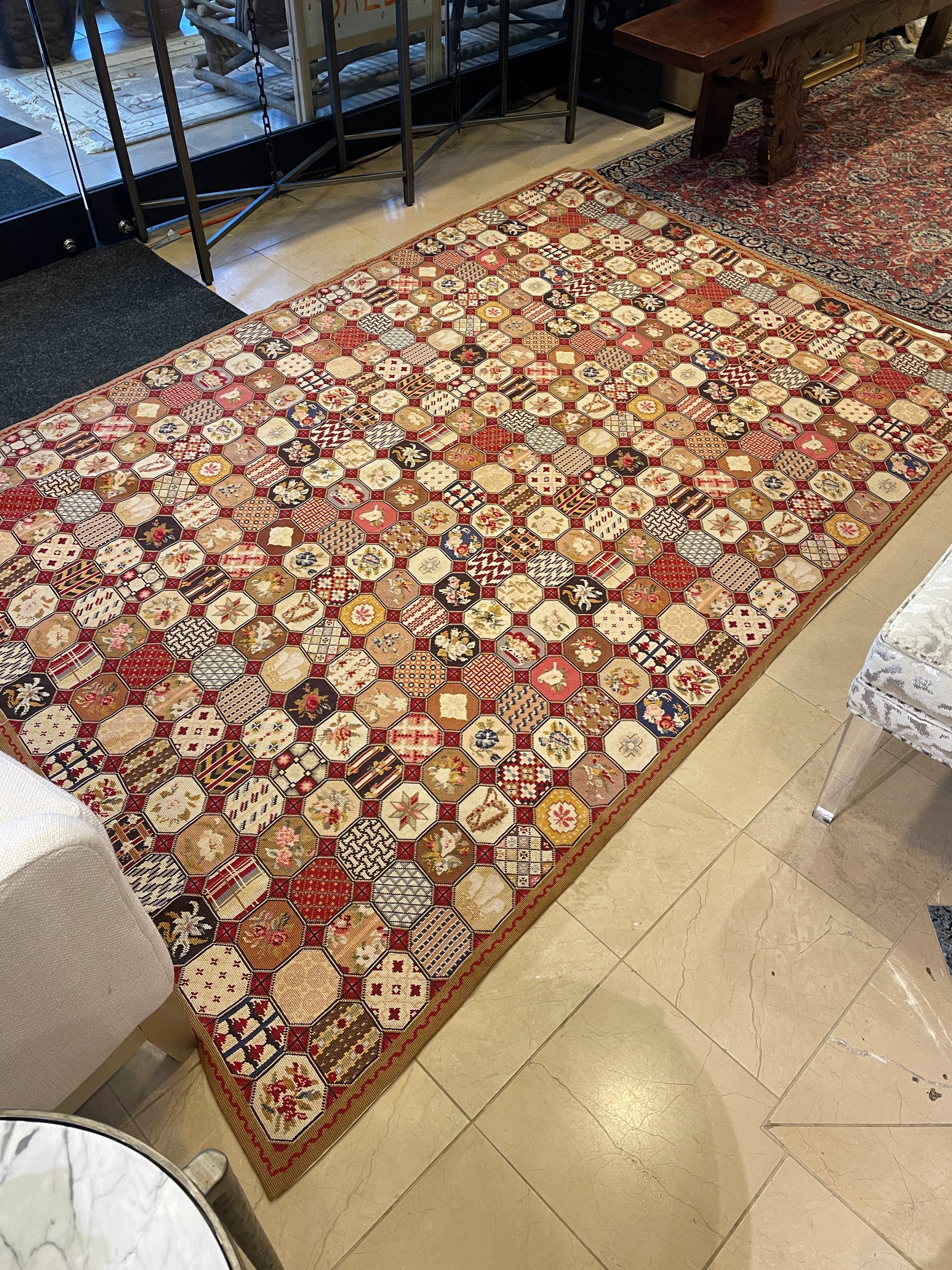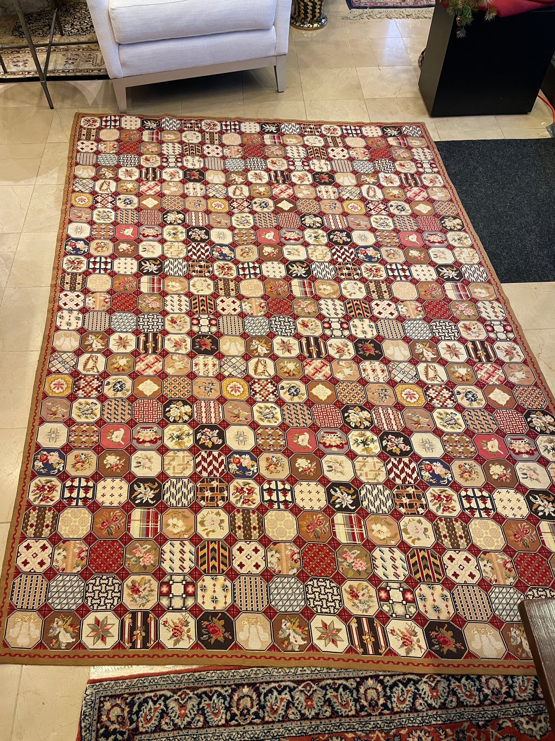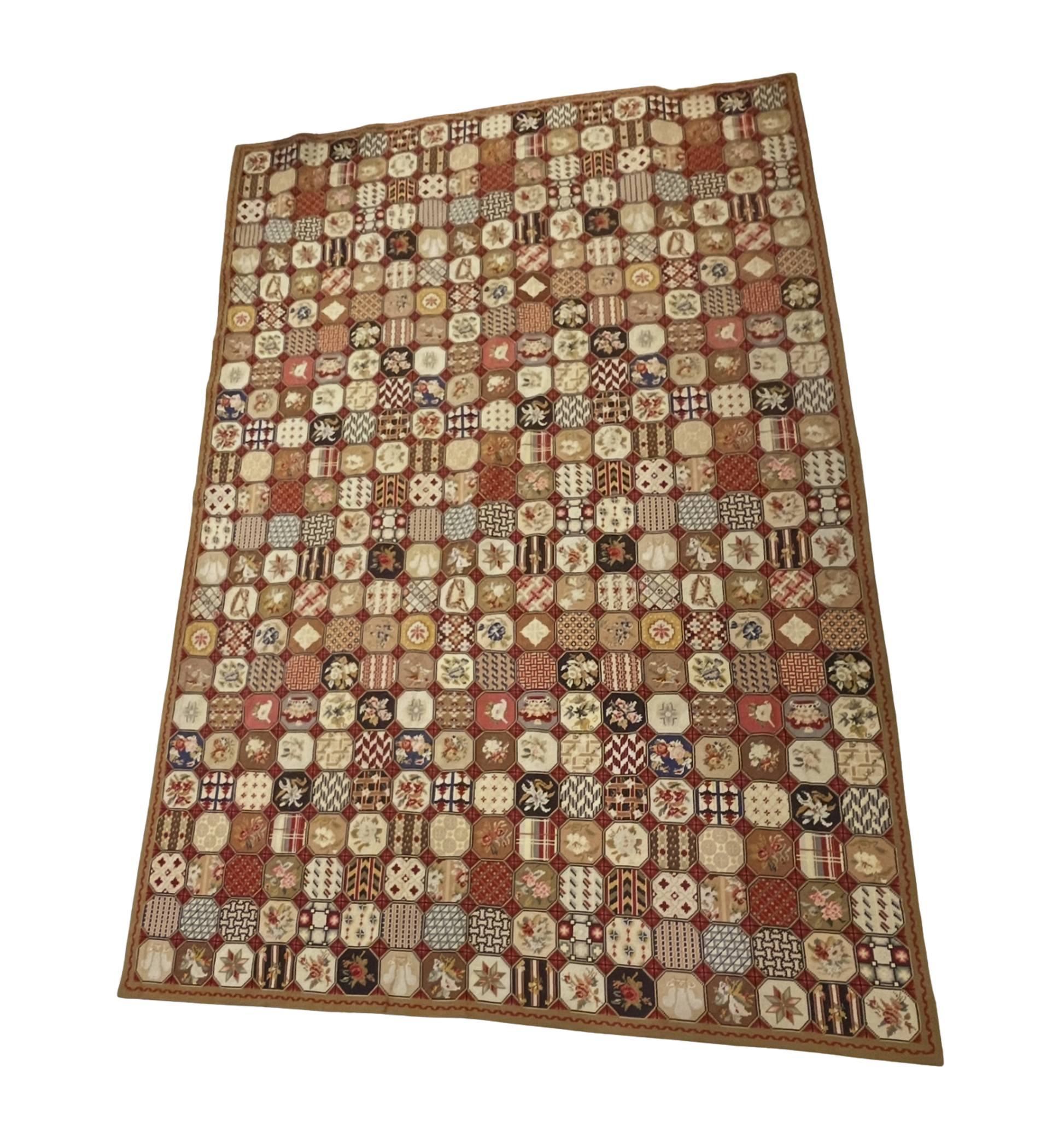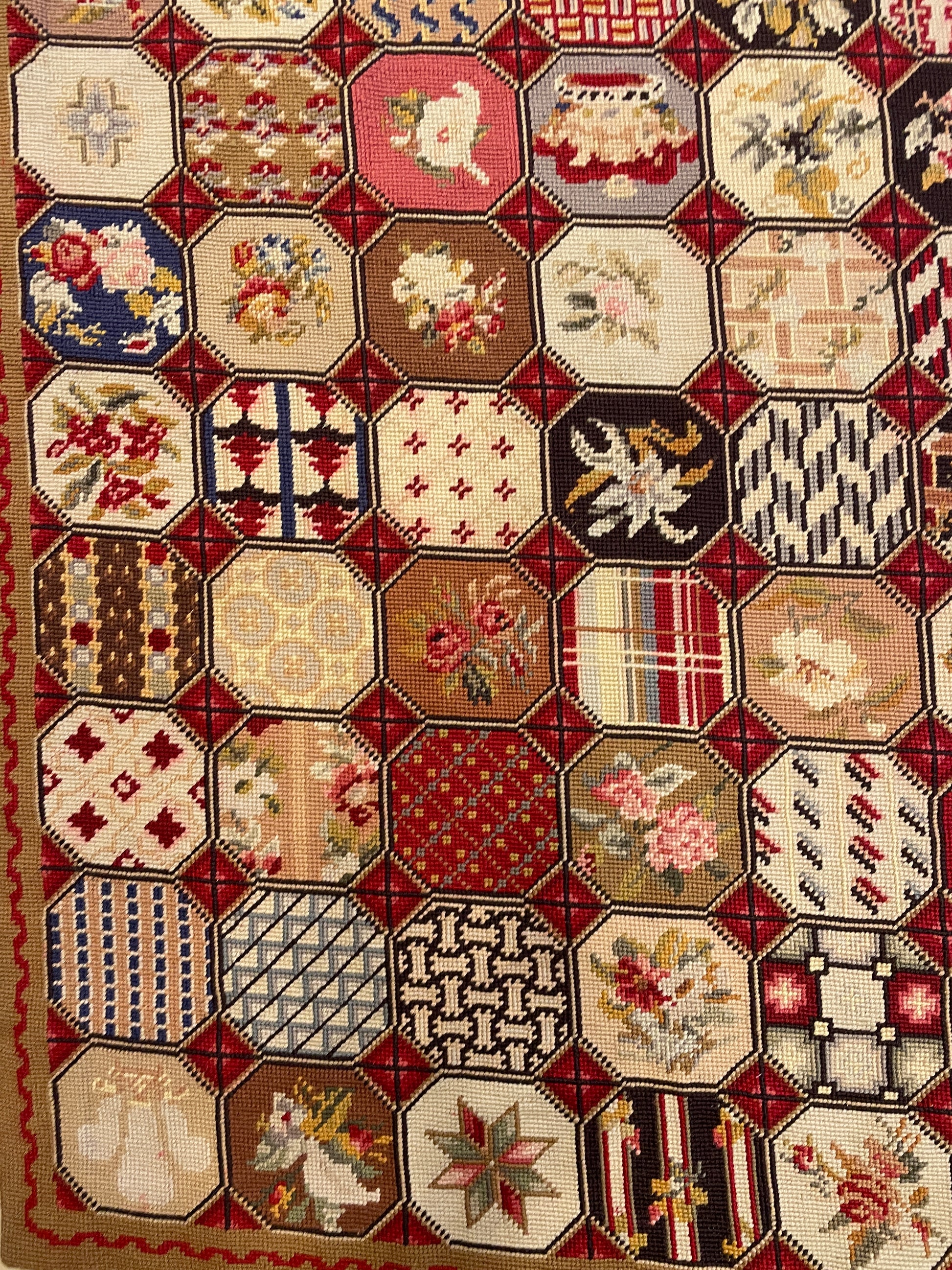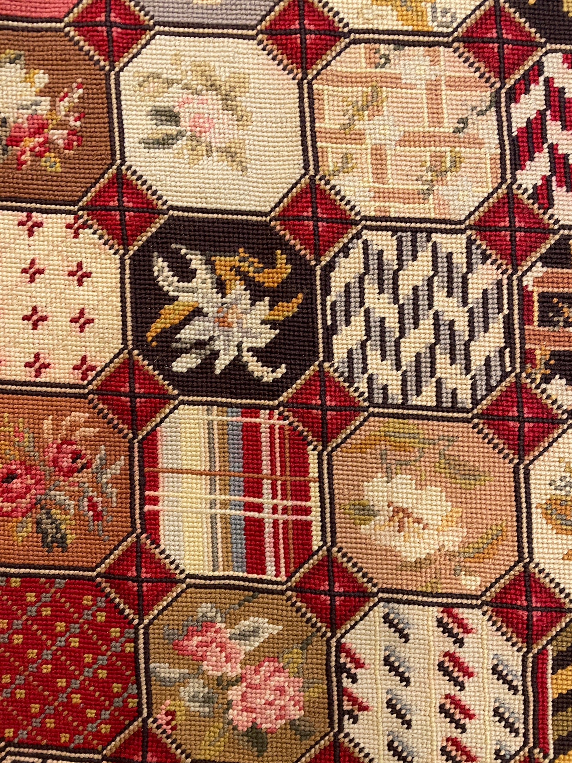 Antique British Isles Needlepoint Rug with Crown, Plume and Harp. This gorgeous needlepoint rug consists of various detailed tiles arranged in a grid. Each tile design repeats multiple times, notably including details of flowers, a crown, a harp, and a plume along with patterned sections. The rug is mainly red in color with pops of cream, black, green, and blue. The outer edge of the rug has a thin brown border with a subtle red detail in its center. A beautiful rug full of detail and charm.