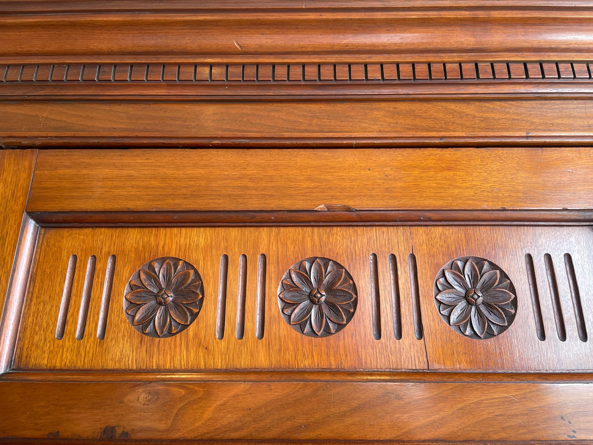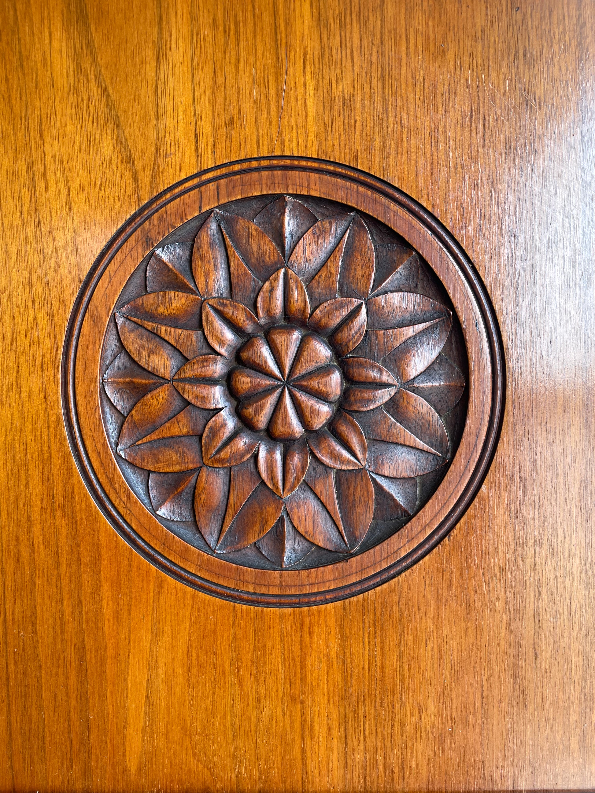 Antique early 20th century compactum wardrobe with center mirror. This gorgeous wardrobe is constructed from stunning medium-toned walnut wood. The piece is rectangular in shape with charming crown molding details at its top. It features a three door design, and the center door is mirrored. Each door is accented with carved details, and the side doors have brass pull handles for easy opening. The center door has three small carved floral medallions on its upper edge, and the two side doors have a larger medallion. The inside of the wardrobe is divided into two sections. The left door has a large open compartment with coat hangers at its top, and the other two doors conceal a series of drawers. The upper portion holds three slide-out drawers for convenient open storage. The lower portion has five traditional drawers with brass handles that sit flush against the wood. This stunning wardrobe is a timeless and functional antique piece perfect to elevate a bedroom or kitchen.