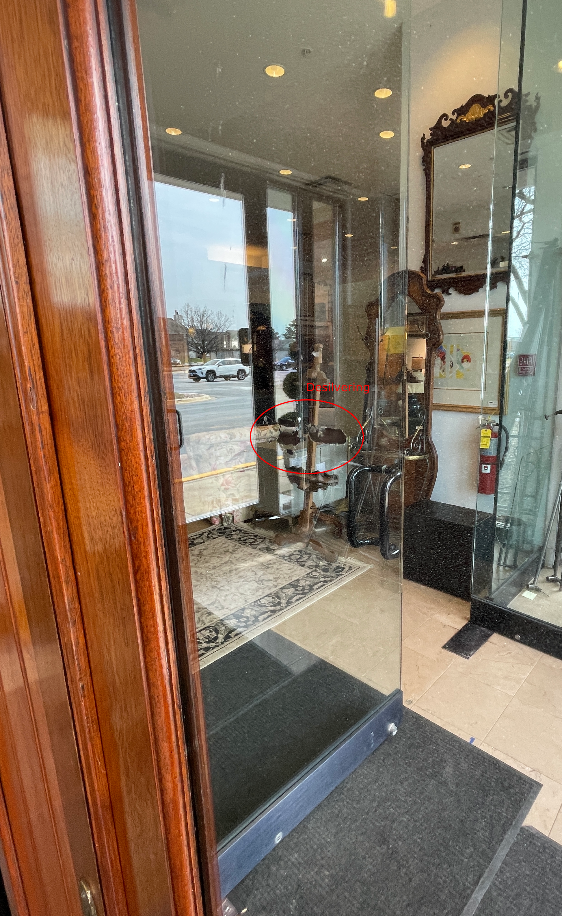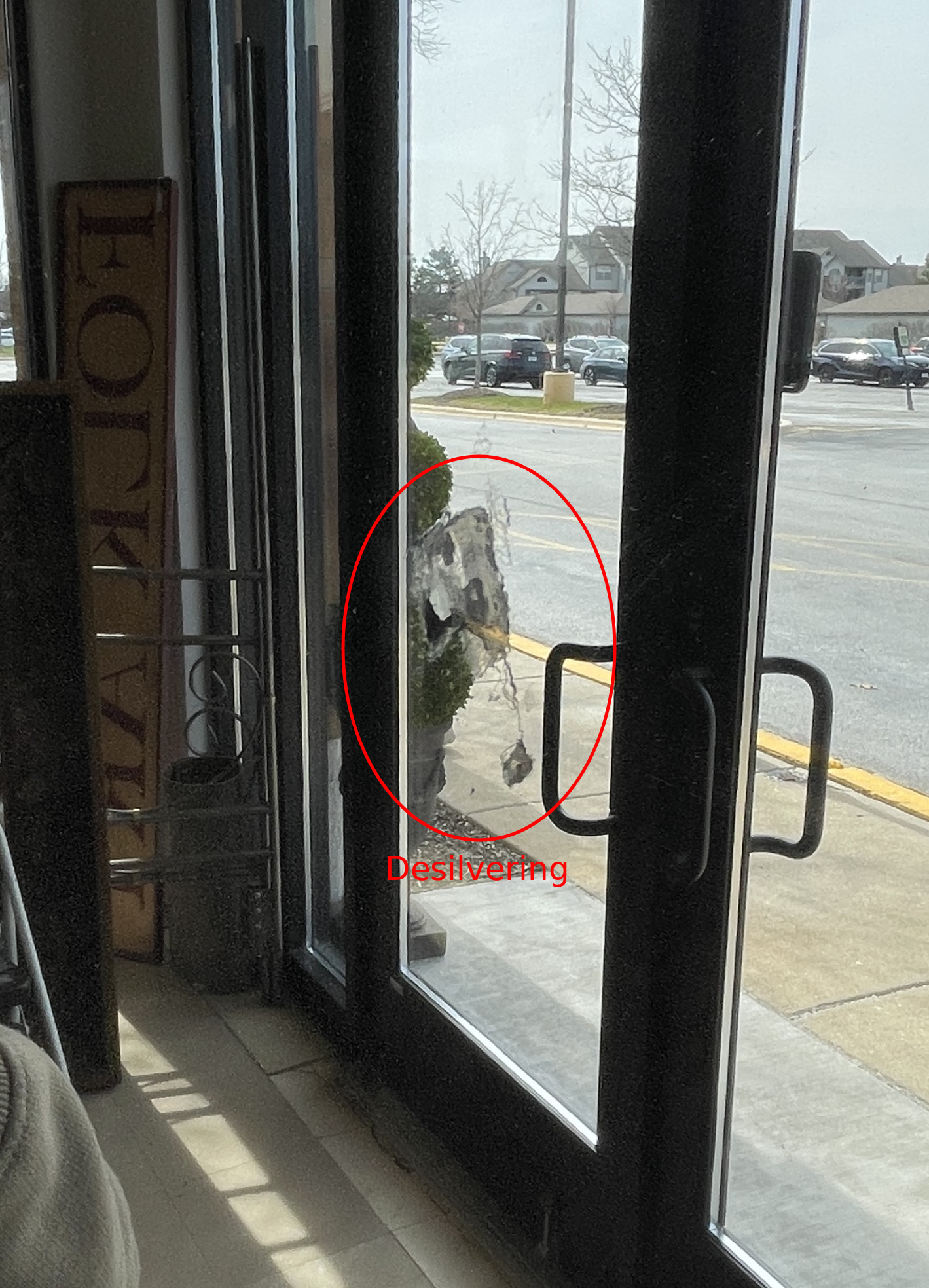 This item is sold in AS IS condition. The mirror has some de-silvering spots, and is splitting on the back. Please see photos for details.