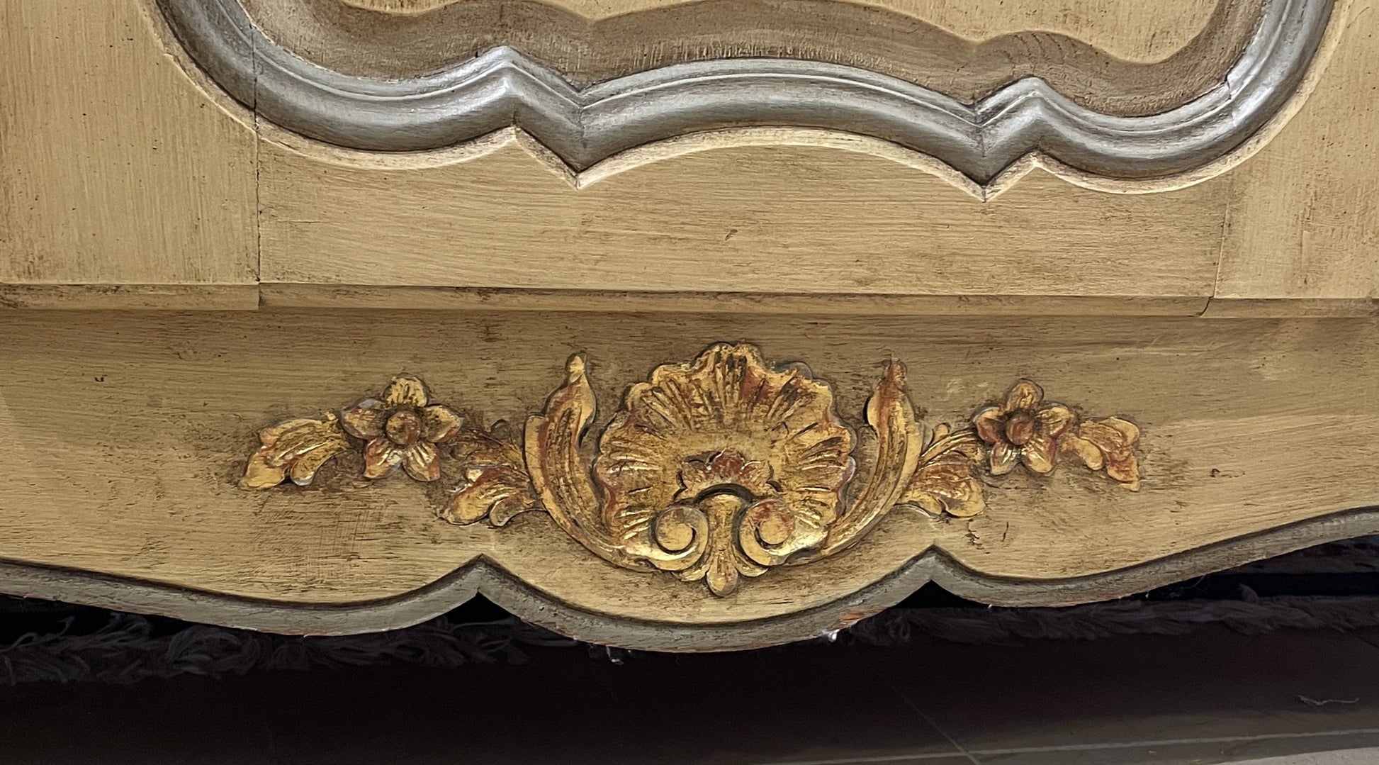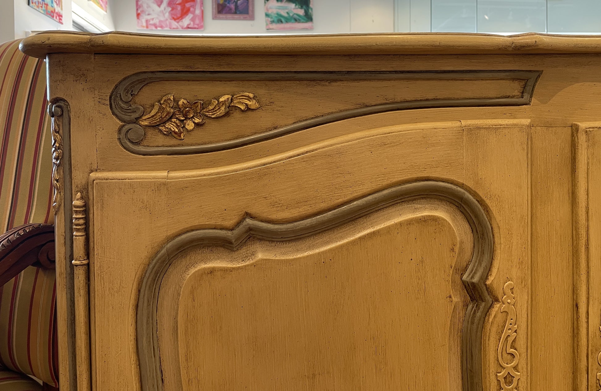 Antique faux painted buffet. This beautiful painted wood piece features three cabinet doors that open with a key. Within the light gray interior, a large shelf stretches across the length of the piece, and the center upper compartment has a small drawer. The exterior is painted a light beige color with gold and light gray accents. The doors have a slightly curved top, and carved panel details in the same light gray as the interior accent the piece further. Gold details adorn this piece on the cabriole legs, corners, and lower center. A beautiful buffet with tasteful details and lots of charm.
