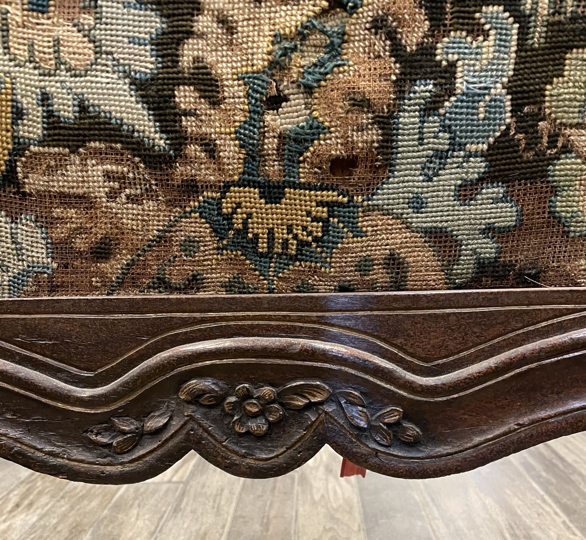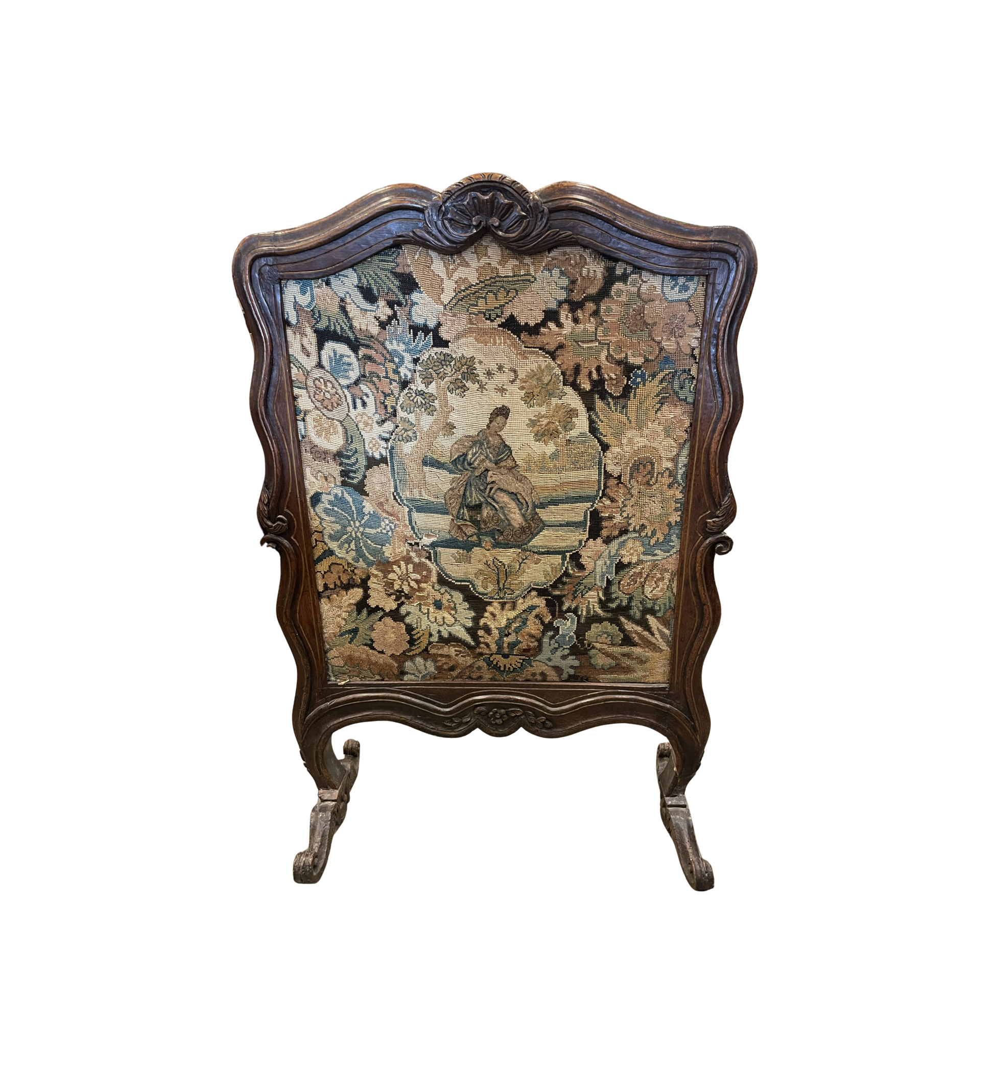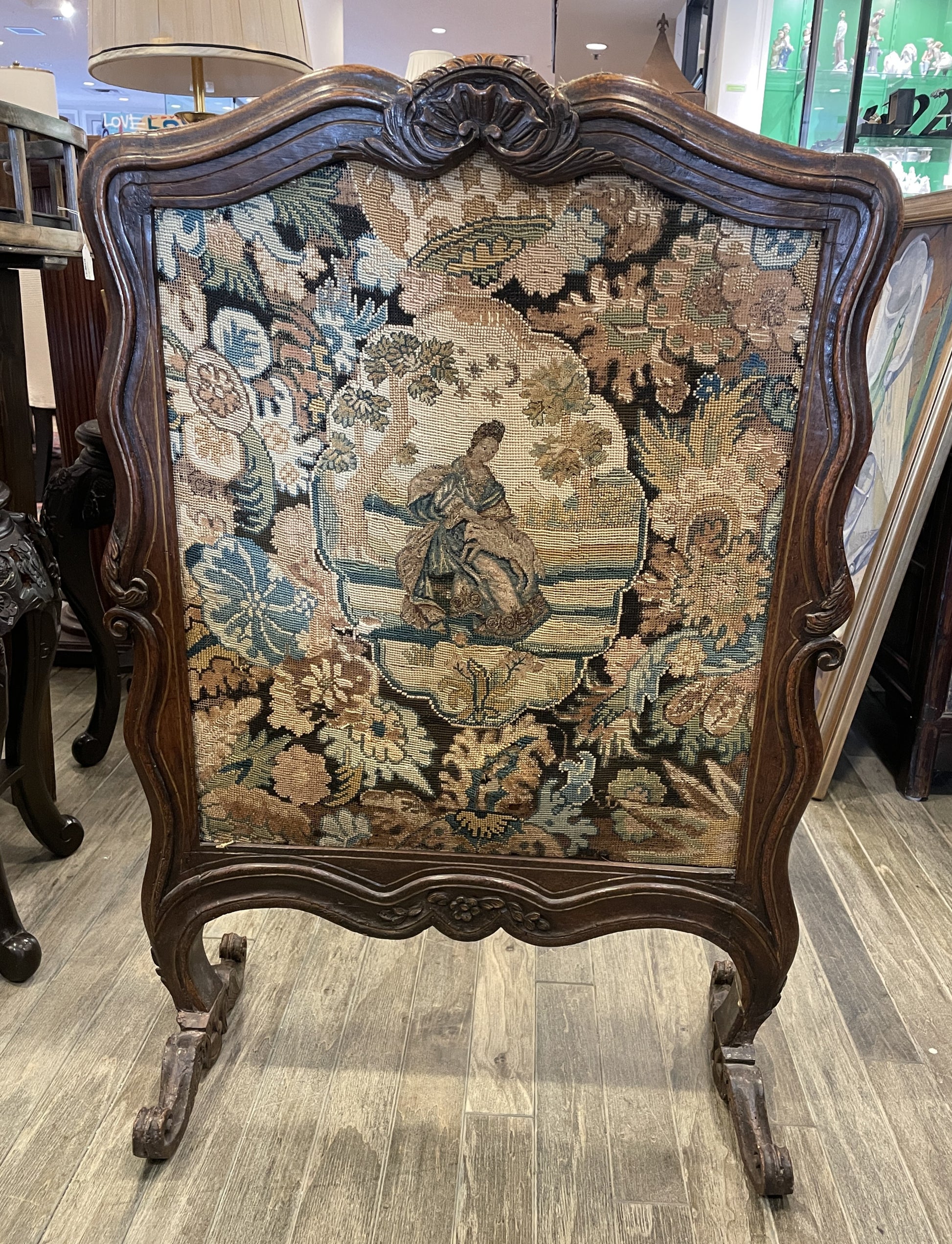 Antique fireplace screen with needlepoint insert. This stunning fireplace screen features a dark toned wooden frame, and intricate needlepoint insert. The frame sits on two opposing legs with scrolled feet. The border of the frame is carved with floral details and swirling shapes. The insert of this piece depicts a woman sitting with a lamb on a serene night. The scene is surrounded with gorgeous floral designs. The needlepoint is done in neutral tones with pops of blue green hues. The piece has a pleated, salmon colored back. This screen, known as a cheval horse screen was used to cover a fireplace when not in use during the warmer months. The ornate details and artistry were used to add extra decorative flare to a space that would otherwise be wasted when too warm for a lit fireplace. A beautiful decorative piece of art and history that's sure to add a classy antique feel to a space.
