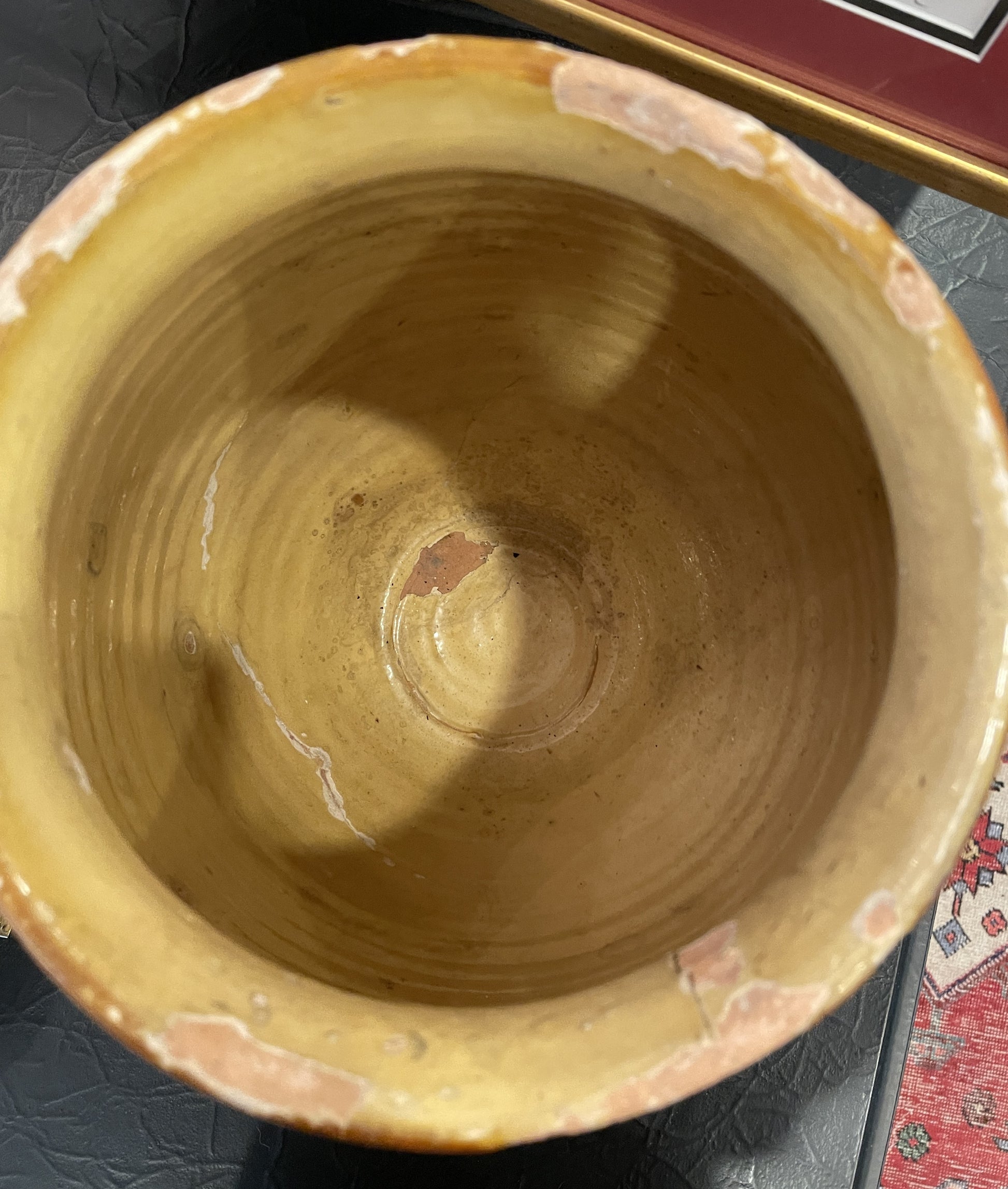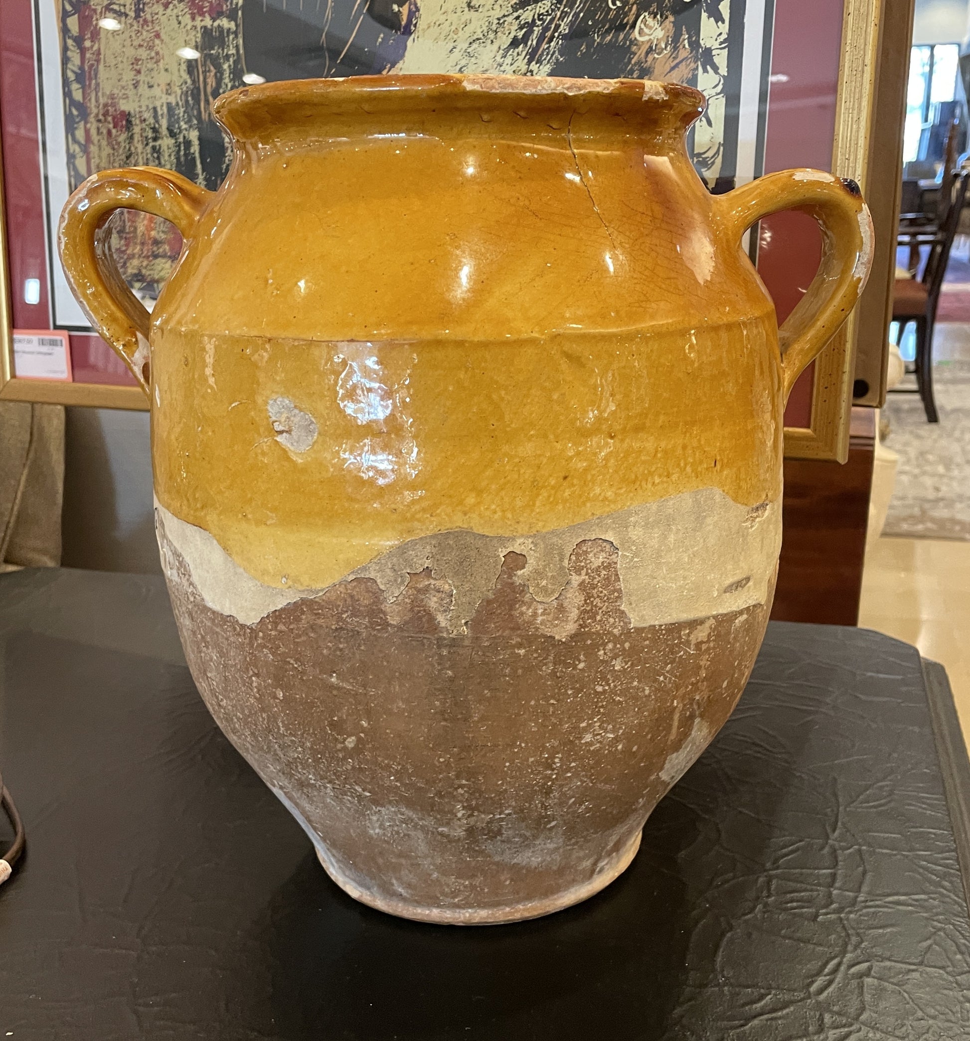 This beautiful confit jar features a mustard yellow glaze on its upper half. It sits on a narrow base that dramatically tapers outwards as it reaches the midsection of the piece. Two handles accent the sides of the jar. The antiquity of this piece can especially be seen in the patina of the glaze that has aged beautifully, as well as the distressed portions that have developed over decades of time. An engaging conversation piece that's sure to bring that antique charm to a space.