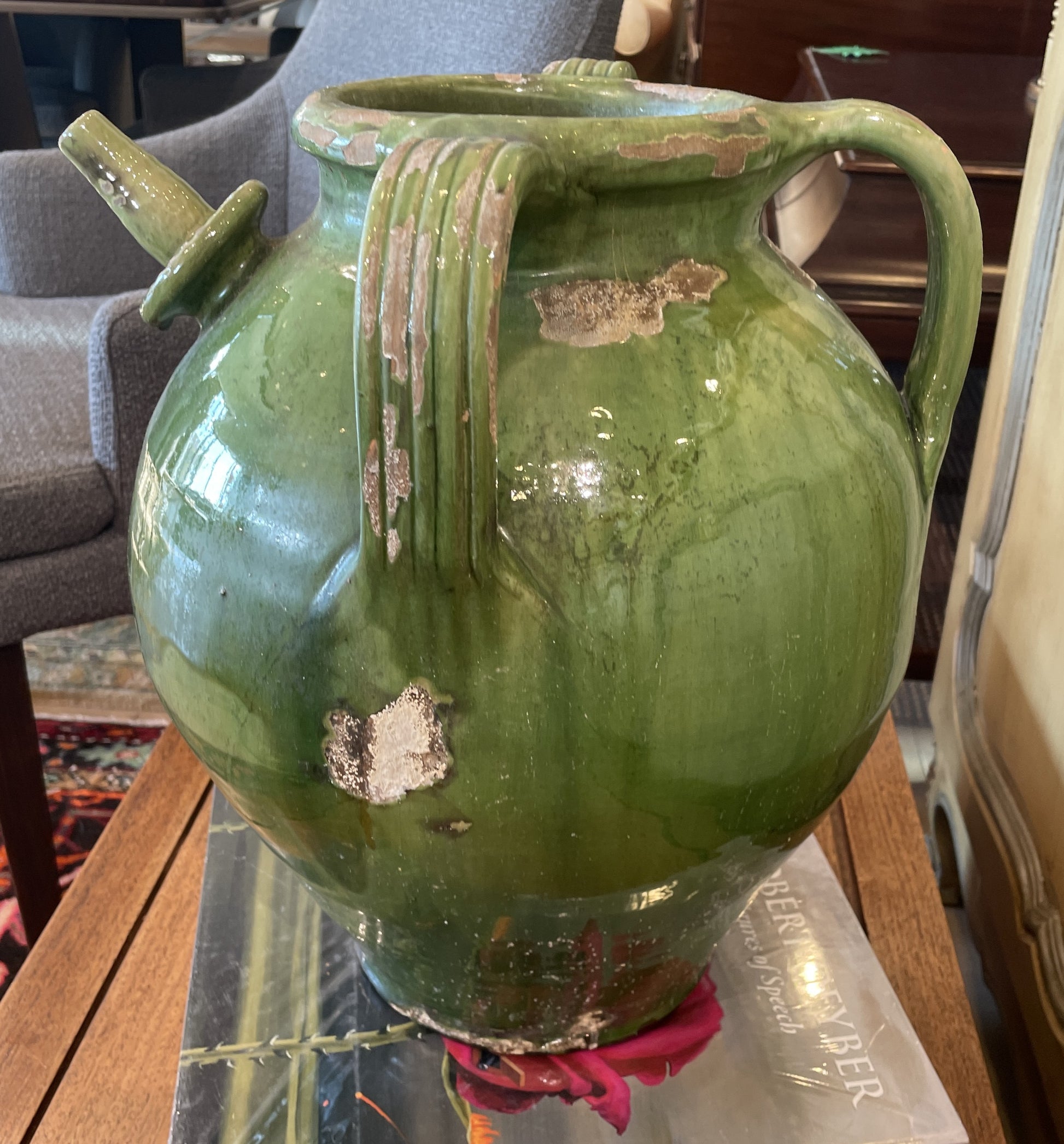 Antique French oil pot with emerald green glaze. This beautiful piece was historically used to store nut and olive oils. The pot features three handles. One handle opposite the spout would have been used to tilt the pot forward for ease of pouring. The other two handles on either side of the pot would be used to lift and carry the piece. The pot has a stunning patinated green glaze that emphasizes how much time has passed since its creation. Its distressed appearance is a testament to the antique status of this piece. A beautiful piece of history and art that would be a perfect statement piece for a setting with a rustic feel.