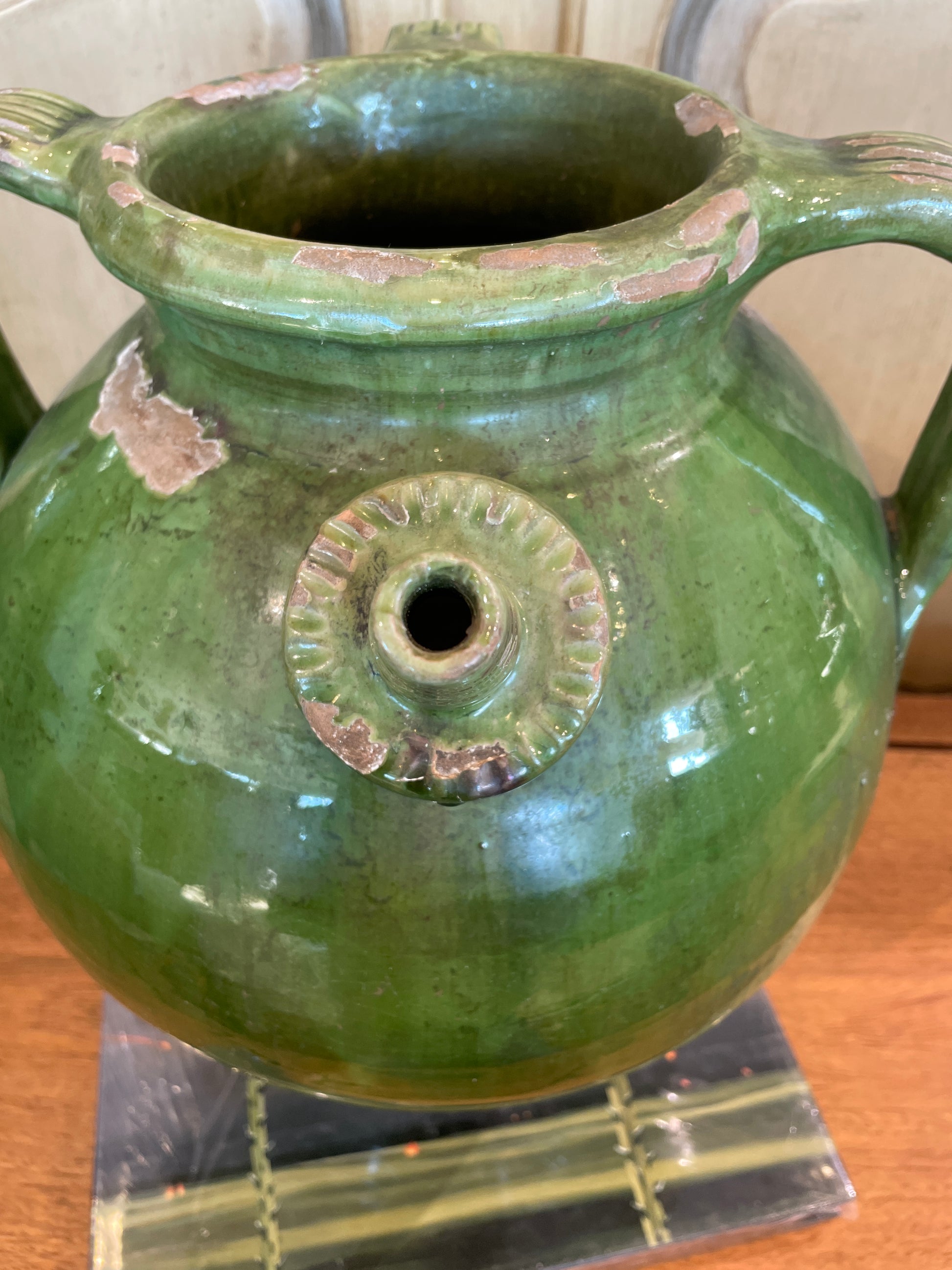 Antique French Oil Pot, Green Glaze with three Handles (0HP00N)