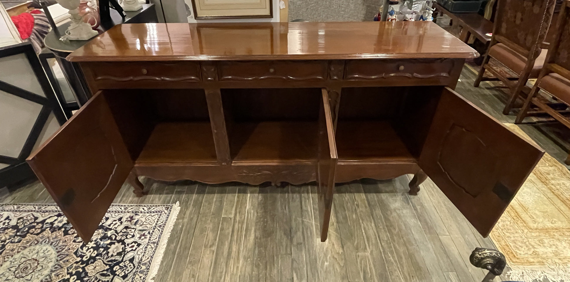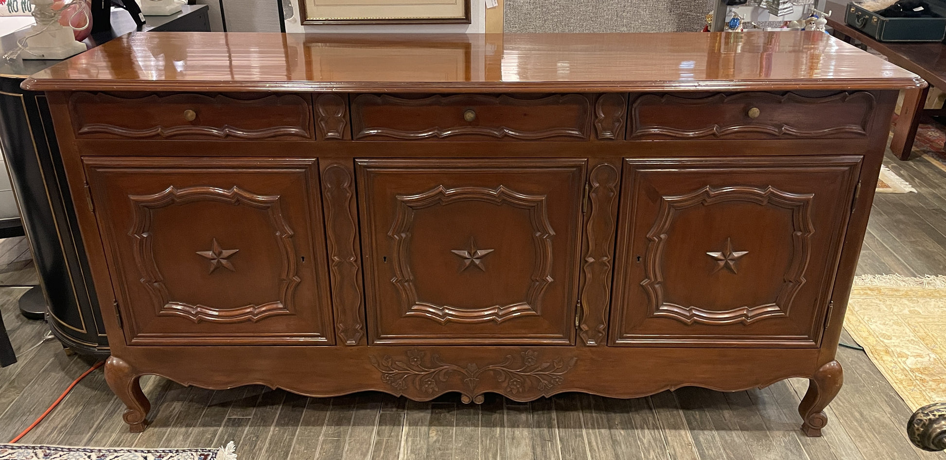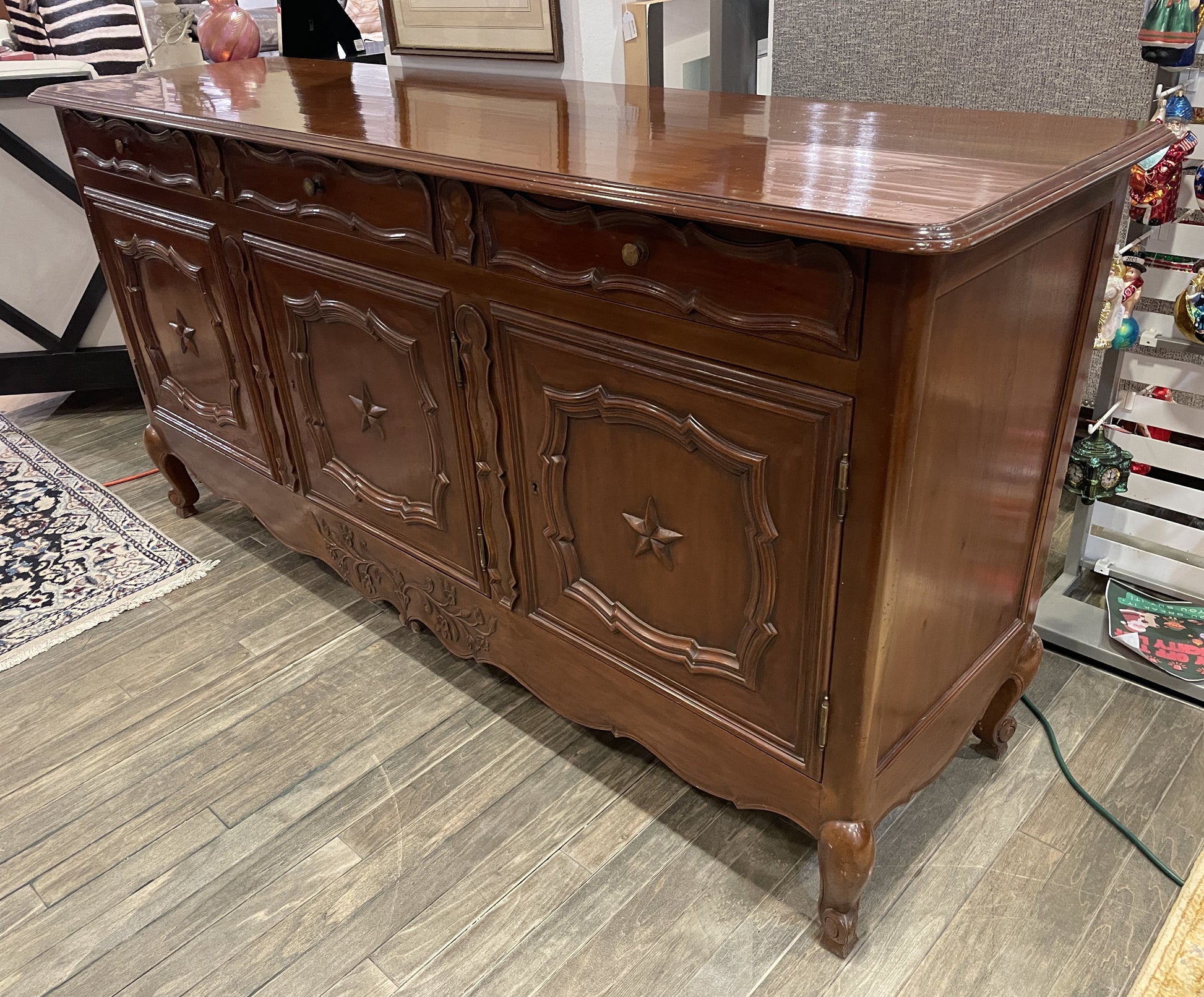 Antique French Provincial buffet. This stunning piece is crafted from gorgeous chocolate brown walnut wood. The piece features three drawers and three cabinets. Each drawer has one small brass pull knob, and each cabinet opens with a key. Each cabinet door is its own compartment. The cabinet doors have a raised panel design with a five point star in their center, and the rest of the piece includes similarly styled raised details. Notably, the swooping apron of the buffet has a raised floral design in its center. The piece sits on cabriole legs with scrolled details. This gorgeous antique piece has withstood the test of time and boasts beautiful timeless features that are sure to elevate any setting.