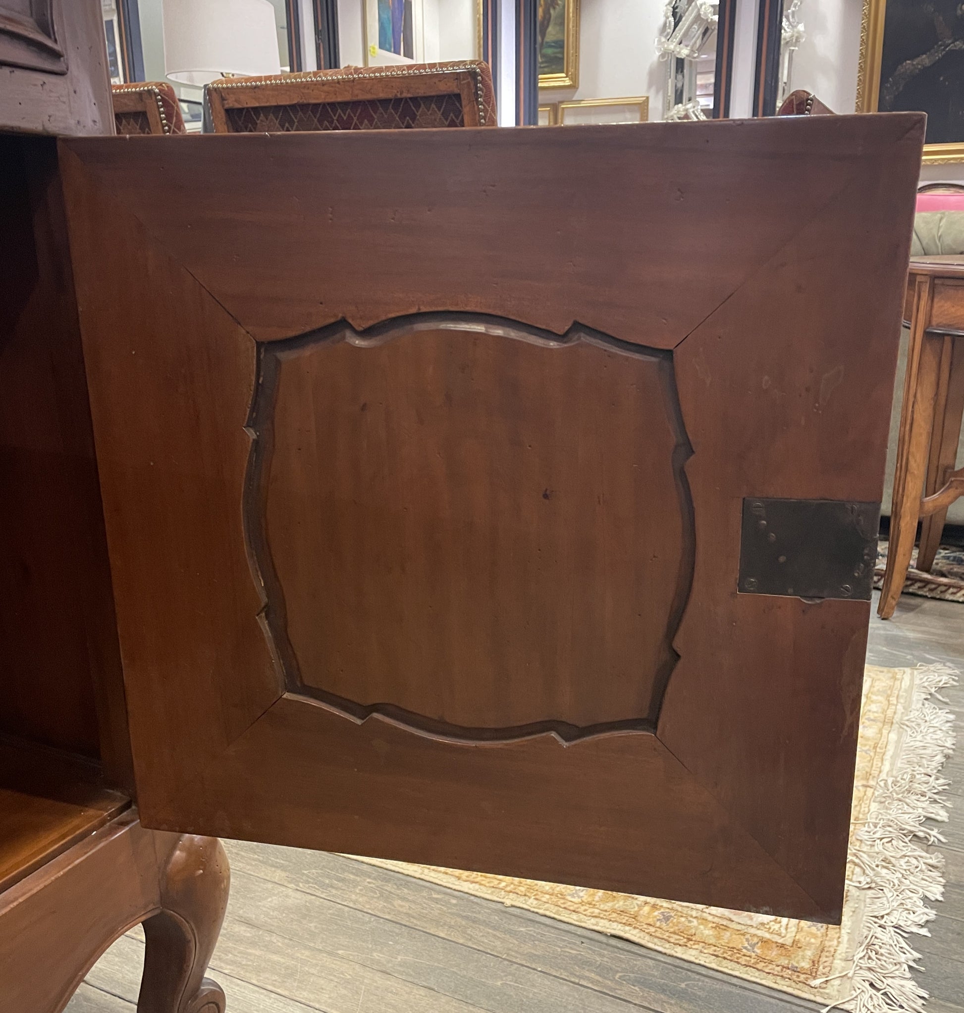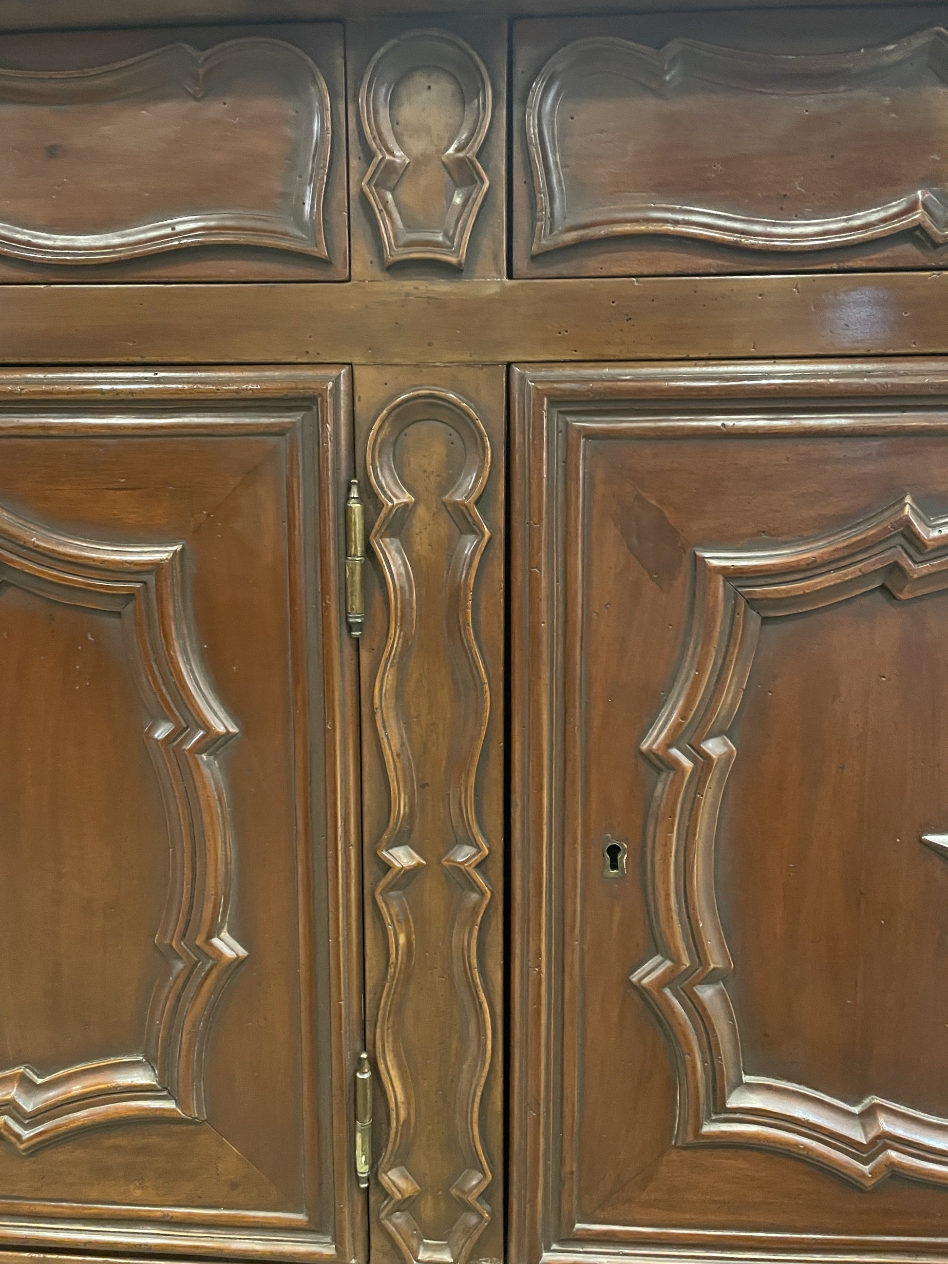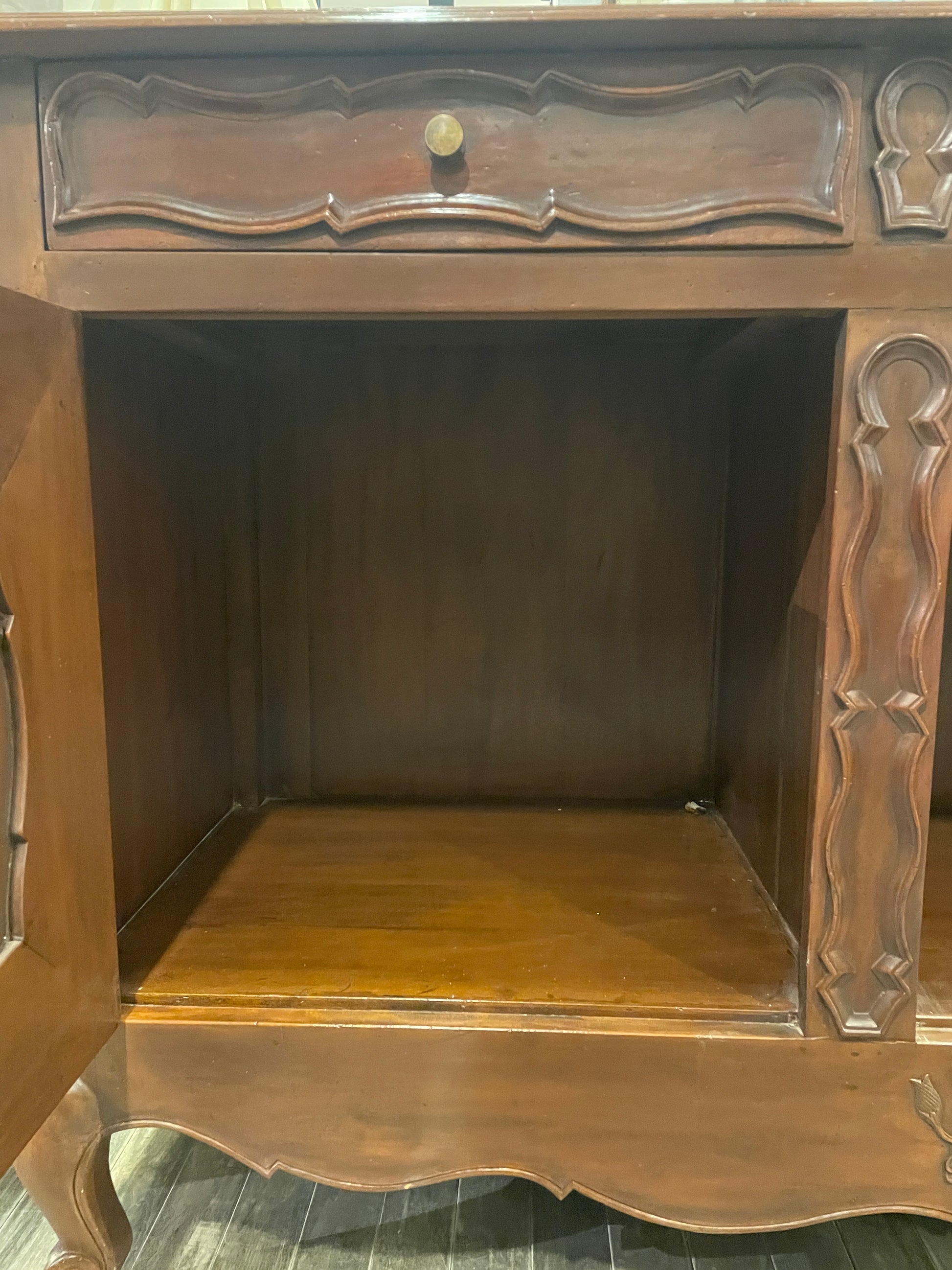 Antique French Provincial buffet. This stunning piece is crafted from gorgeous chocolate brown walnut wood. The piece features three drawers and three cabinets. Each drawer has one small brass pull knob, and each cabinet opens with a key. Each cabinet door is its own compartment. The cabinet doors have a raised panel design with a five point star in their center, and the rest of the piece includes similarly styled raised details. Notably, the swooping apron of the buffet has a raised floral design in its center. The piece sits on cabriole legs with scrolled details. This gorgeous antique piece has withstood the test of time and boasts beautiful timeless features that are sure to elevate any setting.