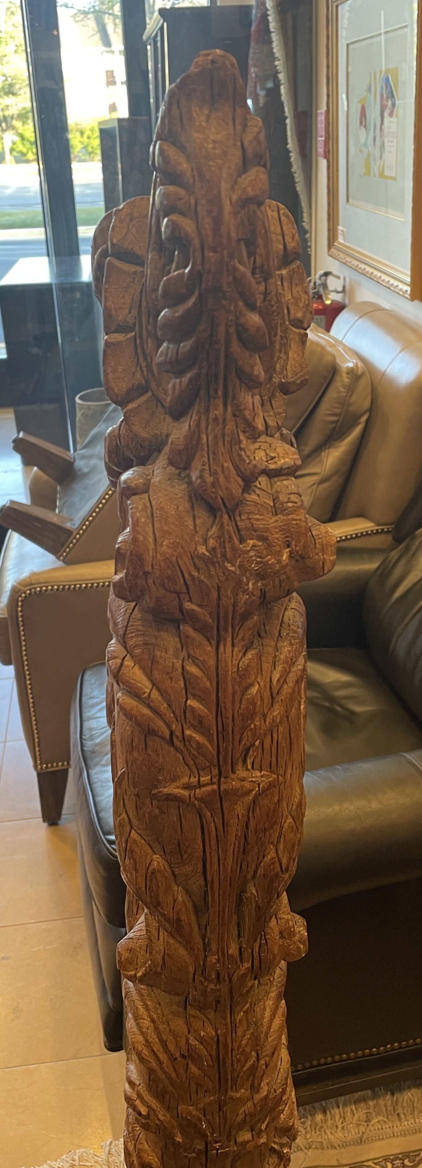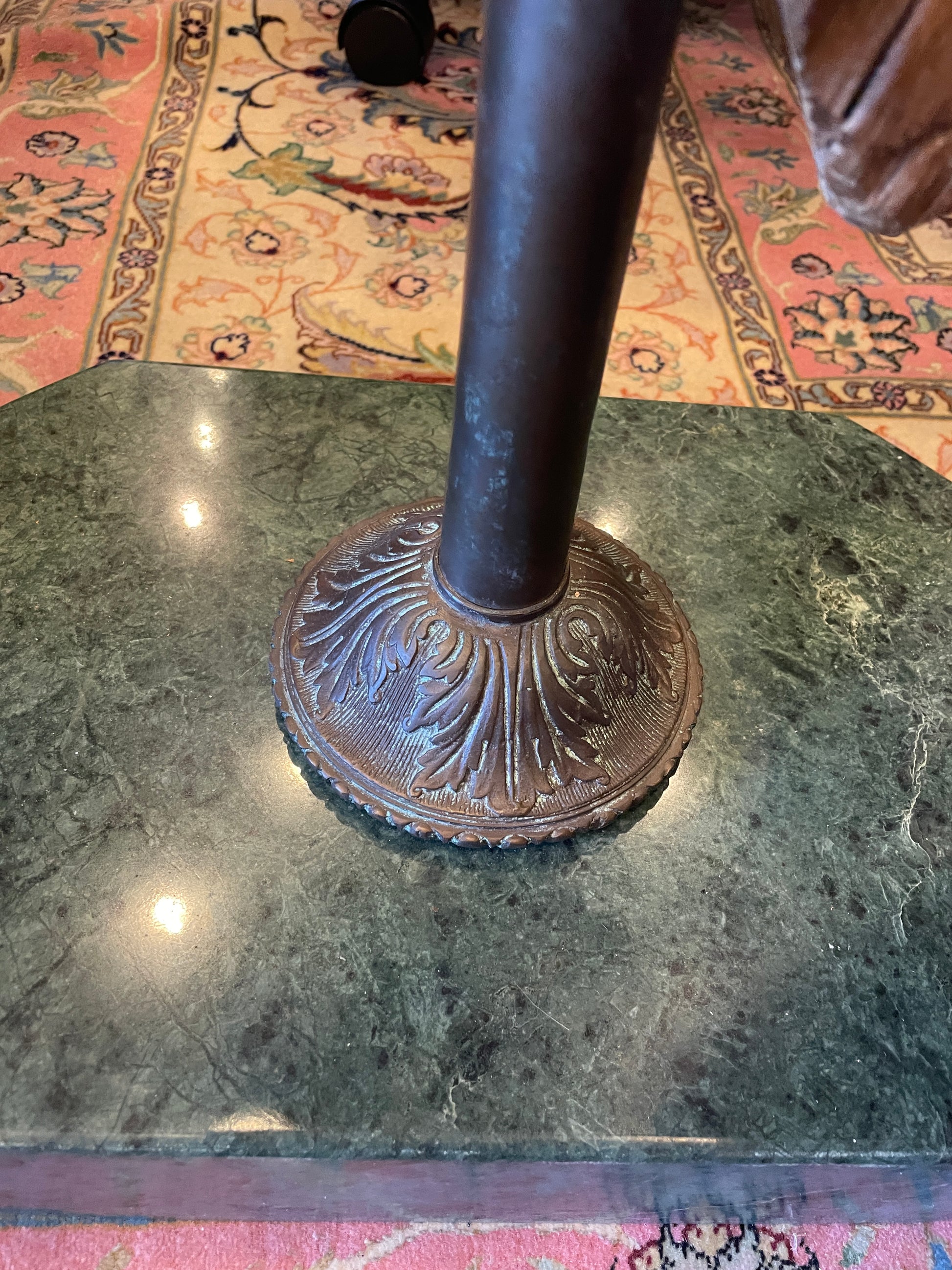Antique Indian bracket on marble base, 19th century. This beautiful carved wooden piece sits on a green marble stand. The stand is rectangular in shape with cut corners. The wooden portion of this piece has floral and organic swirling designs. A beautiful decorative item that's sure to elevate a space.