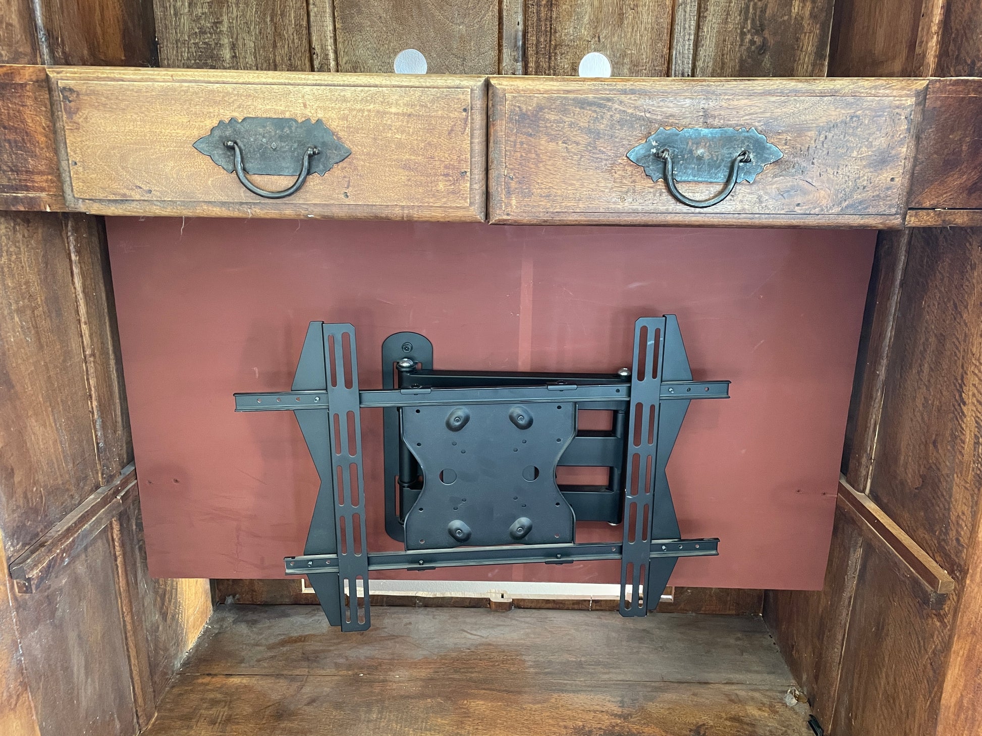 Antique Indian brass entry door pantry. This stunning cabinet is beautifully crafted from wood and brass. The two doors hold eight brass panels each. The brass panels all have the same design of two elephants surrounded with florals. The tall piece stands on a sturdy base, and has two extra drawer compartments just above that base. The hardware of this piece is a dark brown, almost black color that blends well with the dark toned wood and patinated brass. When opened, this cabinet reveals a shelf, two additional drawers, and a TV mount. A beautiful and unique piece that will add a vintage charm to any space.
