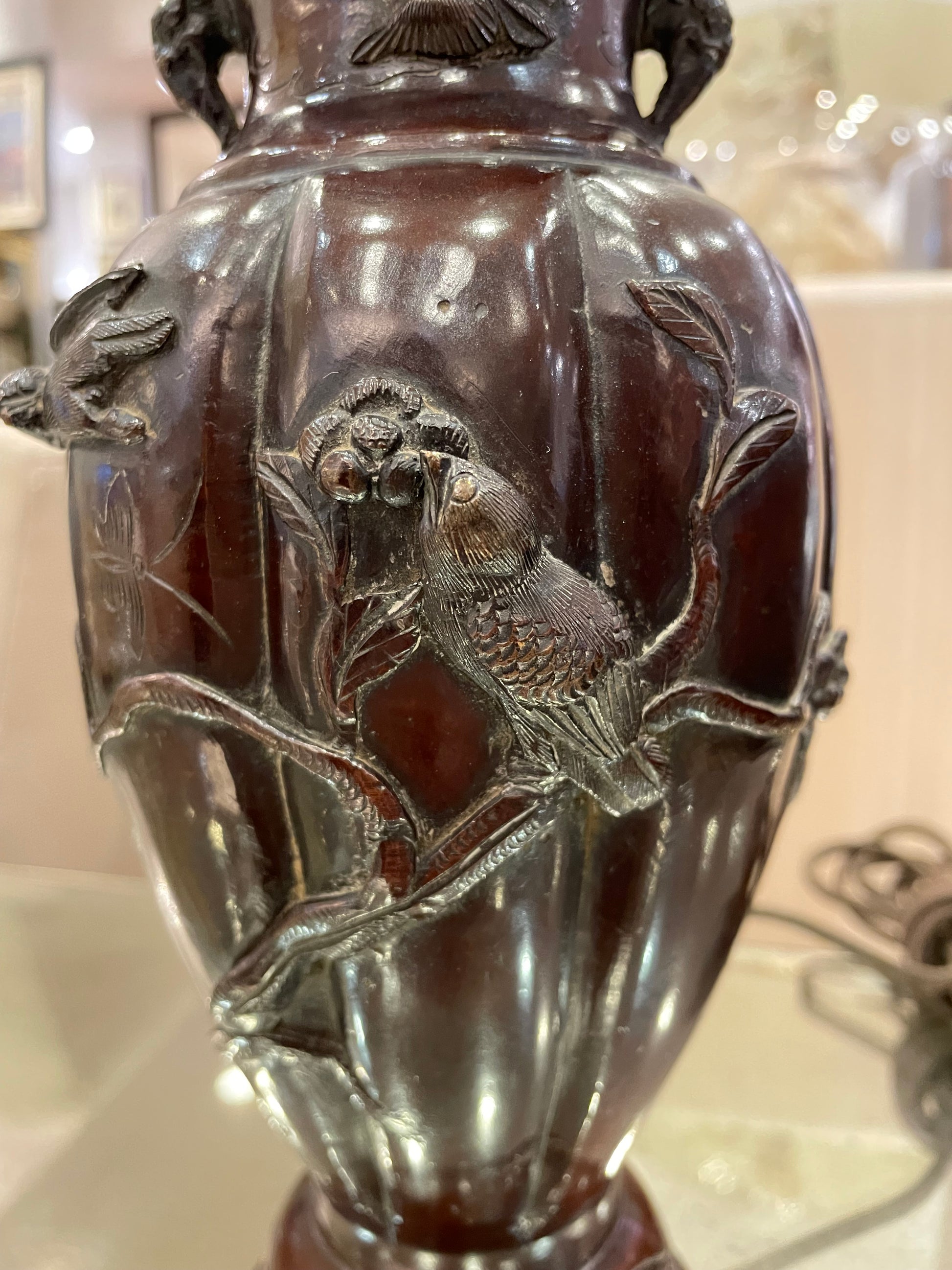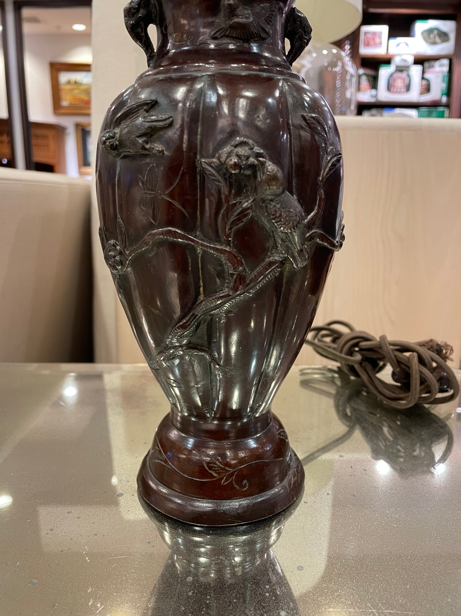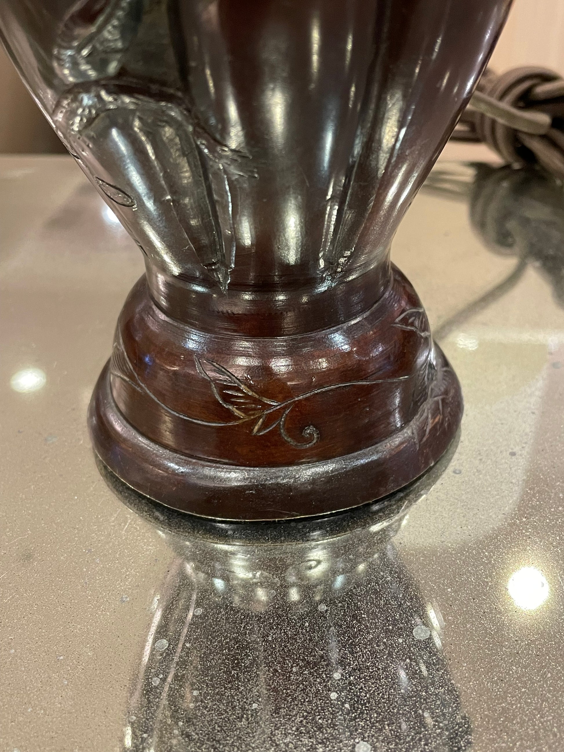 This antique Japanese table lamp is from the 1880s. Features a gourd shaped base with engraved leaves, butterflies, flowing branches, and birds. There are two light sockets with beaded pull chains. This does not have a shade.