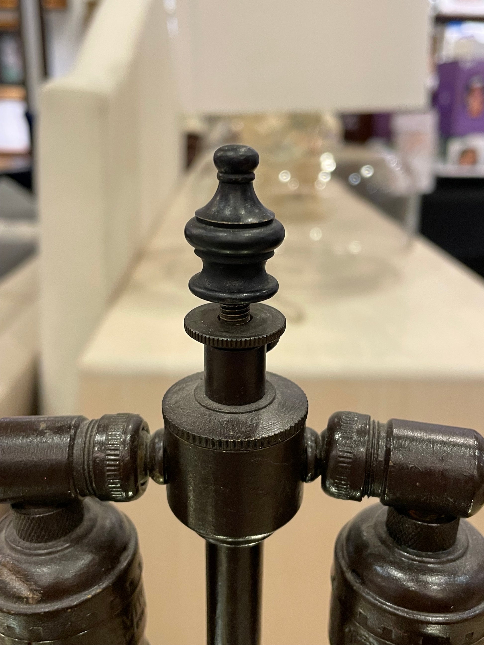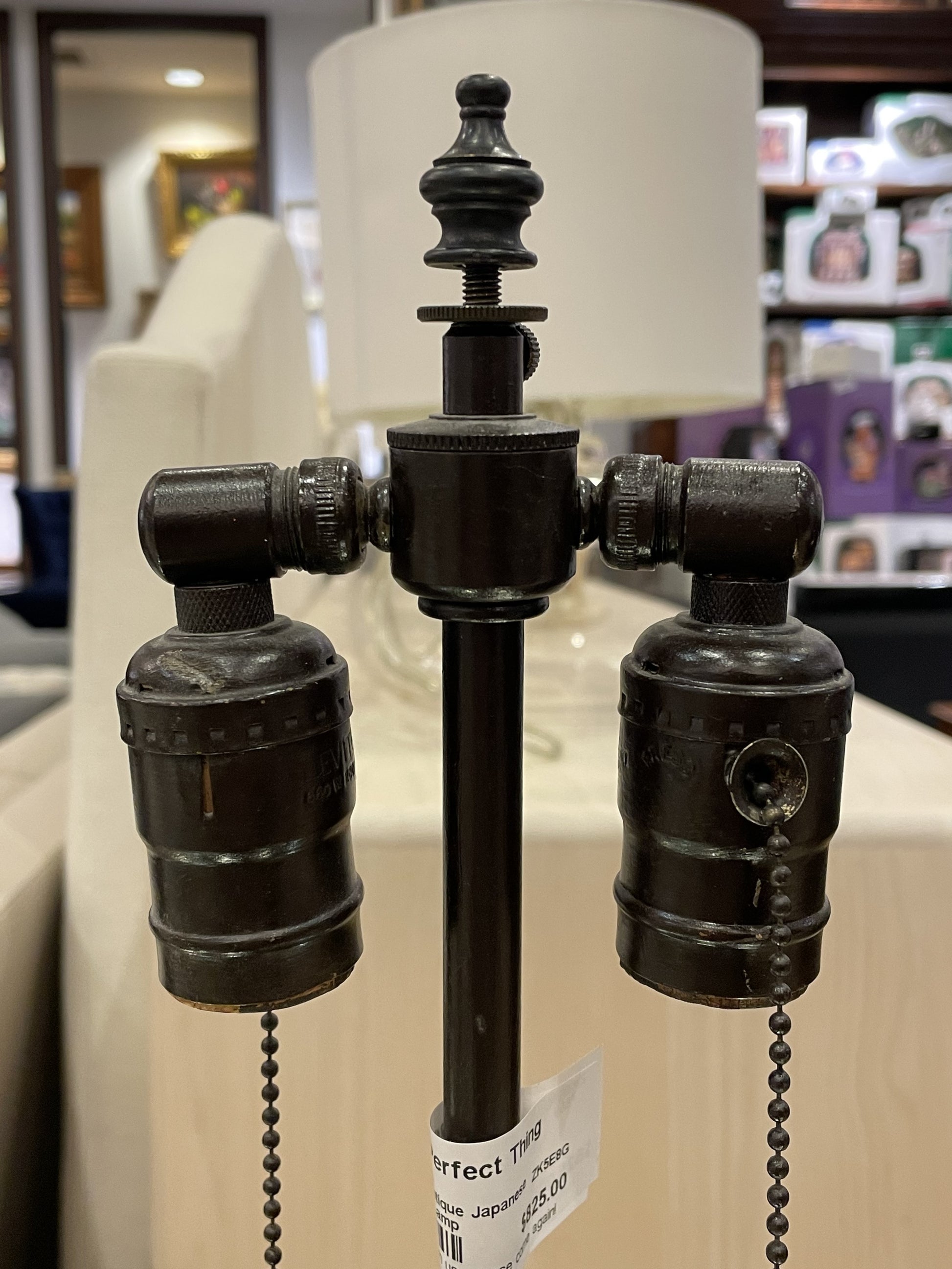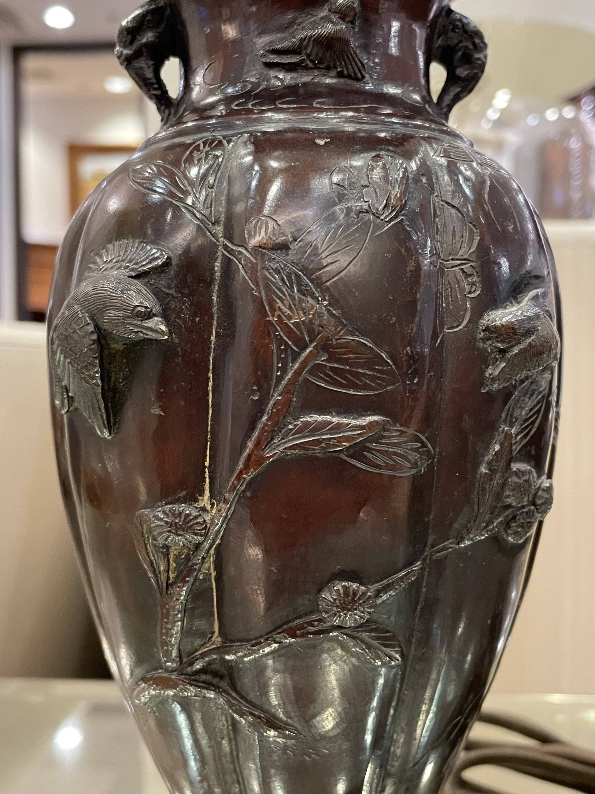 This antique Japanese table lamp is from the 1880s. Features a gourd shaped base with engraved leaves, butterflies, flowing branches, and birds. There are two light sockets with beaded pull chains. This does not have a shade.