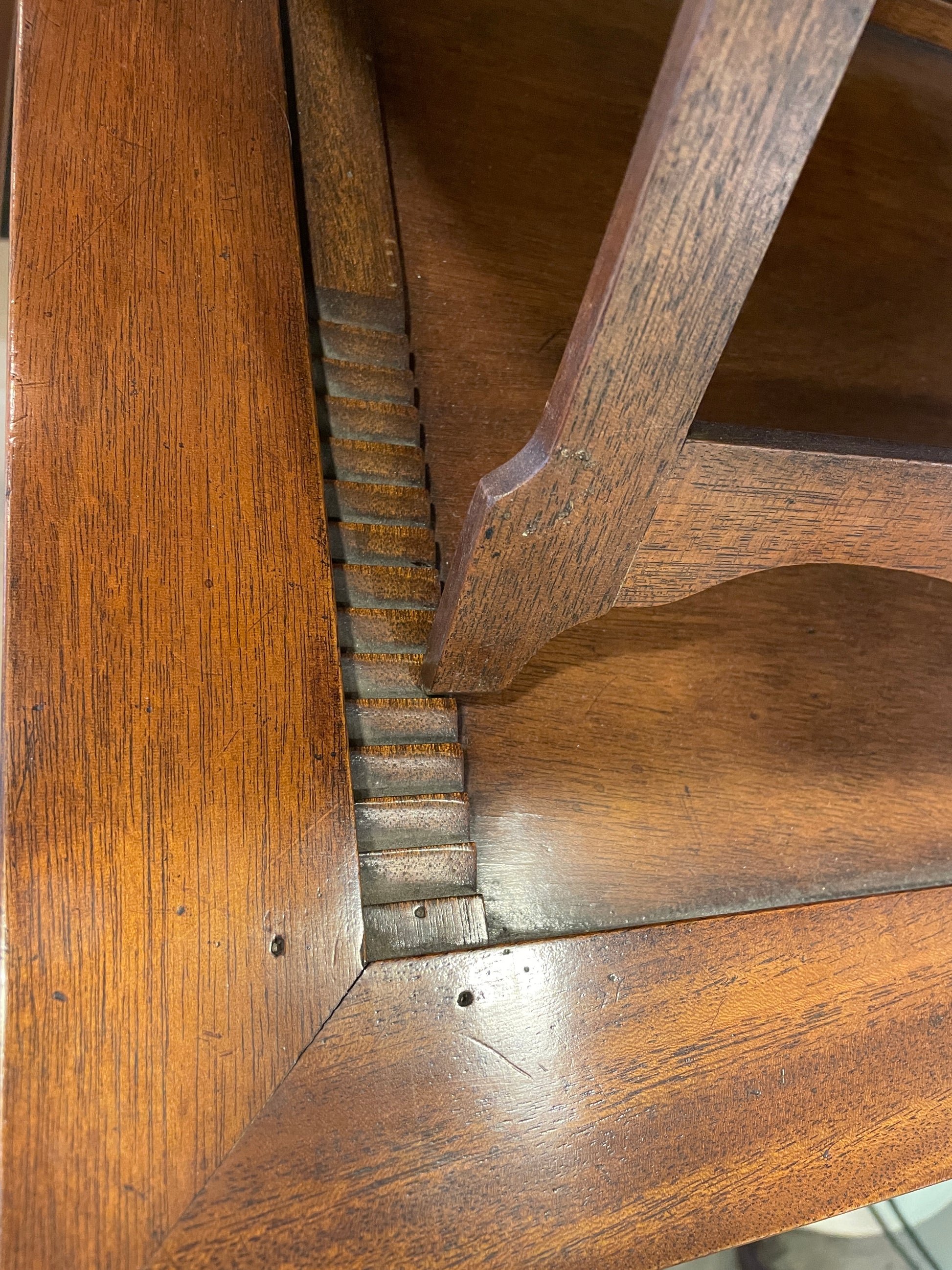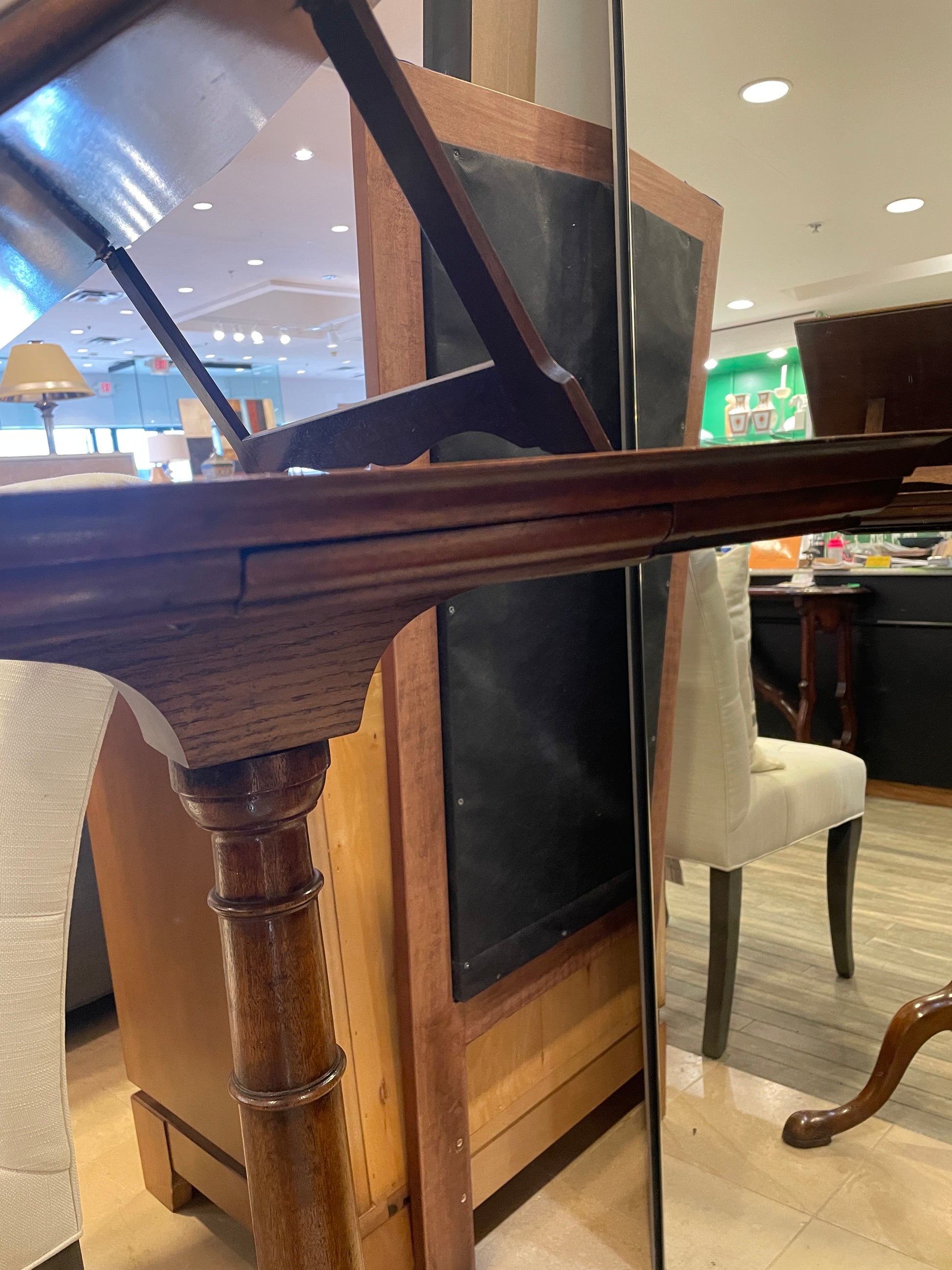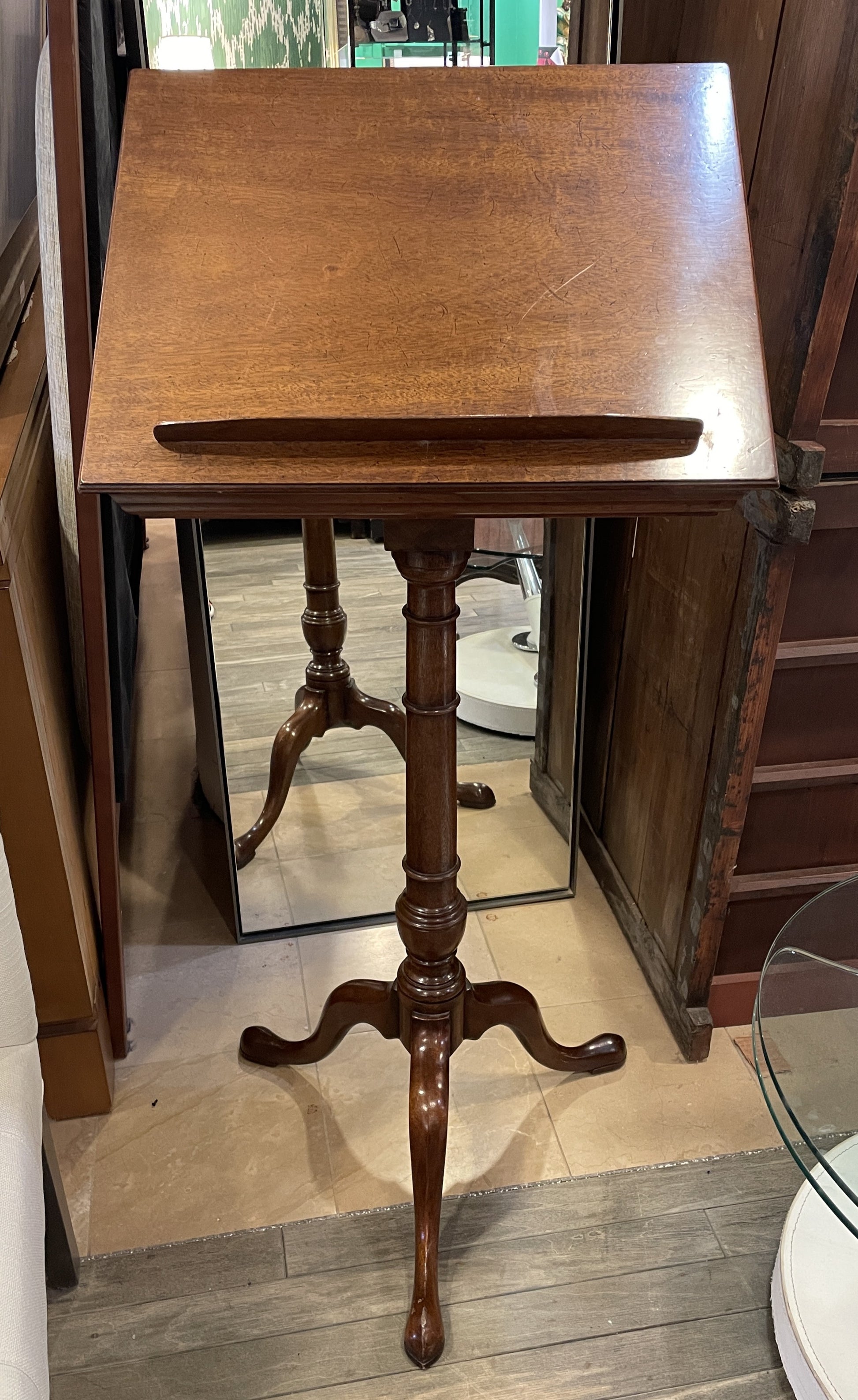 This gorgeous lectern sits on a three-legged base with a turned stand. The piece is crafted from a beautiful medium-toned wood. The top portion of the lectern can be propped up at different heights, and the top can also be laid flat by folding the prop in. A small shelf sticks out from the tabletop to hold up books. Either short side of the lectern hides a candlestand that slides in and out. This beautiful lectern is a work of art and history sure to elevate any space.