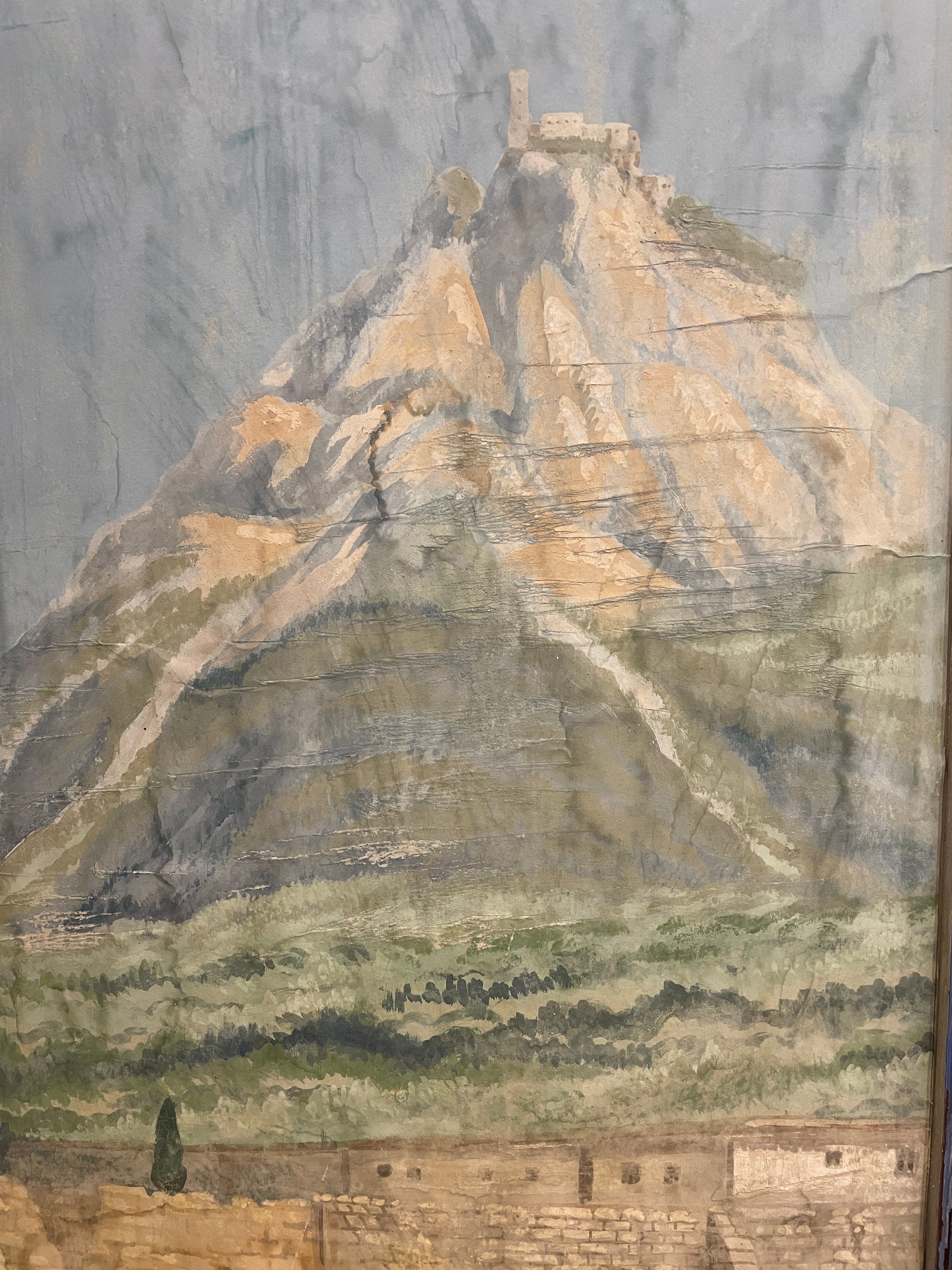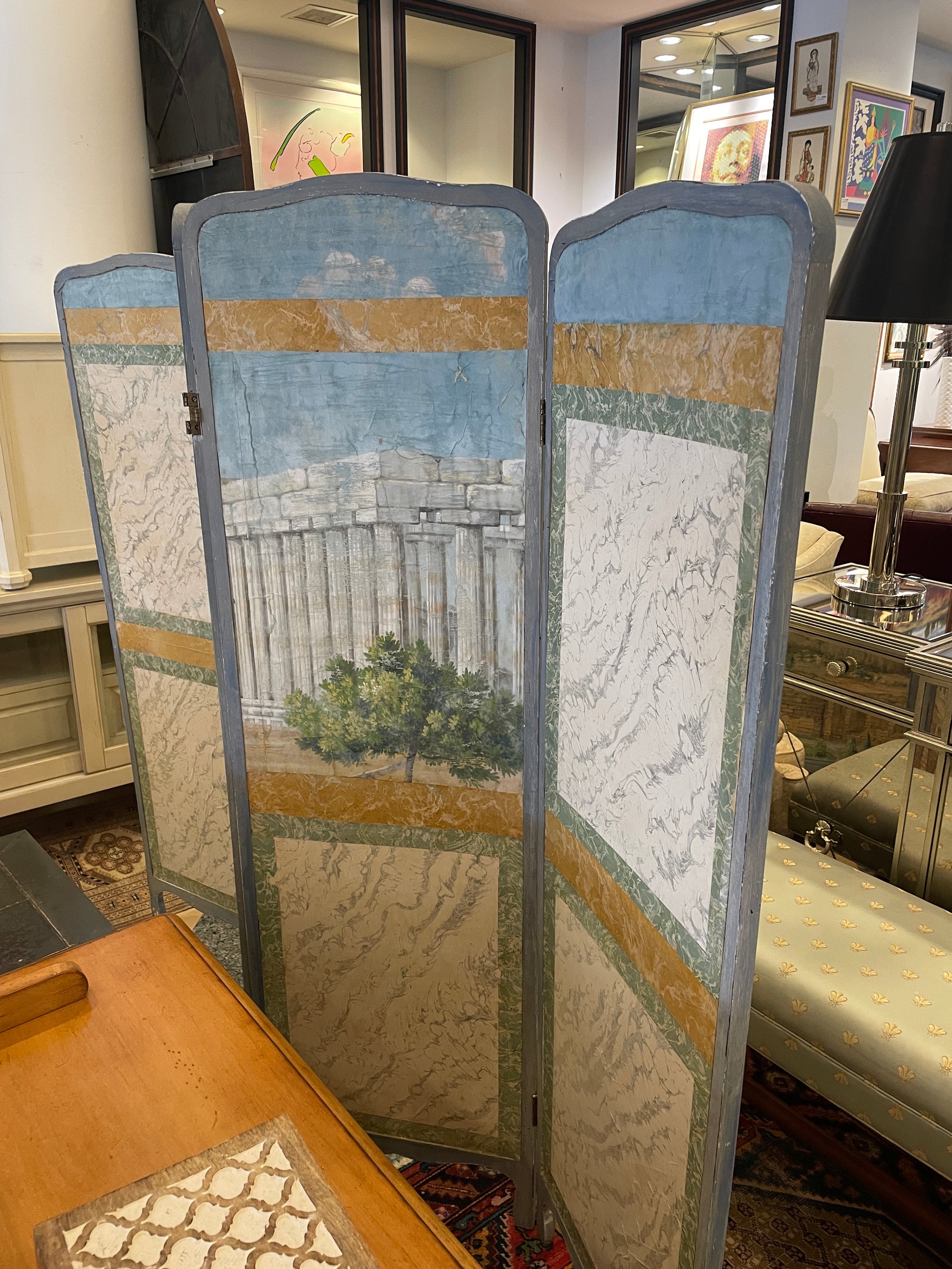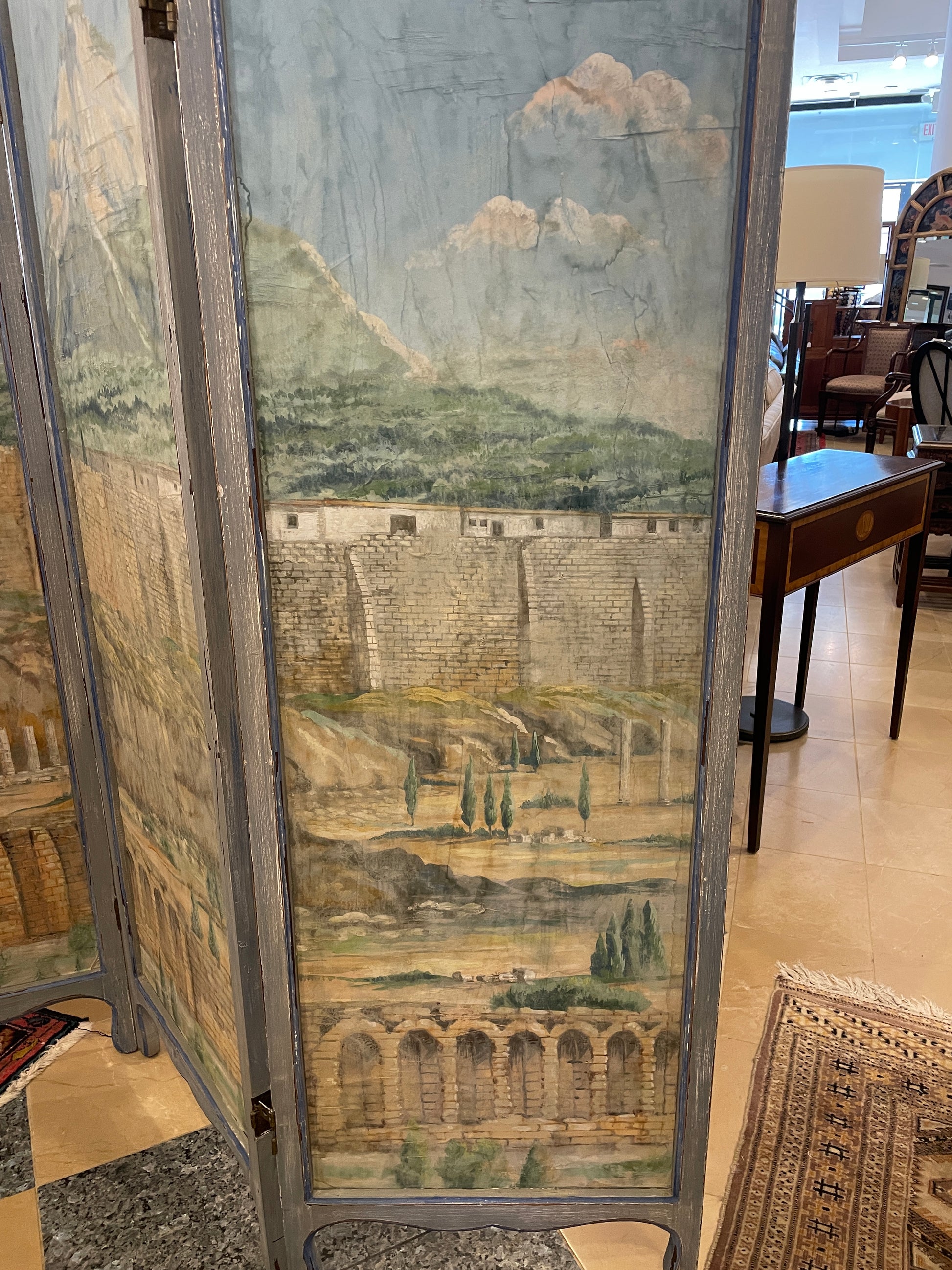 Antique 19th century painted canvas room divider. This beautiful four panel room divider opens and closes on hinges in a zigzag pattern. The panels are held in a cool toned gray frame, and are painted with a scene that includes classical architecture and mountains. The two sides of the piece are different with the back including two color block panels. The center pieces are taller than the outer ones. A unique and eye-catching piece that is both functional and decorative.