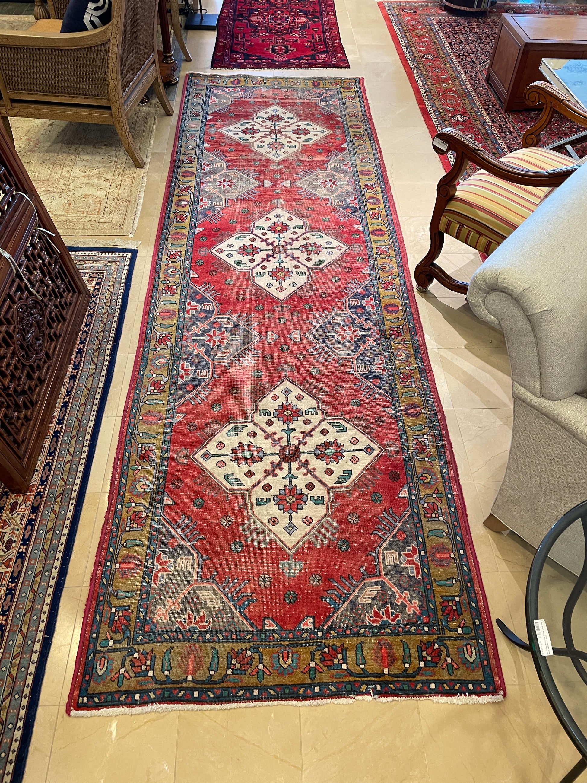 Antique Turkish runner. This beautiful runner features a repeating red and ivory medallion design with a border in shades of blue, green, brown, and red. Geometric designs and flowers embellish this beautiful hand knotted piece. The short ends are accented with a subtle ivory fringe. A beautiful and colorful work of art that's sure to elevate a space.