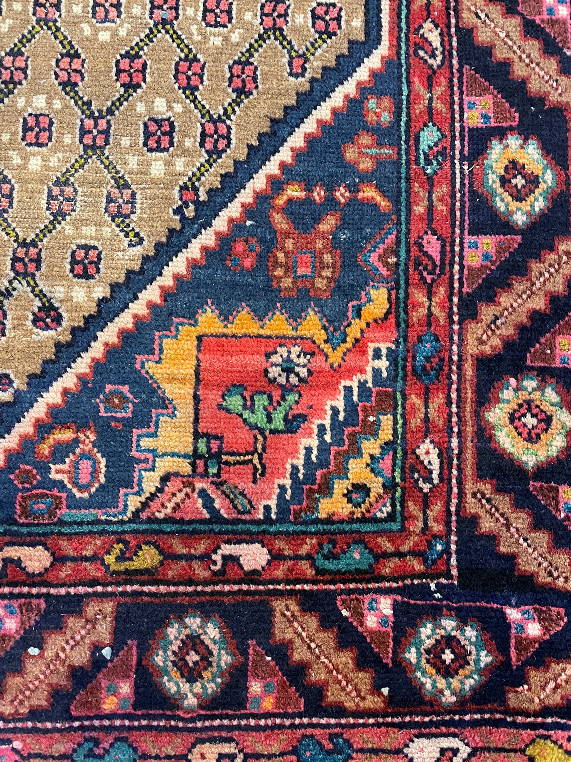 Antique Turkish runner. This beautiful runner features a large elongated hexagon portion in shades of tan with a repeating floral motif. The center of the hexagon has a colorful abstract design. Surrounding the center is a border of vibrant blues and reds. The border has abstract shapes combined with geometric patterns. The short ends of the runner have a subtle off white fringe.
