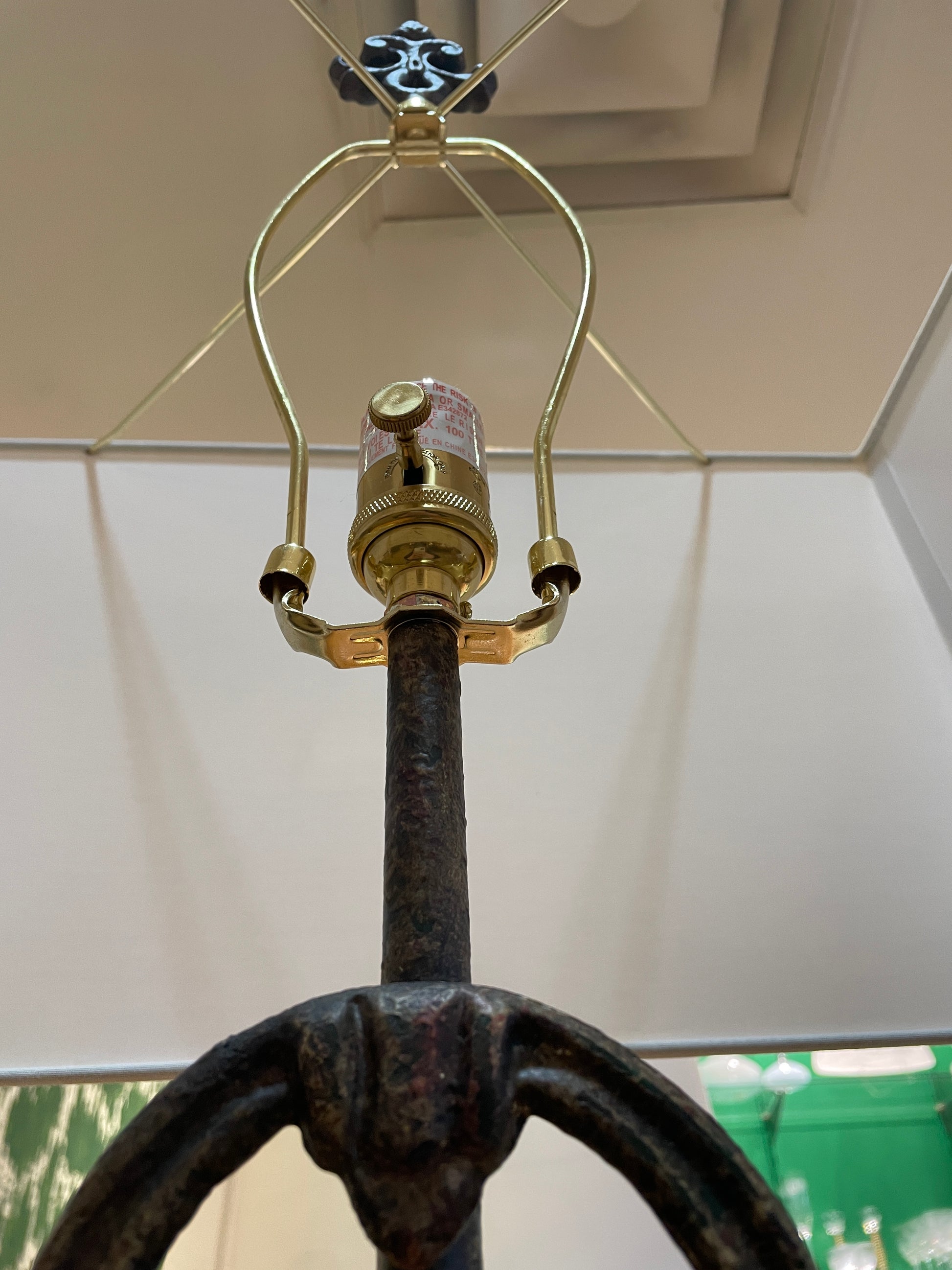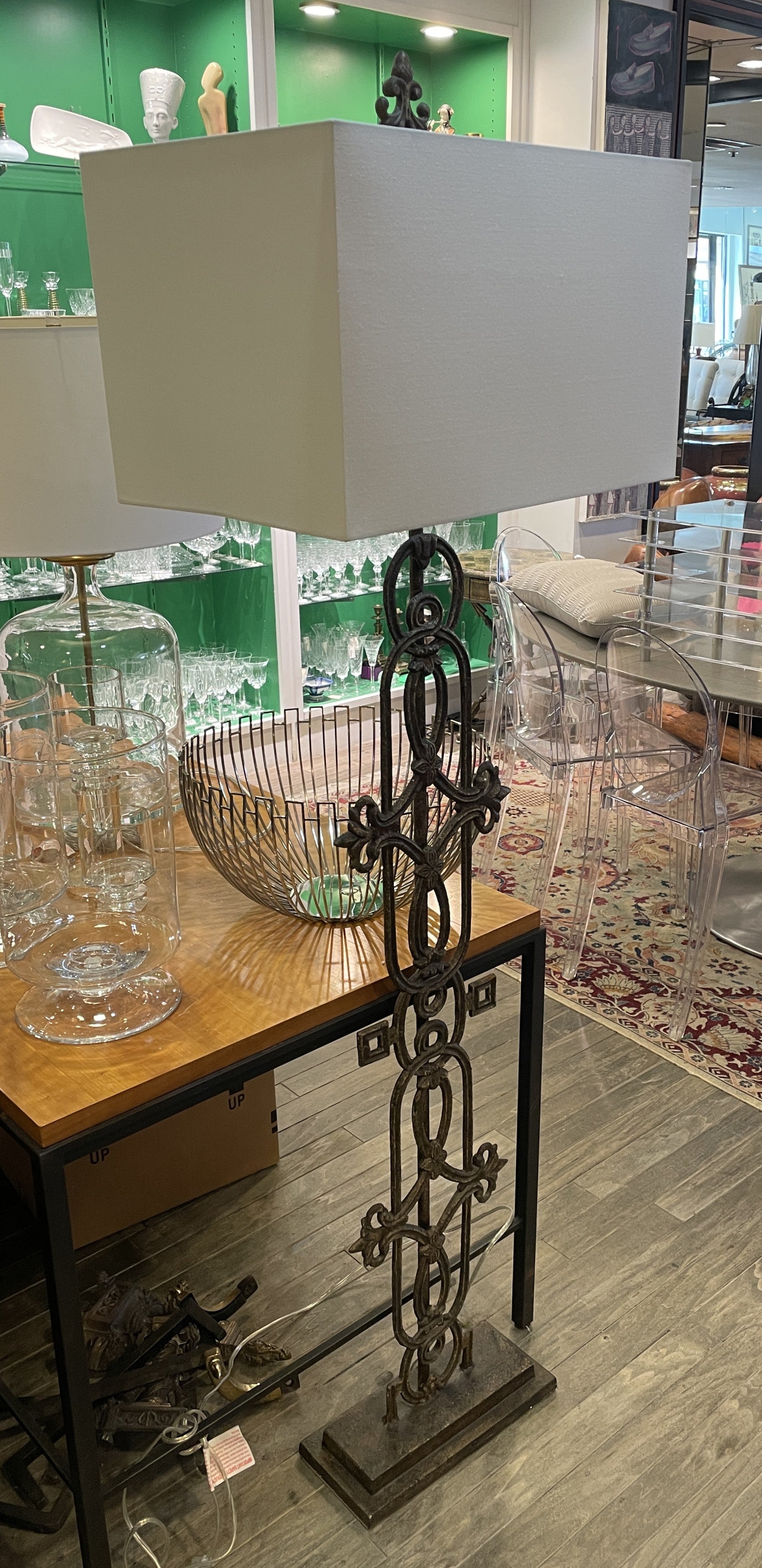 Architectural Balustrade floor lamp with iron base. This beautiful piece features an intricate iron base with interlacing swoops and curls throughout. The piece sits on a rectangular base with a flat lower portion and raised center. Atop the base sits a large rectangular white shade that contrasts the intricacy of the base perfectly. From the top of the shade peeks out a small finial with a design that matches the base. A stunning lamp that is sure to elevate a space with its beautiful design.