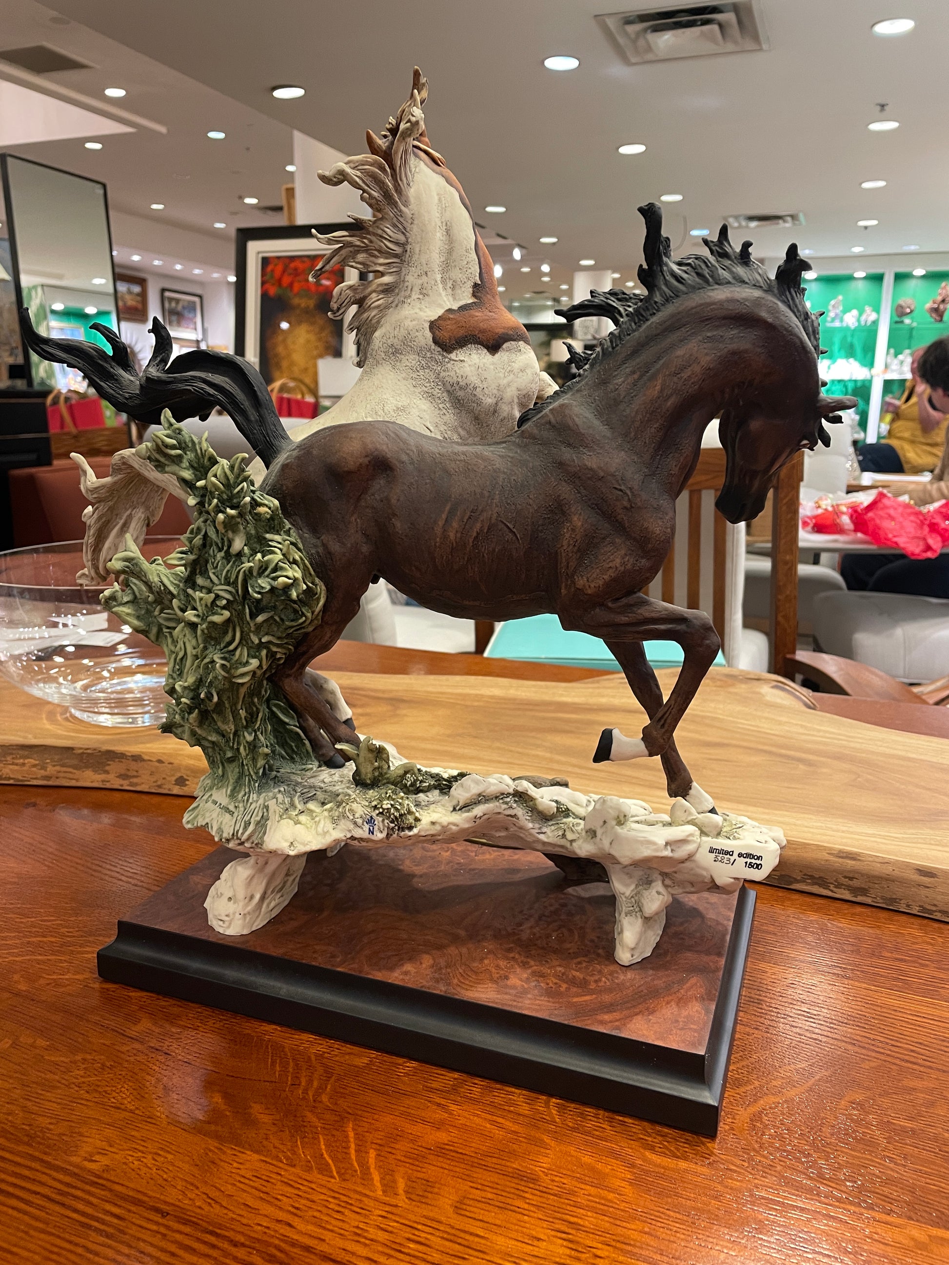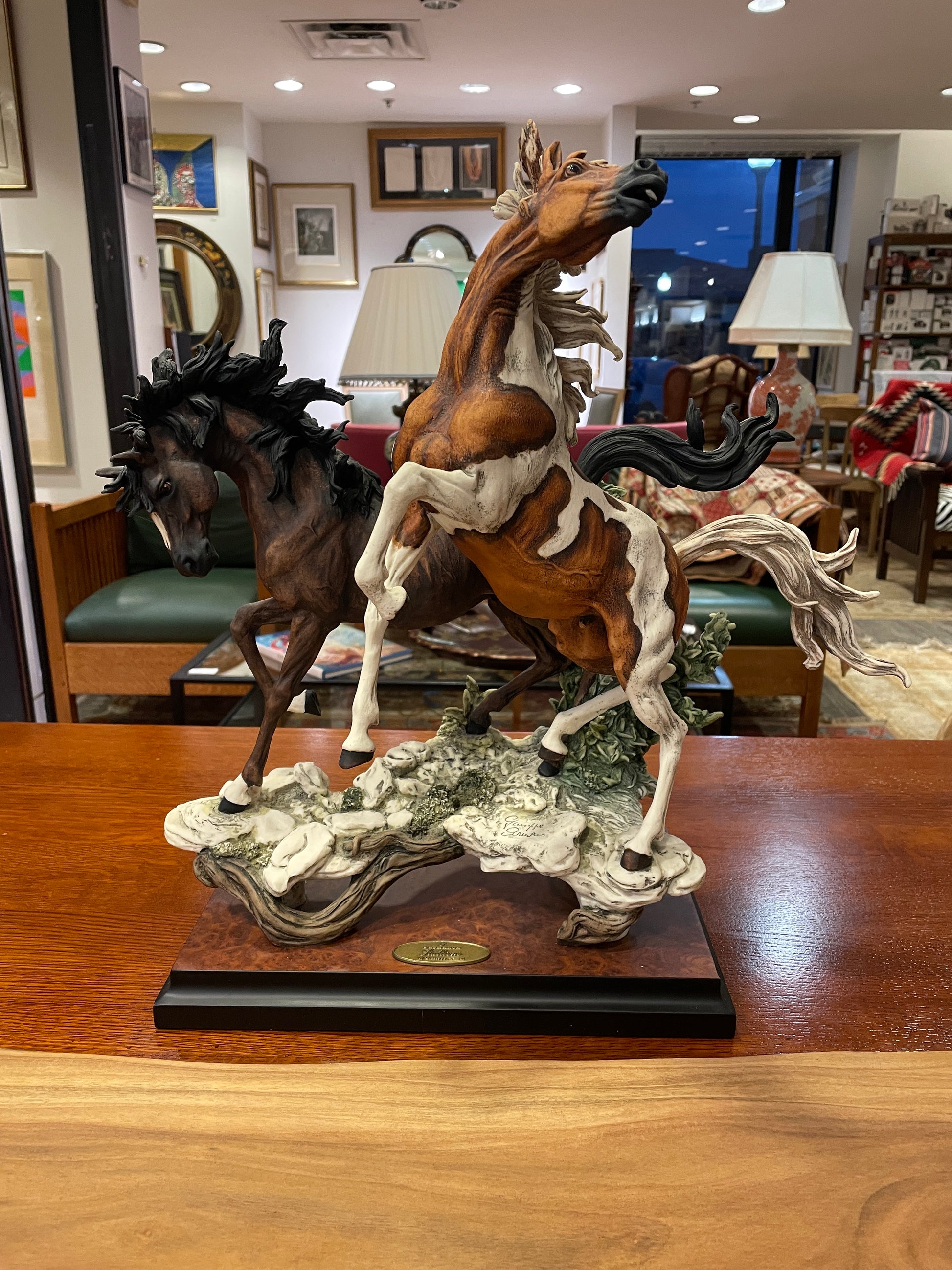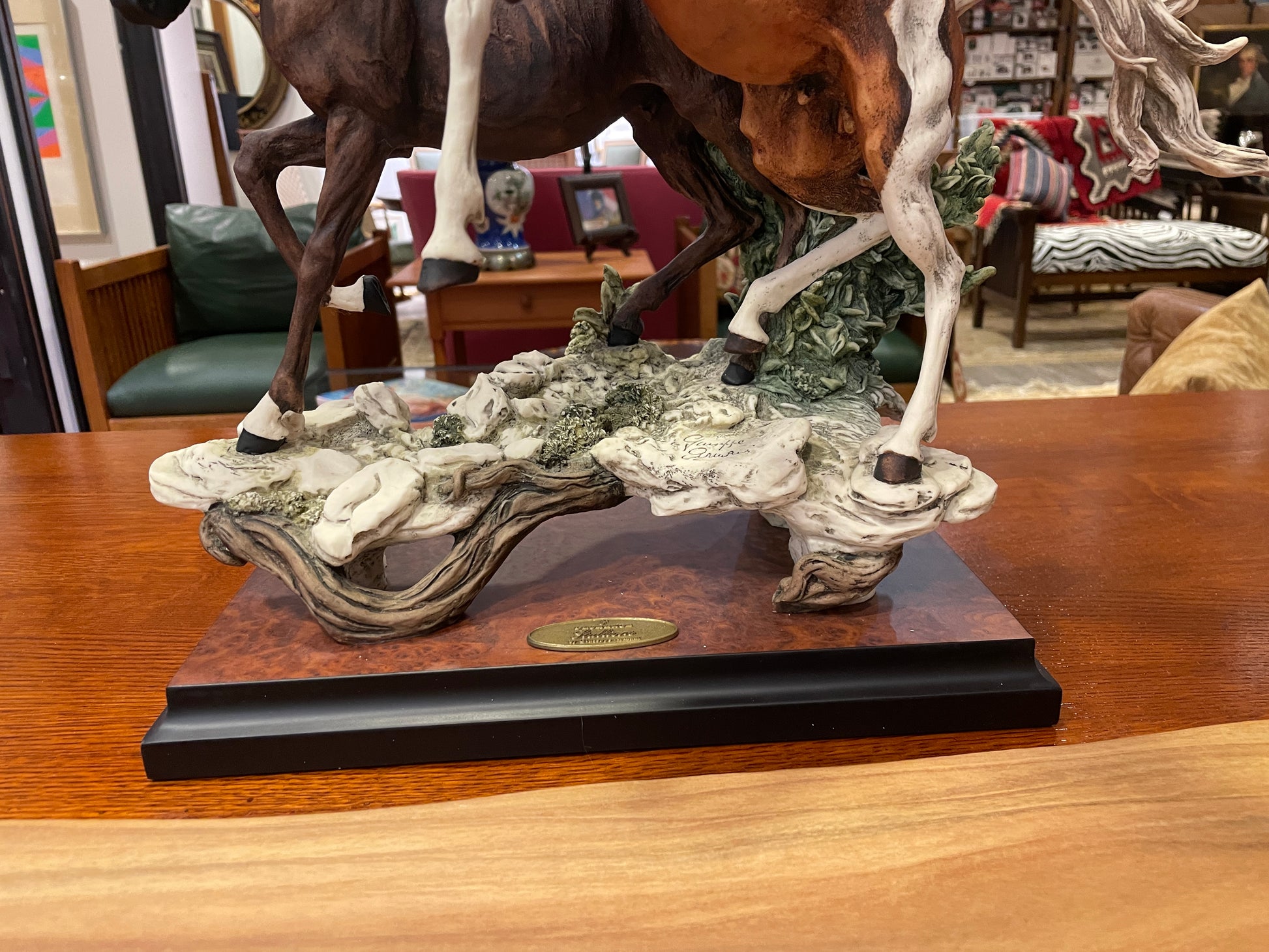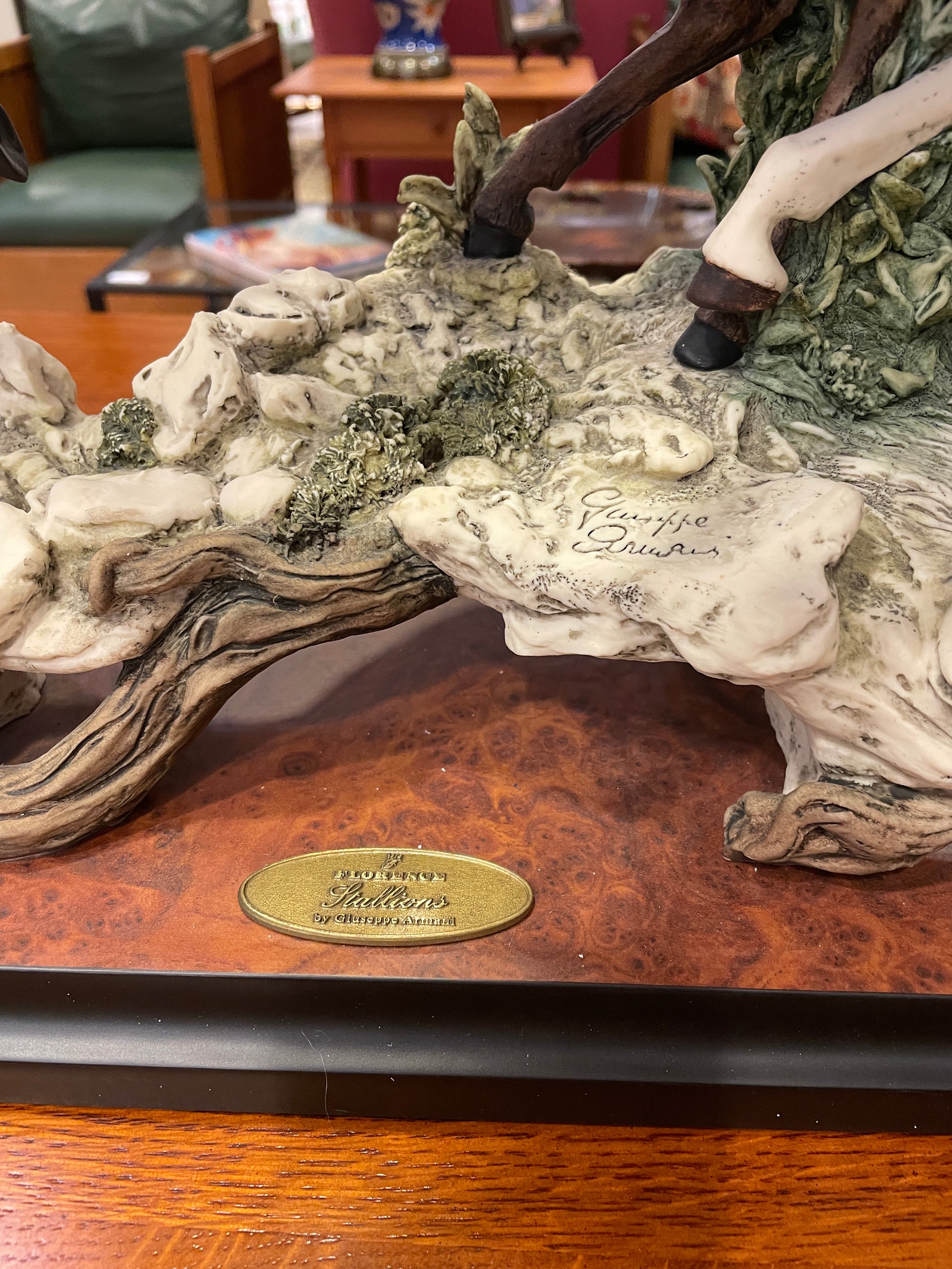 Giuseppe Armani stallions porcelain figurine with box. Limited edition 523/1500. This stunning figurine sits on a wooden base with a placard displaying the title. The top of the base has a burled finish that surrounds a rocky pedestal with root accents. The pedestal holds two stallions. The first is a pinto - a horse with a caramel colored coat and white spots with a white mane and tail. The other is a bay - a dark chocolate brown colored coat, black mane, and black tail. The pinto is rearing up and the bay is standing with one front hoof up. A beautiful piece perfect for a horse lover, or a space that needs a little extra liveliness.