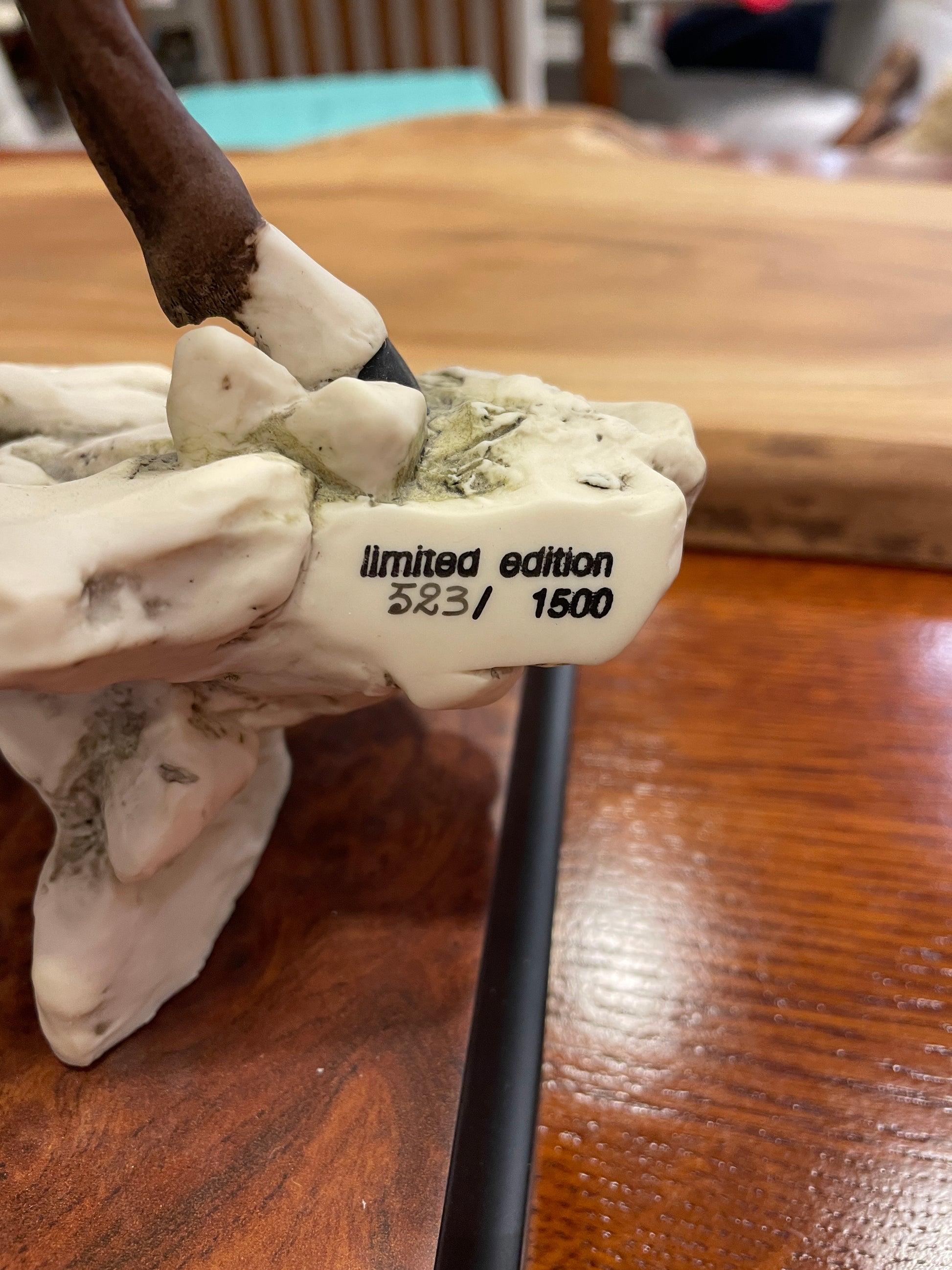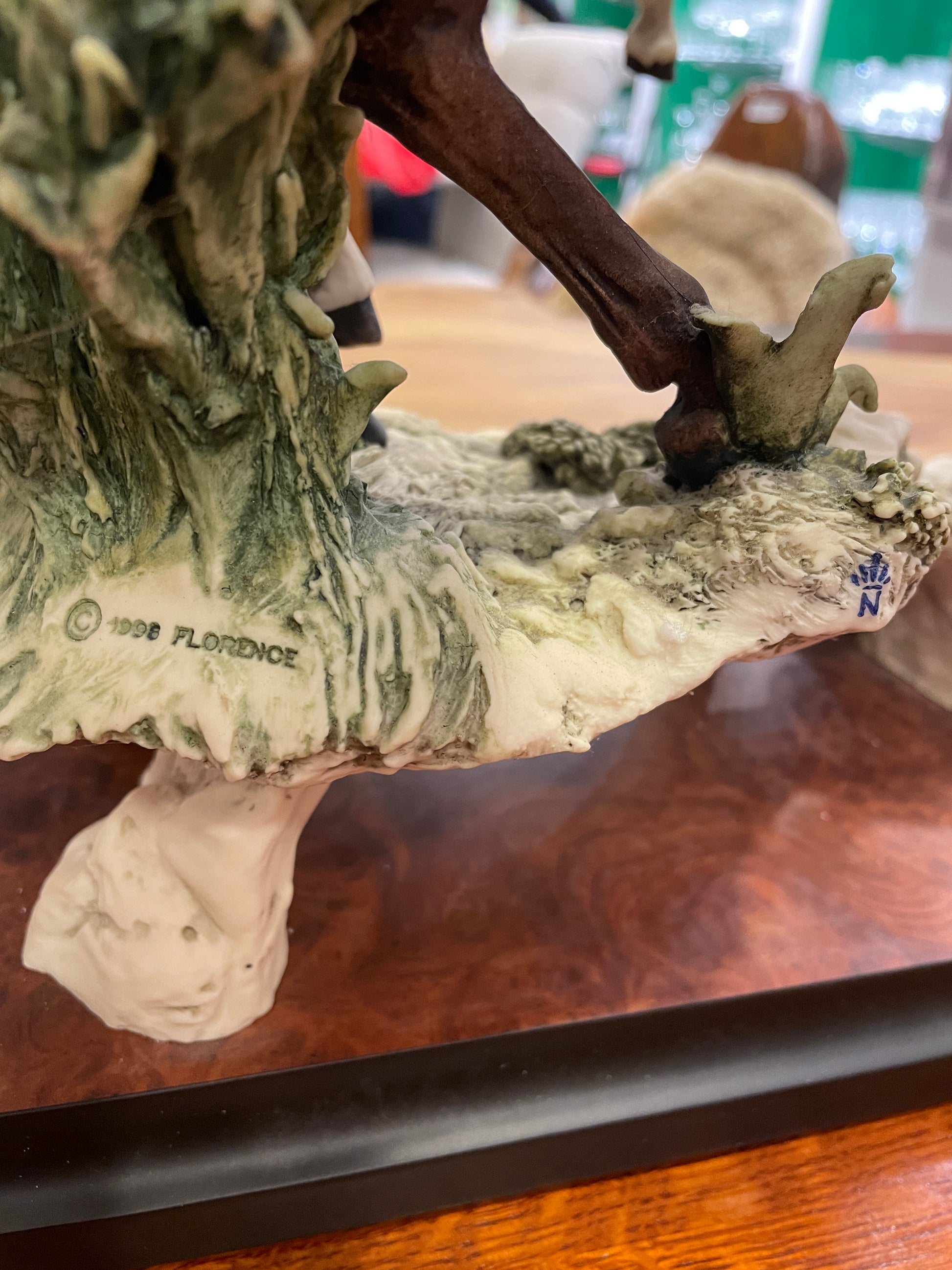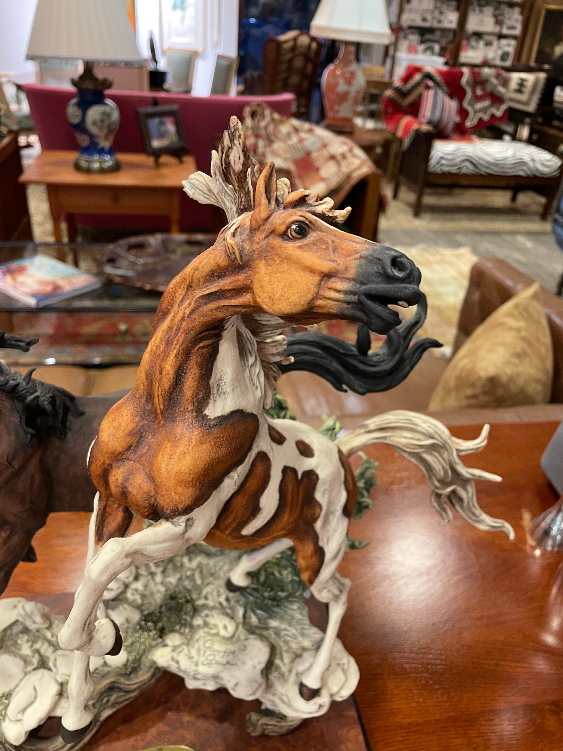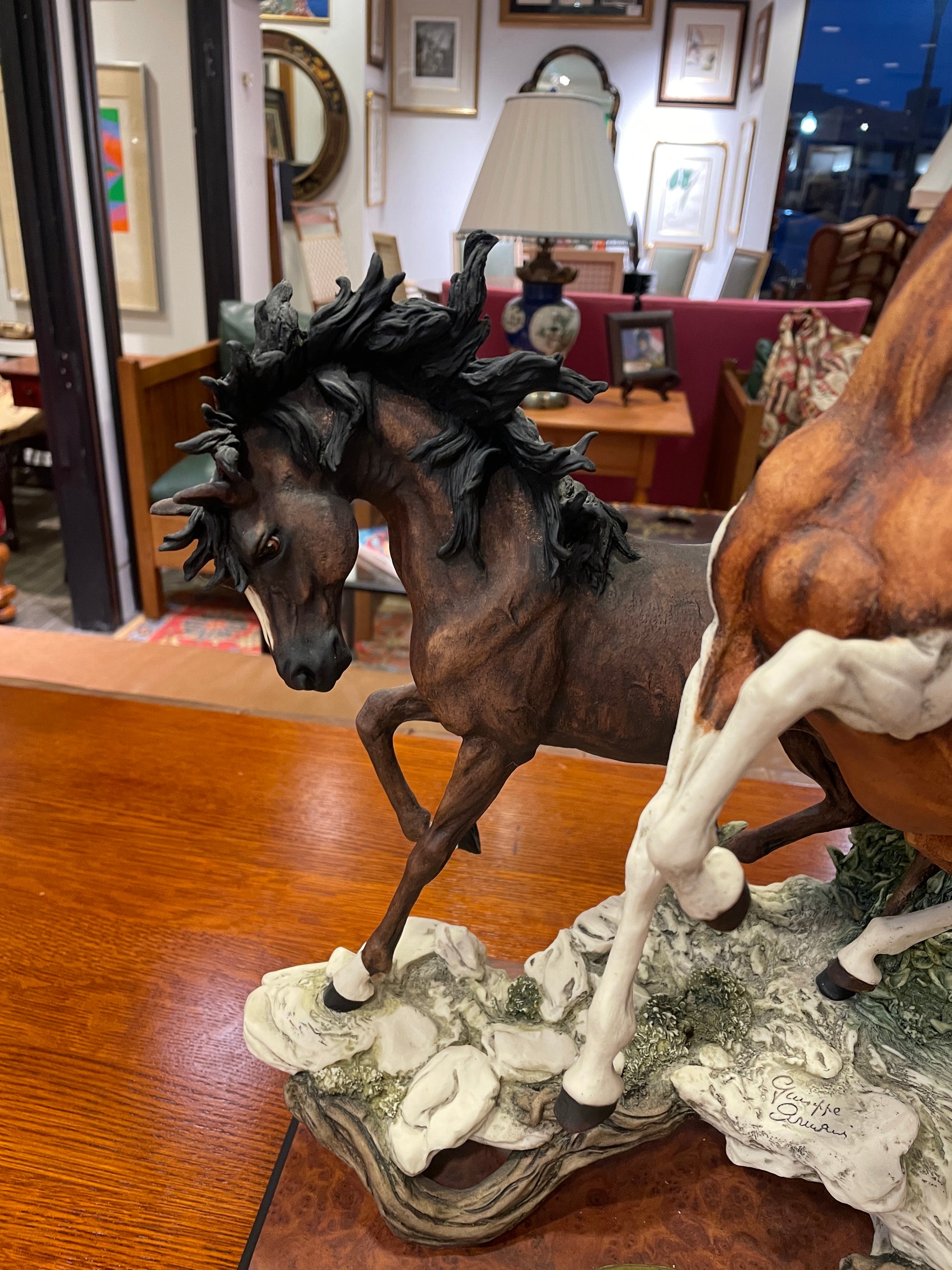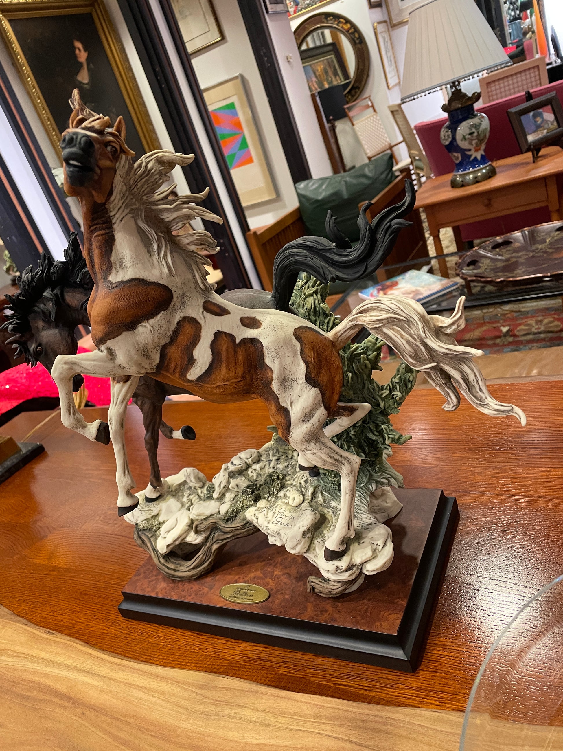 Giuseppe Armani stallions porcelain figurine with box. Limited edition 523/1500. This stunning figurine sits on a wooden base with a placard displaying the title. The top of the base has a burled finish that surrounds a rocky pedestal with root accents. The pedestal holds two stallions. The first is a pinto - a horse with a caramel colored coat and white spots with a white mane and tail. The other is a bay - a dark chocolate brown colored coat, black mane, and black tail. The pinto is rearing up and the bay is standing with one front hoof up. A beautiful piece perfect for a horse lover, or a space that needs a little extra liveliness.