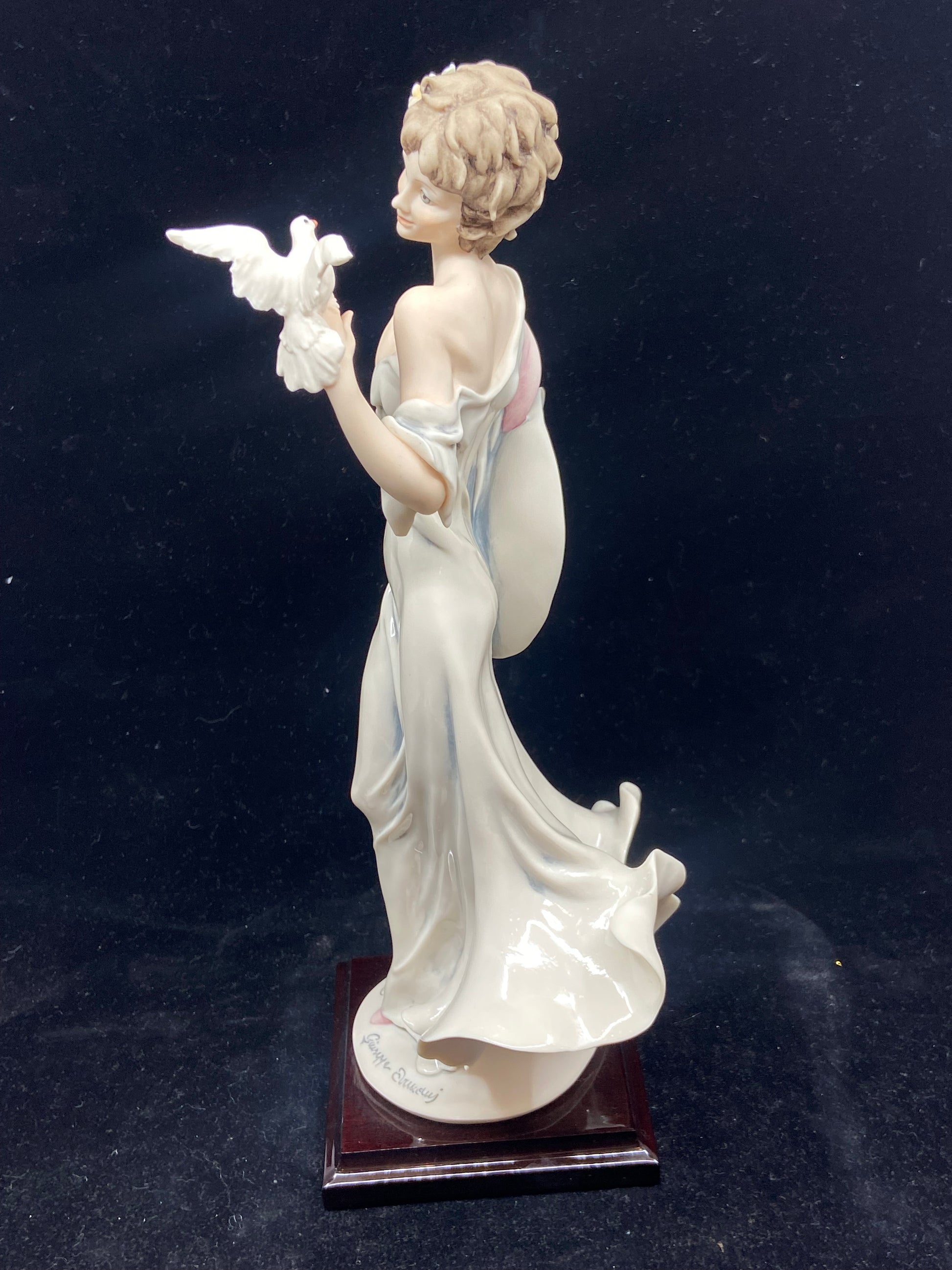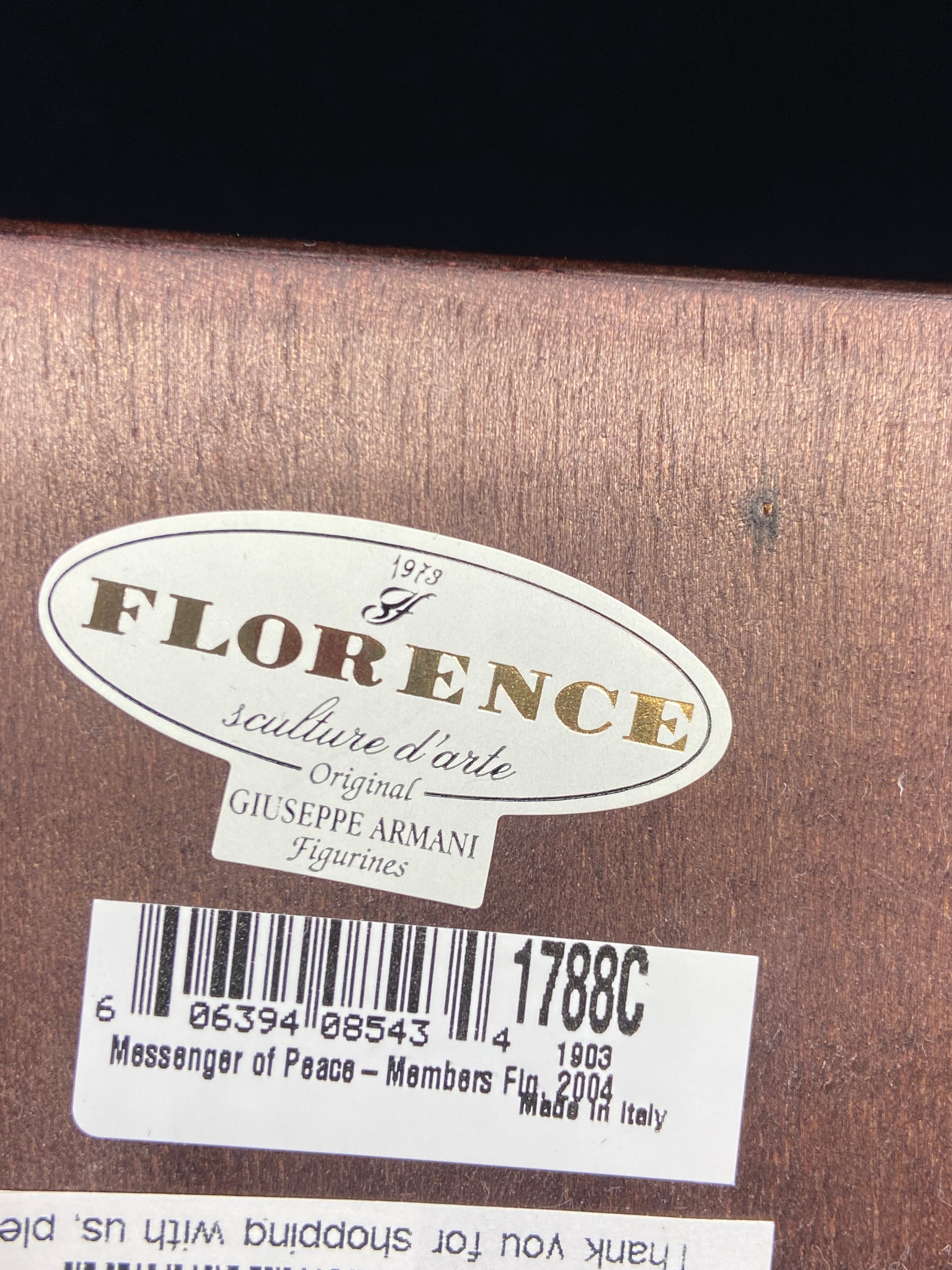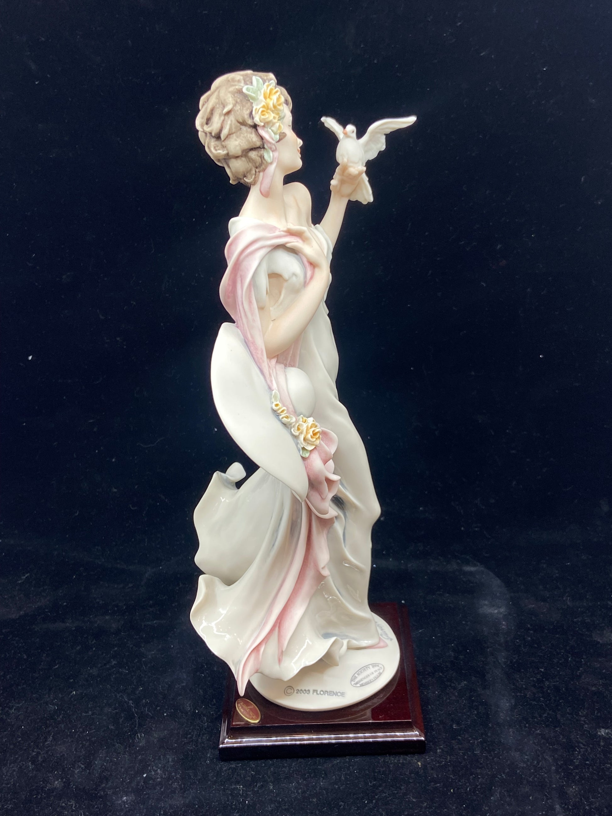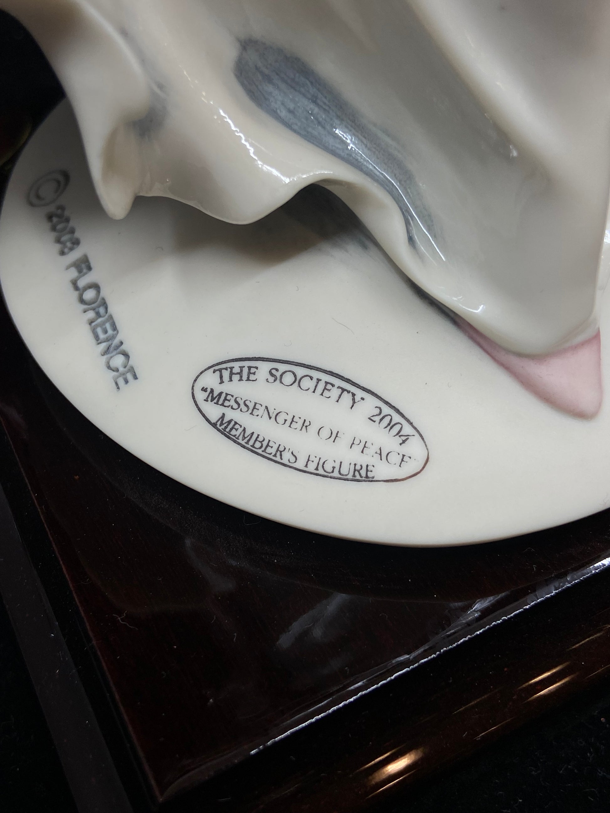 Porcelain sculpture titled "The Messenger of Peace" by Giuseppe Armani. Features a woman in a white flowy dress. She has a large sun hat draped over her shoulder with a dove that just landed on her raised hand. She has short, curly hair with orange flowers in it. The Porcelain sculpture rests on a small wooden platform with a plaque that reads, "Florence Giuseppe Armani"". The base of the figurine is signed marked "2003 Florence". An additional black stamp that reads "The Society 2004 Messenger of Peace Members Figure". This does not include the original box