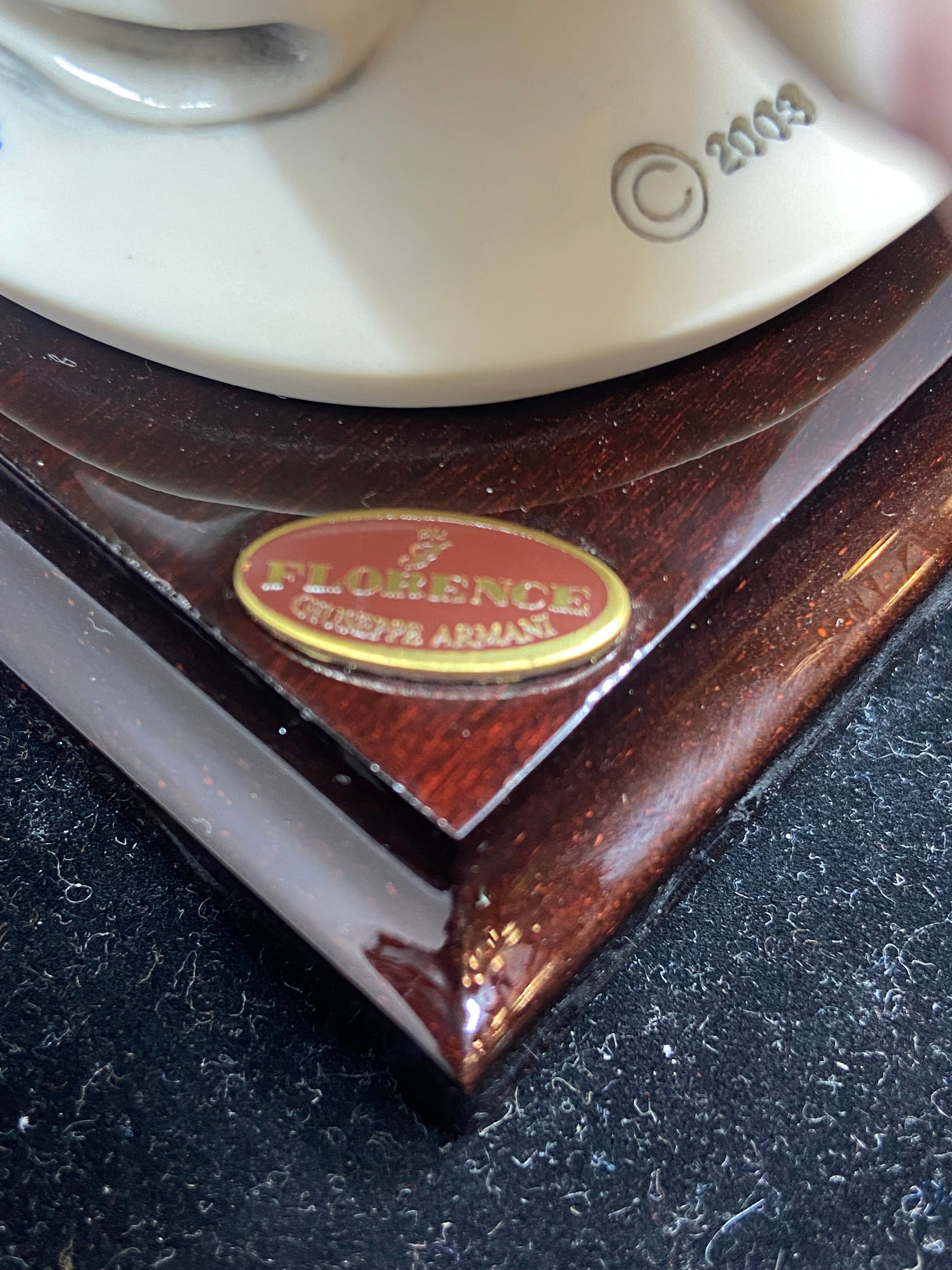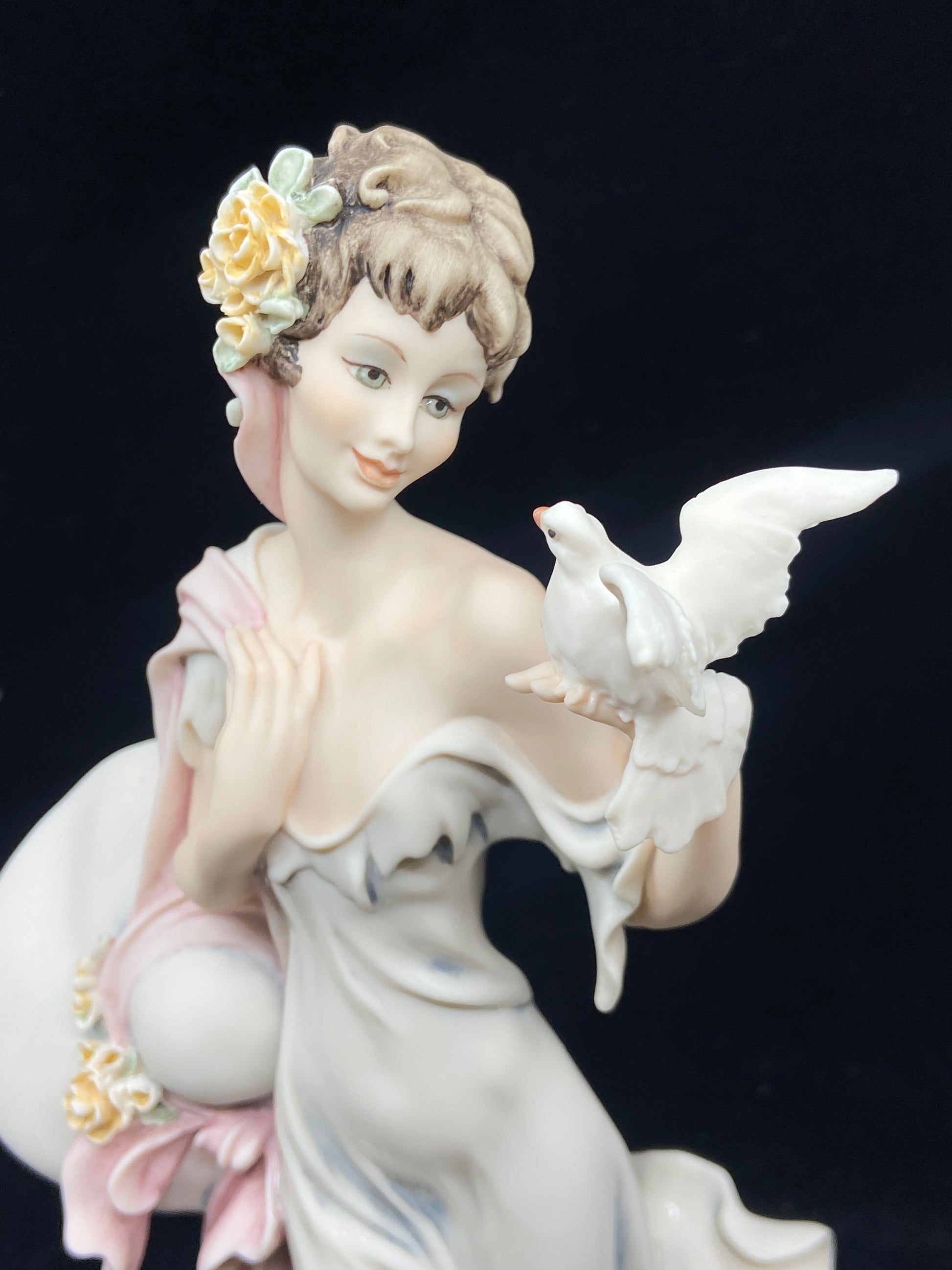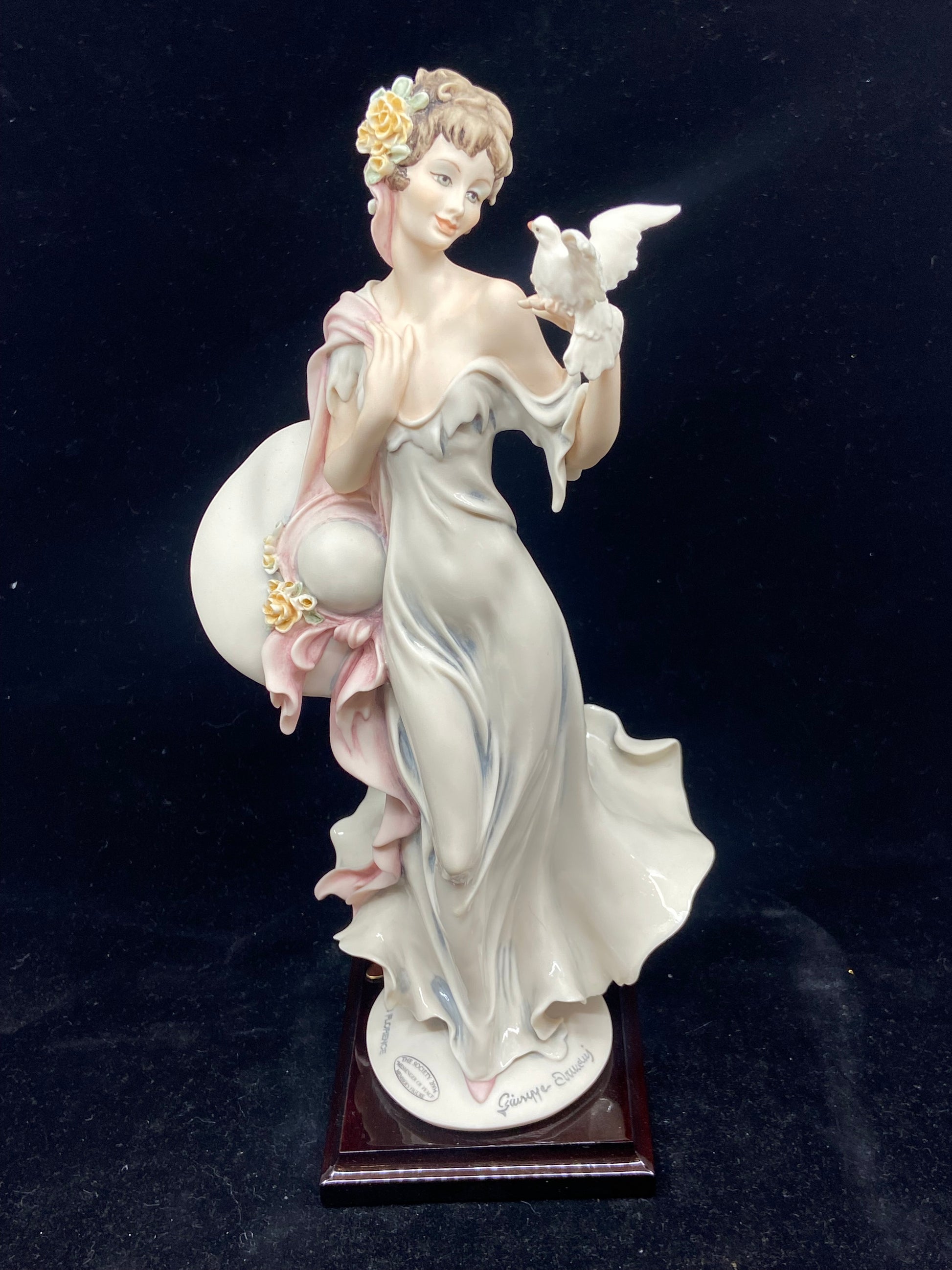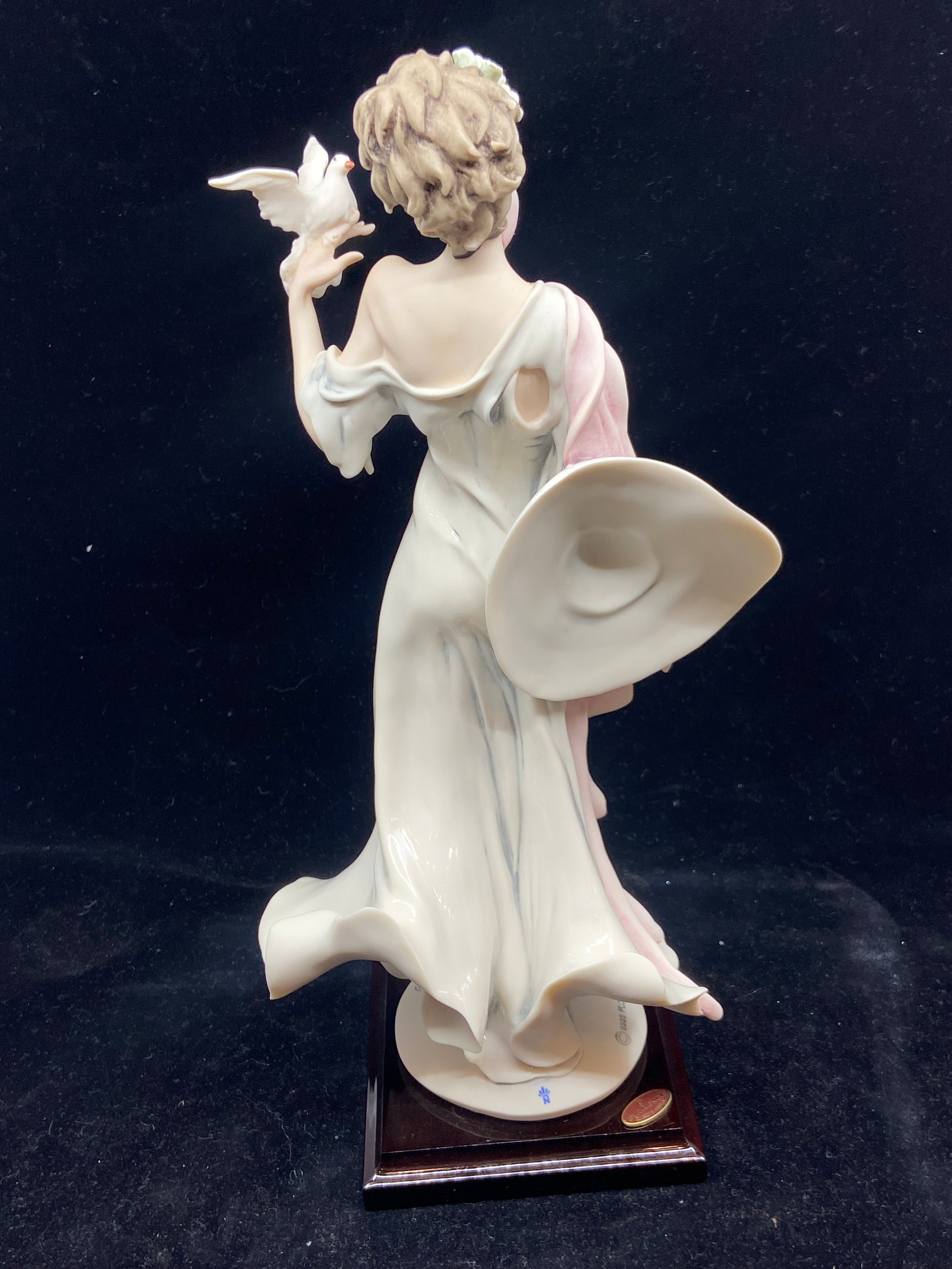 Porcelain sculpture titled "The Messenger of Peace" by Giuseppe Armani. Features a woman in a white flowy dress. She has a large sun hat draped over her shoulder with a dove that just landed on her raised hand. She has short, curly hair with orange flowers in it. The Porcelain sculpture rests on a small wooden platform with a plaque that reads, "Florence Giuseppe Armani"". The base of the figurine is signed marked "2003 Florence". An additional black stamp that reads "The Society 2004 Messenger of Peace Members Figure". This does not include the original box