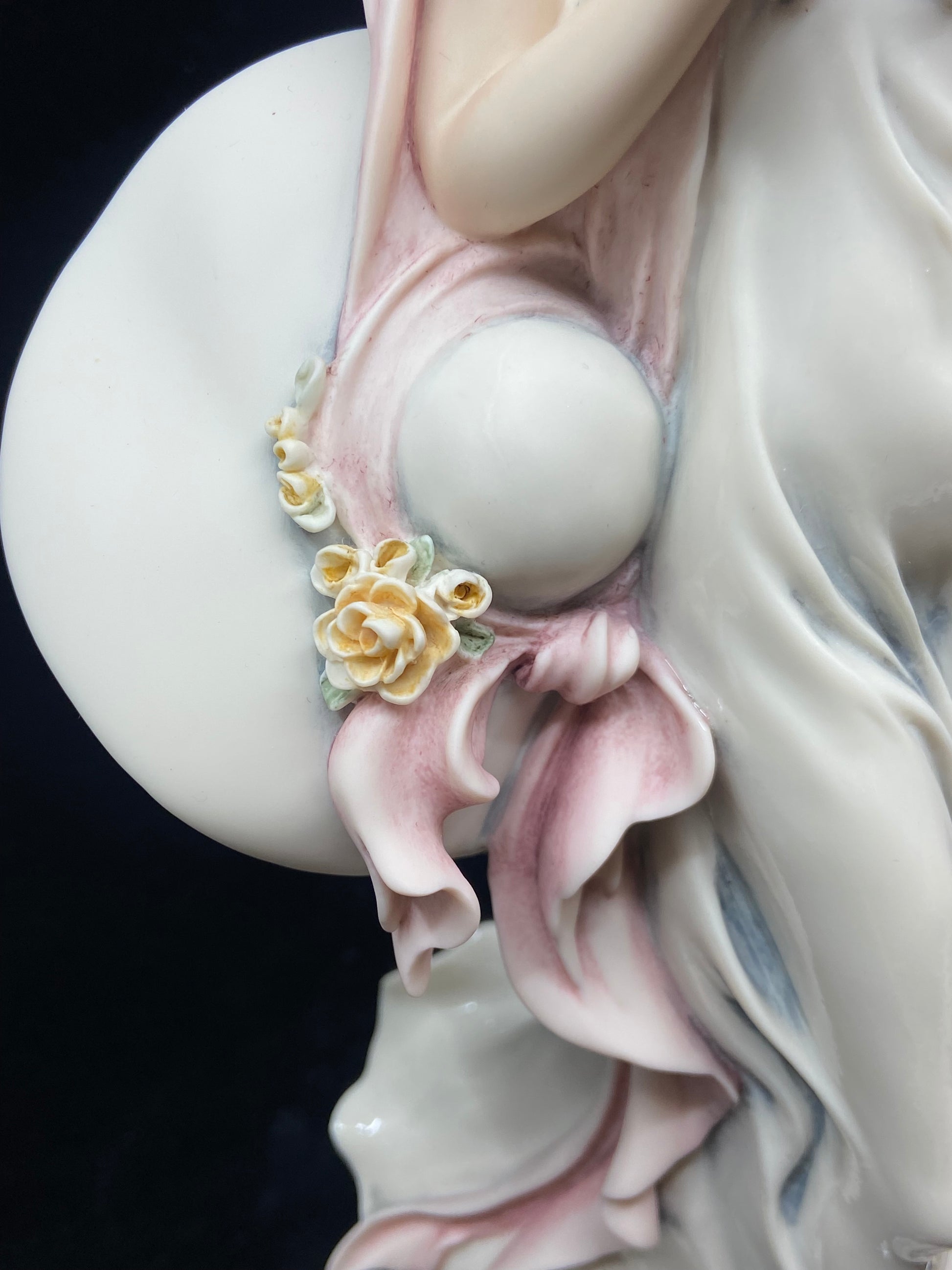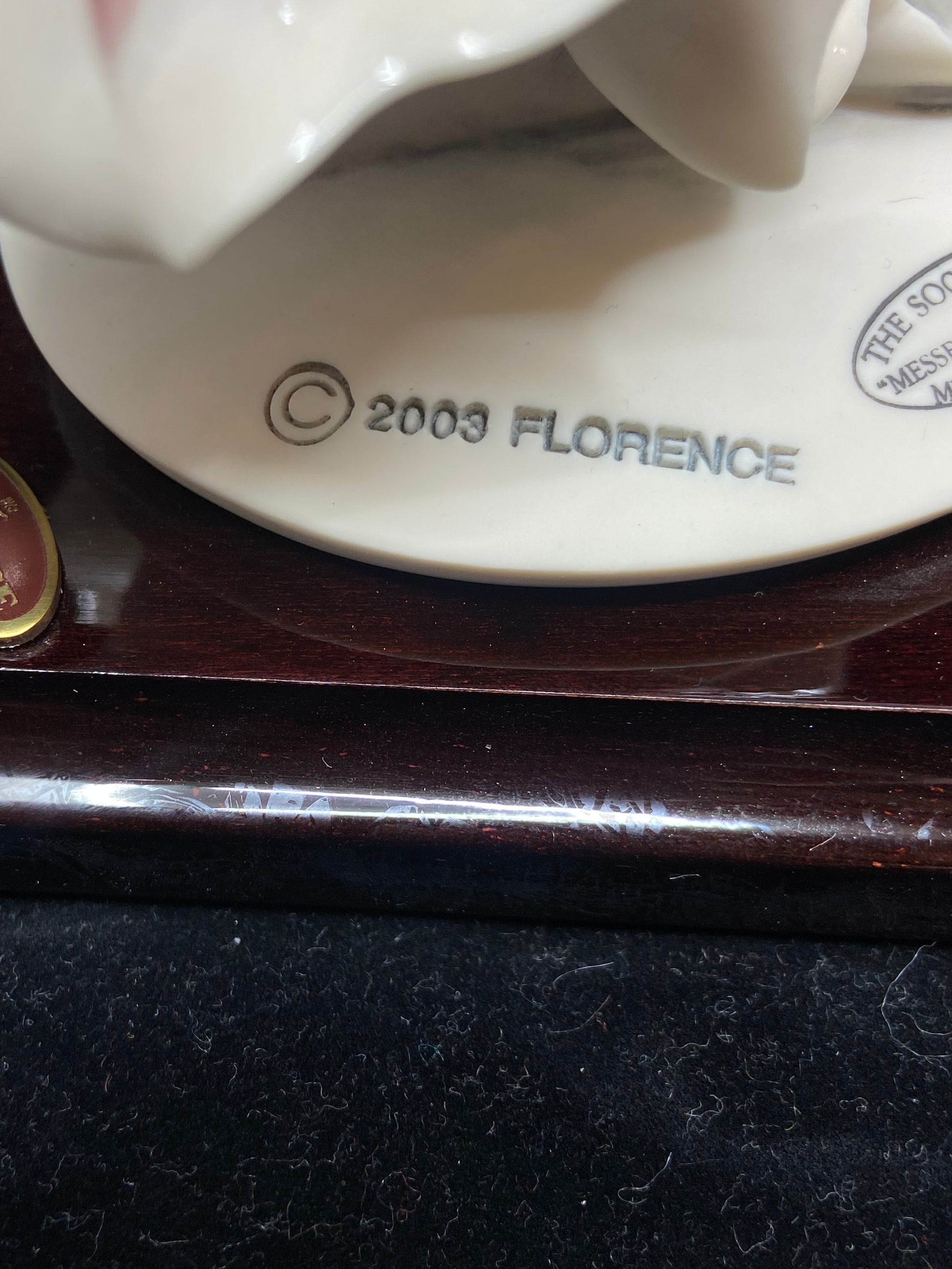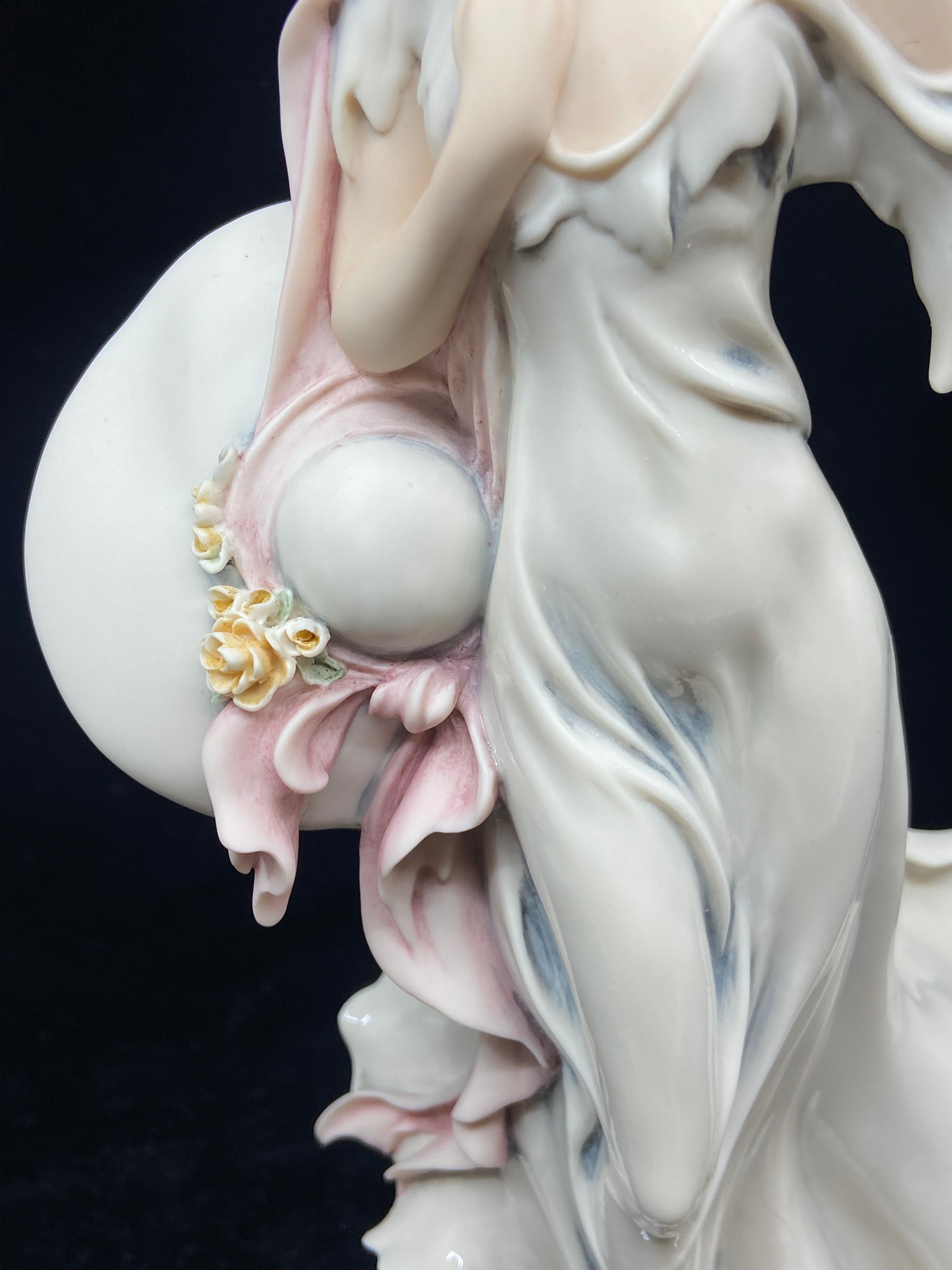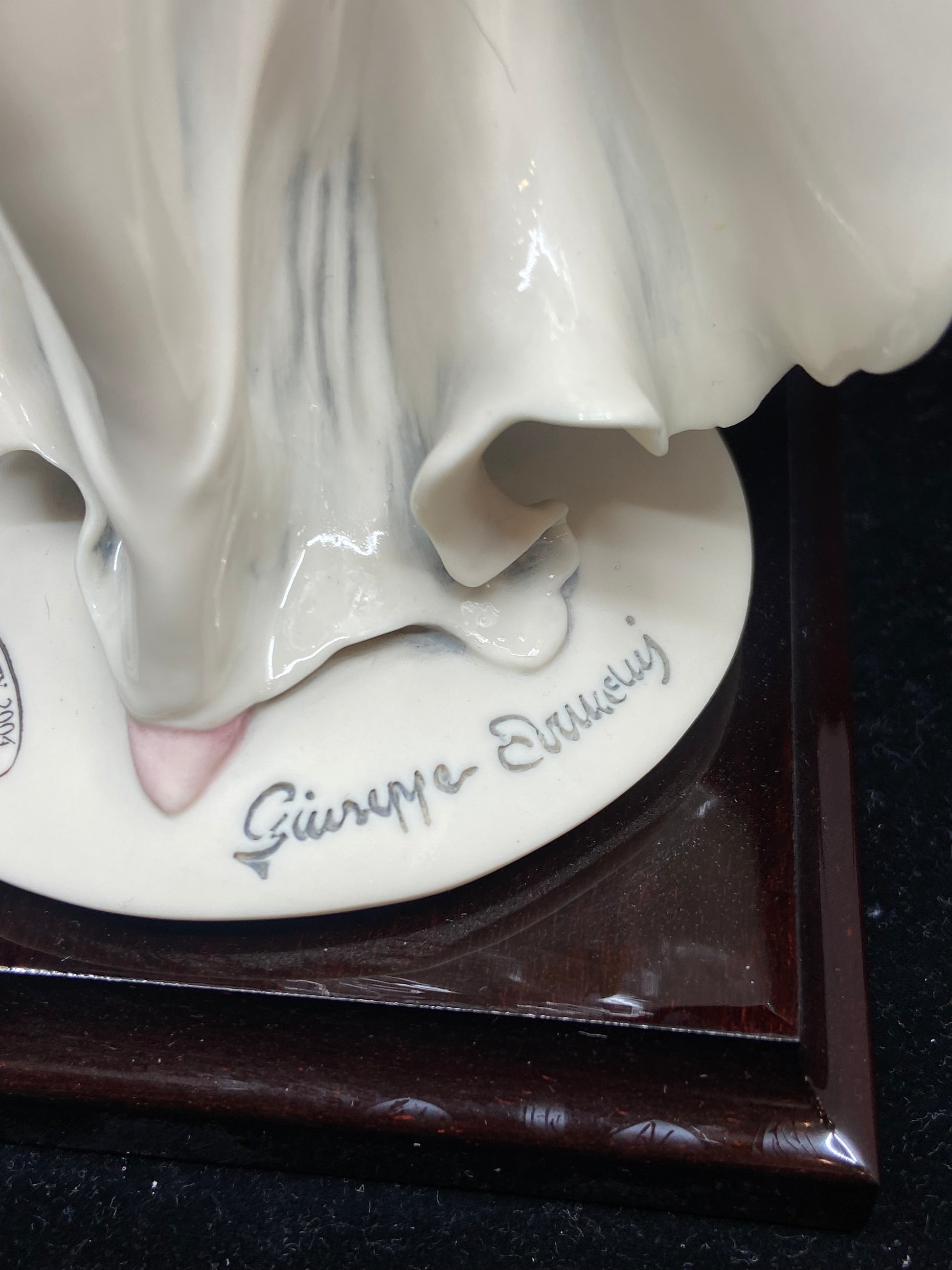 Porcelain sculpture titled "The Messenger of Peace" by Giuseppe Armani. Features a woman in a white flowy dress. She has a large sun hat draped over her shoulder with a dove that just landed on her raised hand. She has short, curly hair with orange flowers in it. The Porcelain sculpture rests on a small wooden platform with a plaque that reads, "Florence Giuseppe Armani"". The base of the figurine is signed marked "2003 Florence". An additional black stamp that reads "The Society 2004 Messenger of Peace Members Figure". This does not include the original box