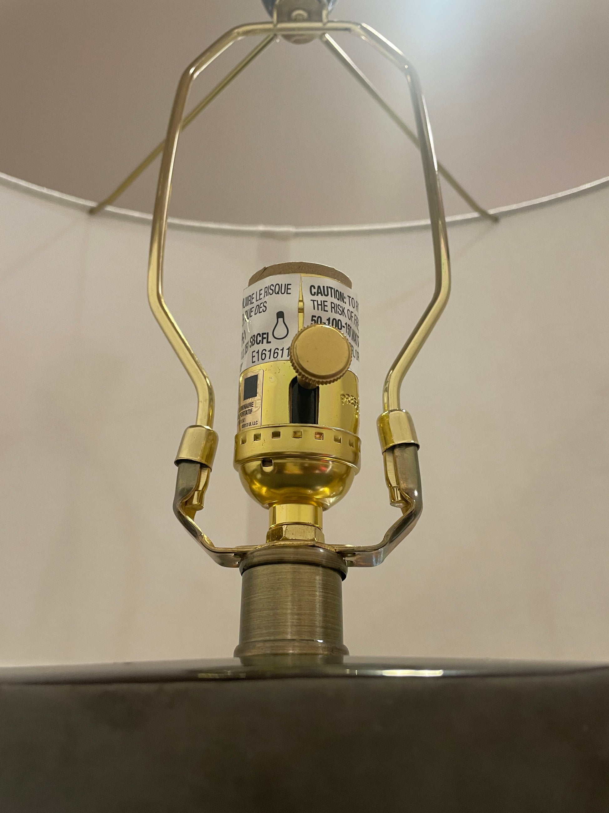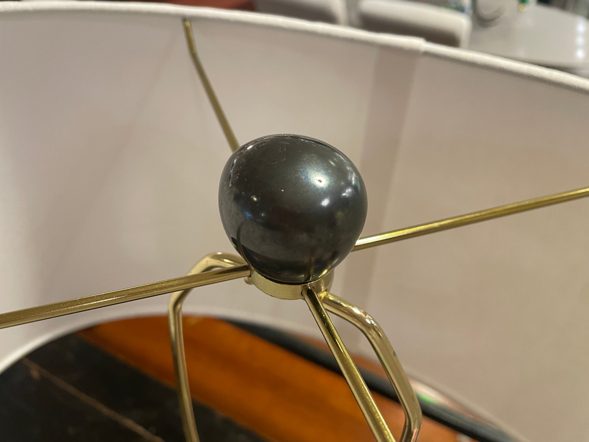 Arteriors "Deagan" blue glazed lamp. This stunning lamp sits on a bronze steel plate which aids in stability for the piece. The vase of the lamp is ceramic and coated with beautiful glazes in shades of gunmetal gray and teal. The lower portion of the vase is teal, and above that is the gray. The border between the two colors is a melting combination of both gray and teal. The lamp is accented with a white linen drum shade in a slender oblong shape, and topped off with a small round black finial. This gorgeous piece is a sophisticated way to add a pop of color to any space.