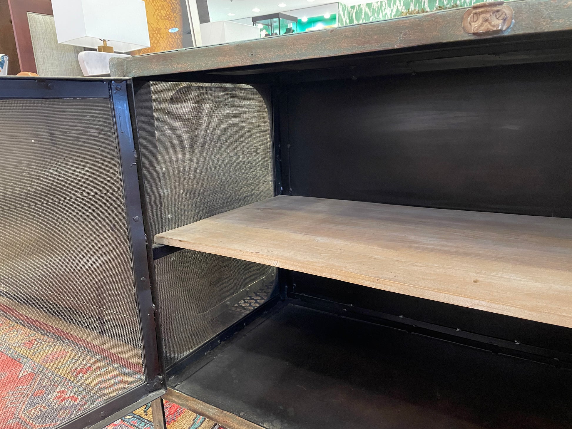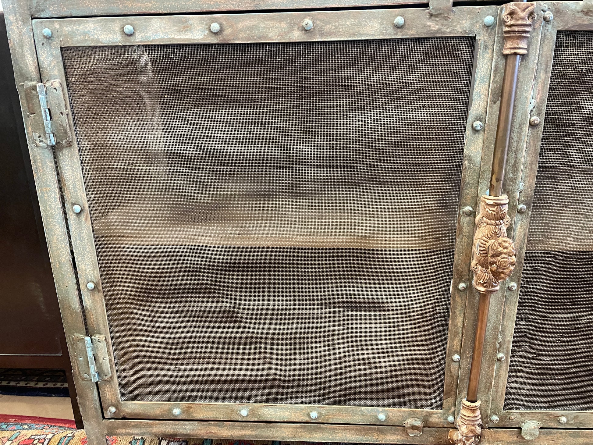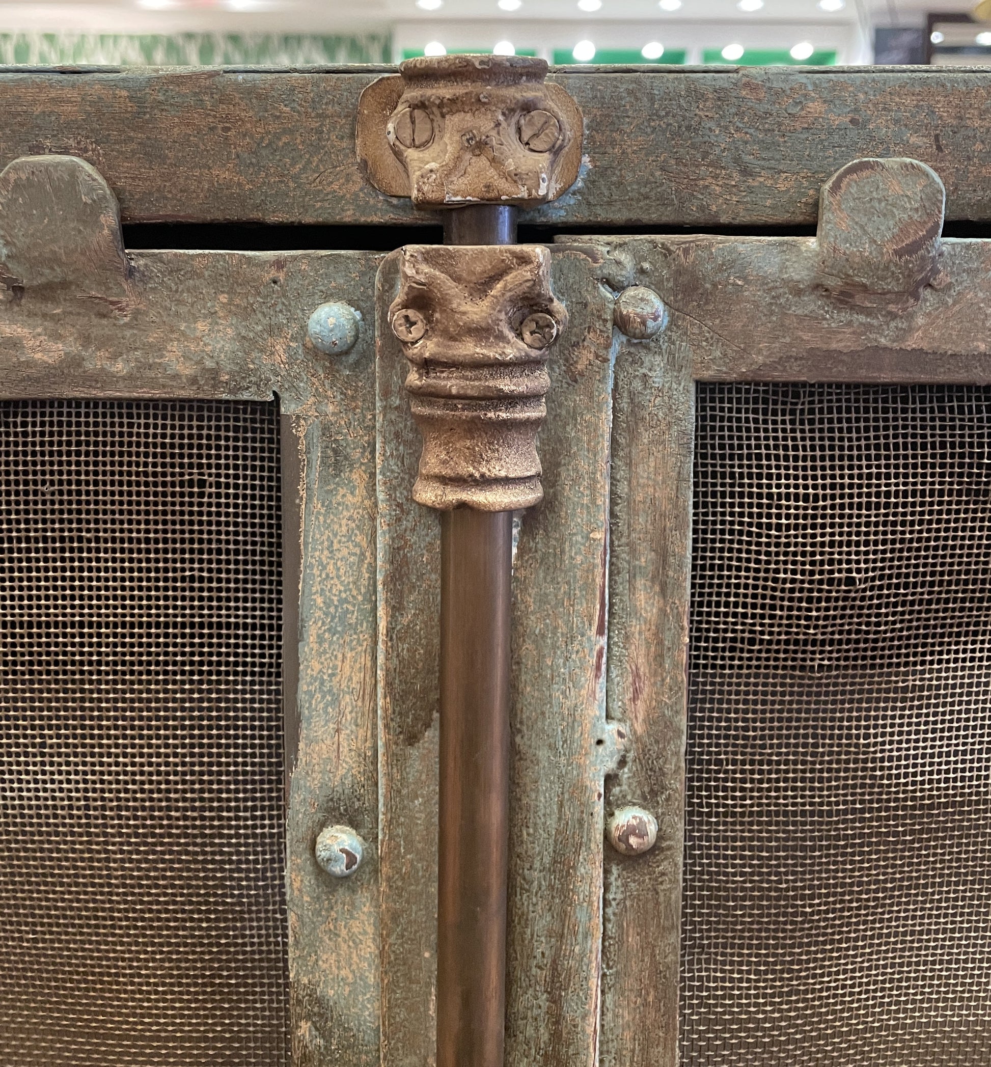 Arteriors Finn cabinet with mesh sides. This beautiful cabinet has a unique design featuring an iron mesh front and sides. The metal frame of the cabinet is a beautiful turquoise color, similar to that of oxidized copper. The outer edge of each side is accented with rivet details, and the entire piece has an eye-catching distressed appearance. The mesh pieces allow for a glimpse of the interior, which can be further revealed by opening the two cabinet doors. The doors are locked and unlocked by turning the single knob in the center of the piece. The knob and connecting pieces are brown and feature ornate details. Inside, the piece has one wooden shelf for additional organization. A gorgeous distressed piece that is sure to add charm to any space.
