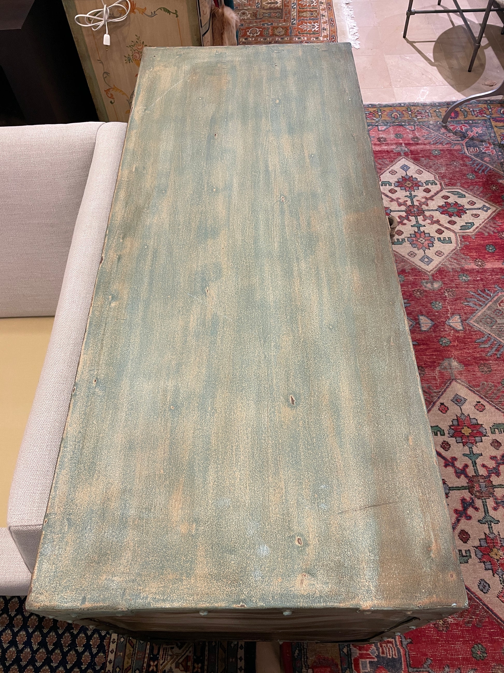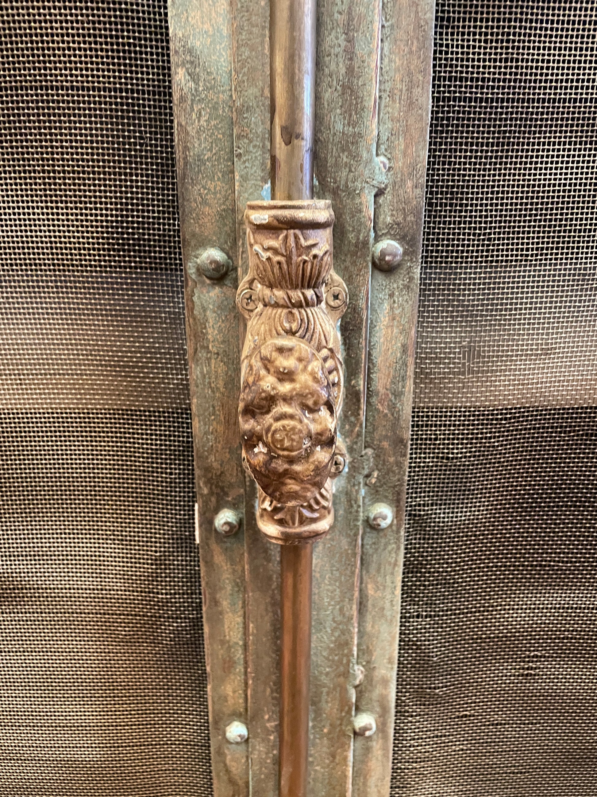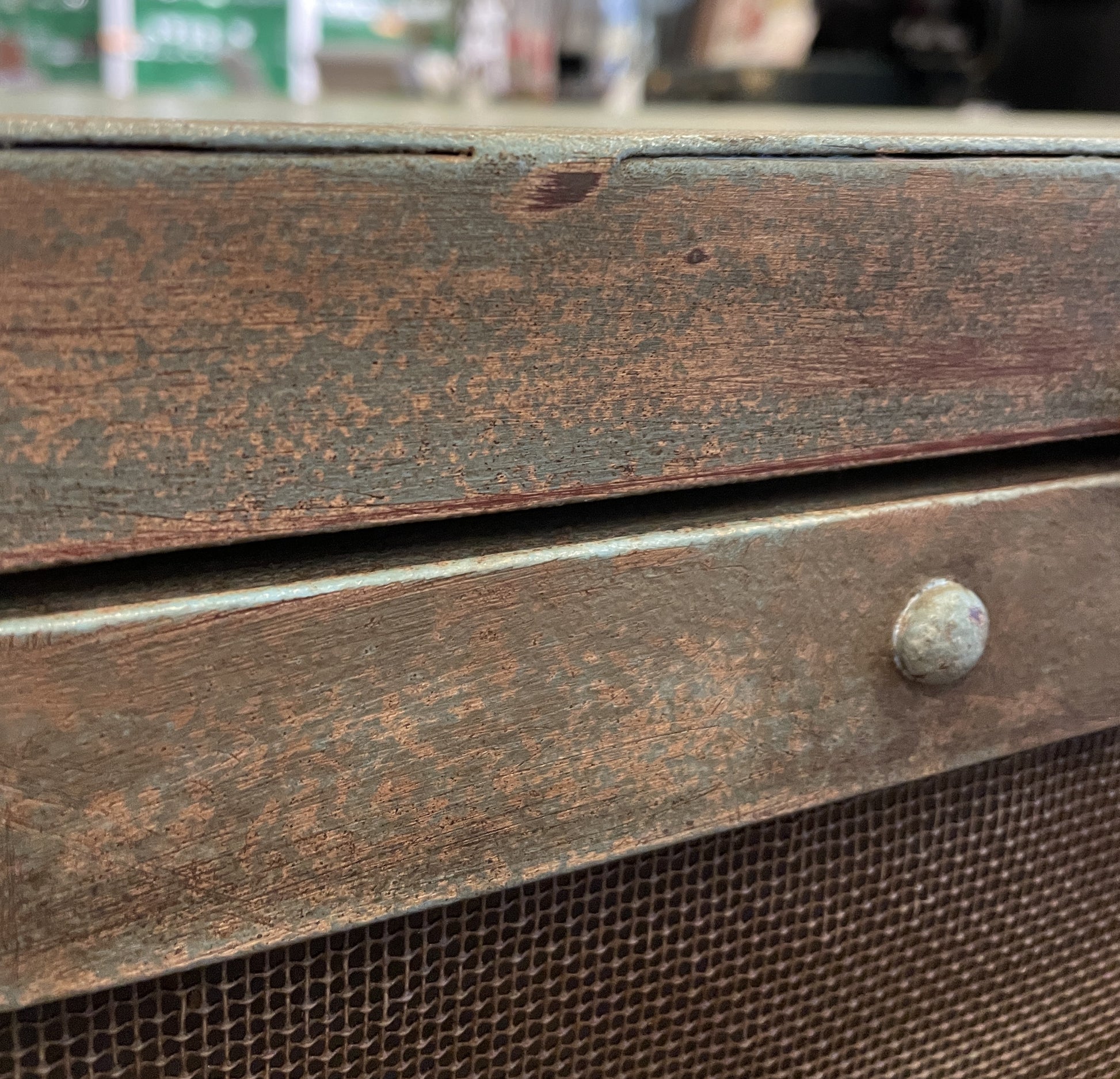 Arteriors Finn cabinet with mesh sides. This beautiful cabinet has a unique design featuring an iron mesh front and sides. The metal frame of the cabinet is a beautiful turquoise color, similar to that of oxidized copper. The outer edge of each side is accented with rivet details, and the entire piece has an eye-catching distressed appearance. The mesh pieces allow for a glimpse of the interior, which can be further revealed by opening the two cabinet doors. The doors are locked and unlocked by turning the single knob in the center of the piece. The knob and connecting pieces are brown and feature ornate details. Inside, the piece has one wooden shelf for additional organization. A gorgeous distressed piece that is sure to add charm to any space.