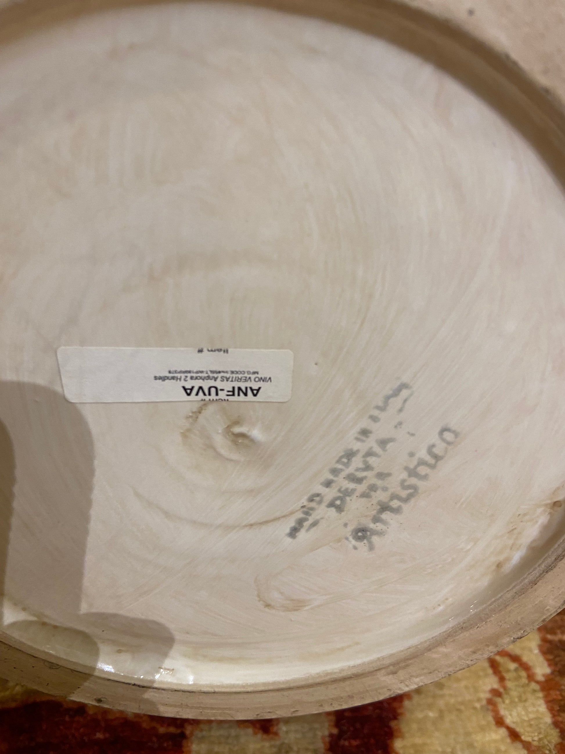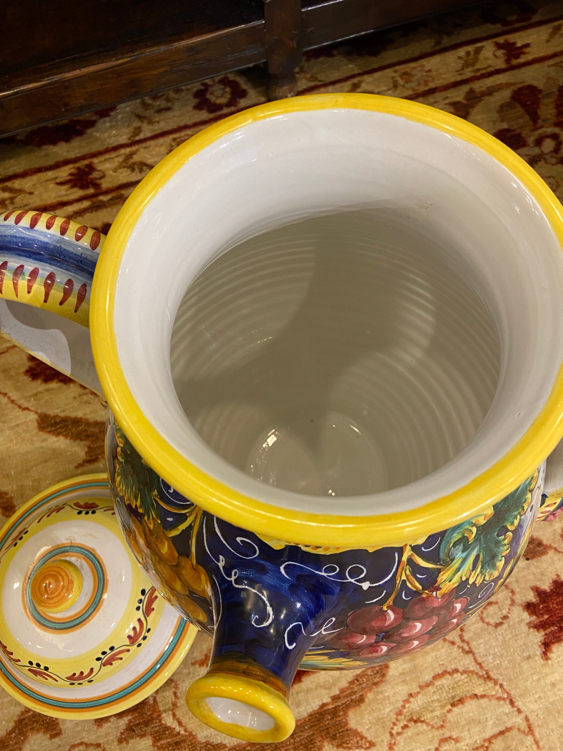 Large lidded pitcher with side handles and a front spout, handmade in Italy and hand painted. Features a blue design with gold and red patterning and yellow and purple grapes with green leaves. Marked Artistica on the bottom of the pitcher.