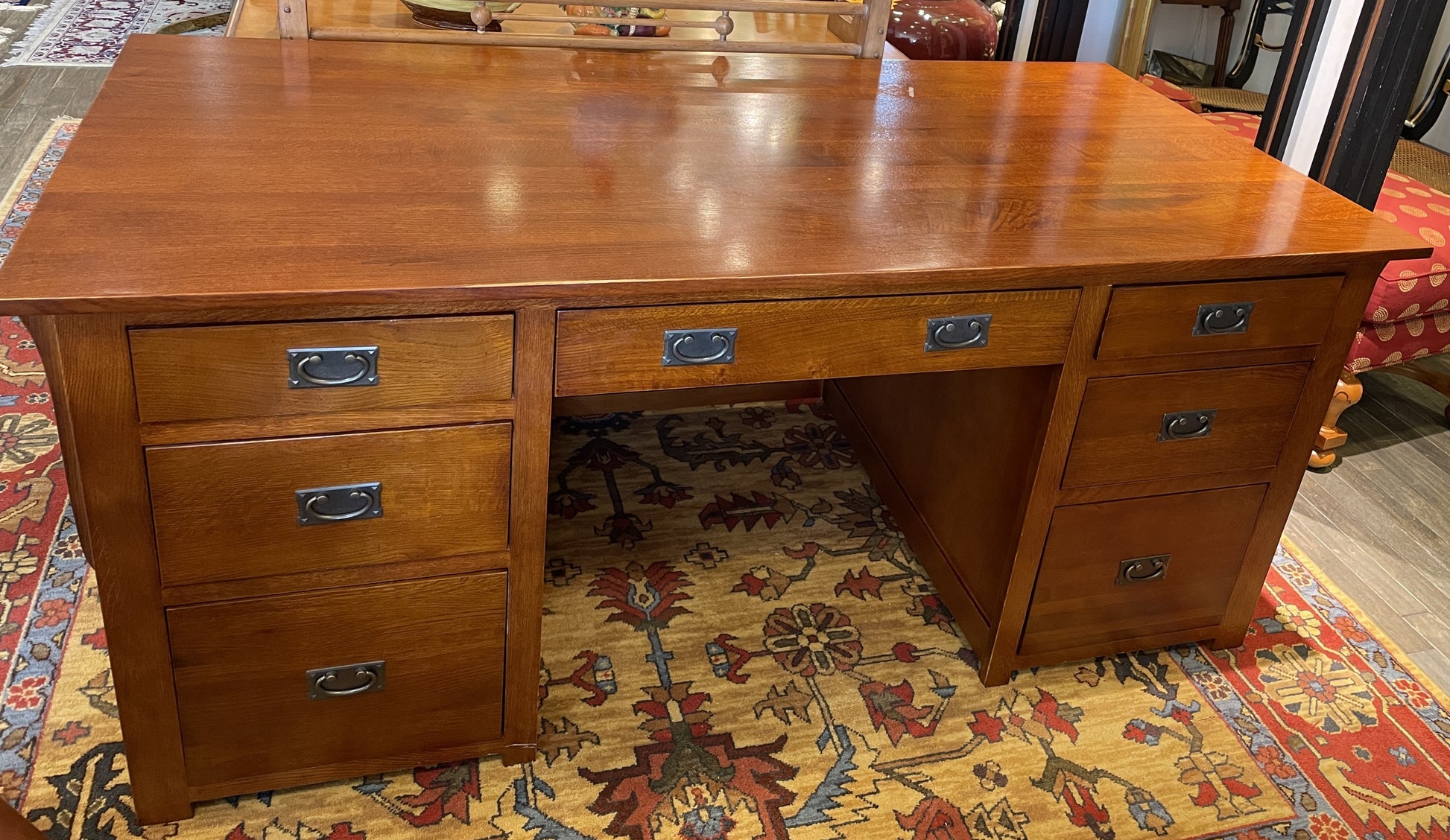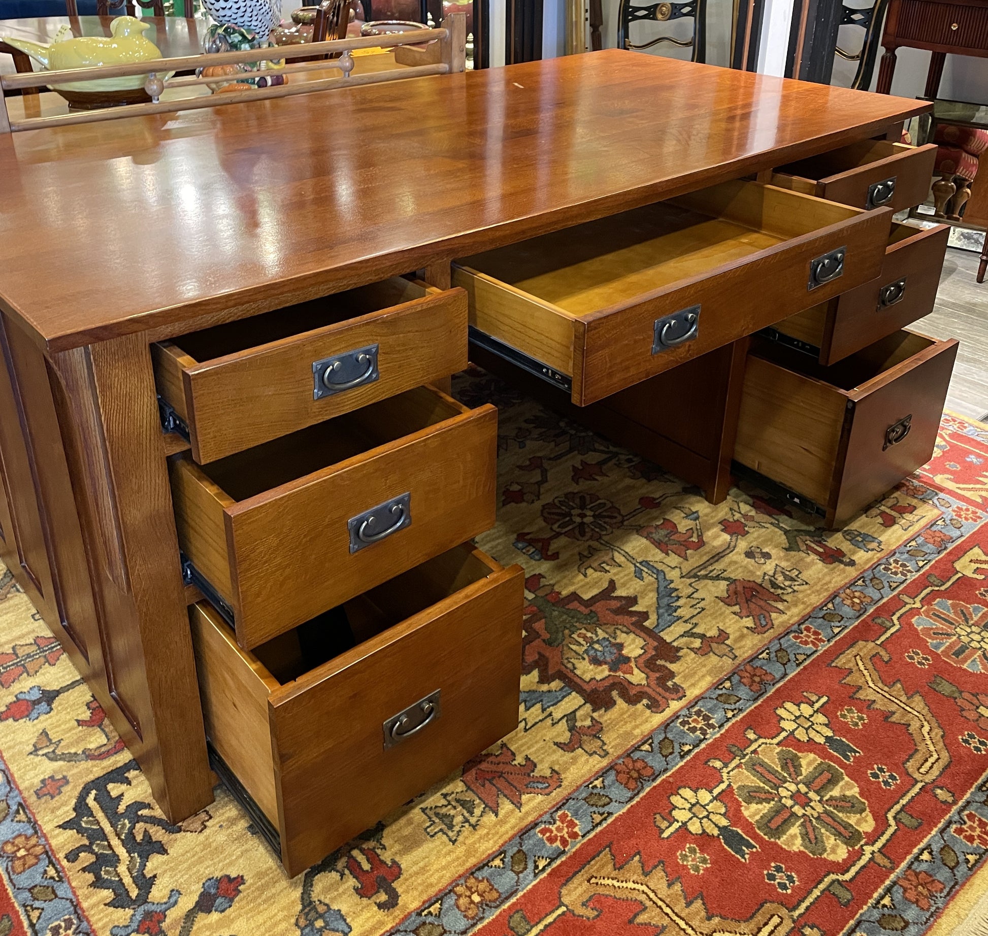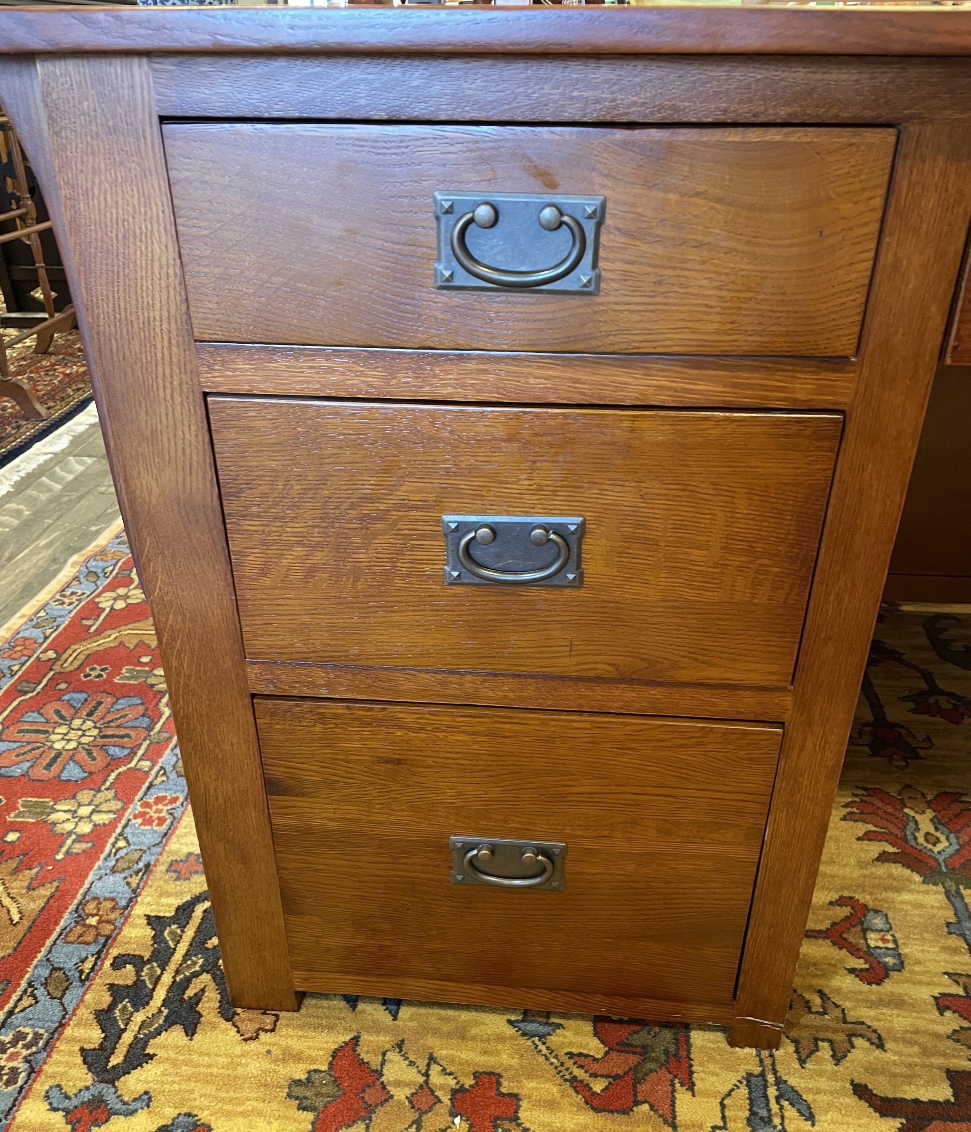 Arts and crafts style wooden desk. Features solid oak wood construction in a medium brown stain. The desk contains 7 drawers with a lower file drawer on each side, two medium drawers, two small drawers, and an elongated center drawer. There are paneled sides and missions style pulls. A beautiful, large desk with ample storage and surface space to create the ideal office setup!