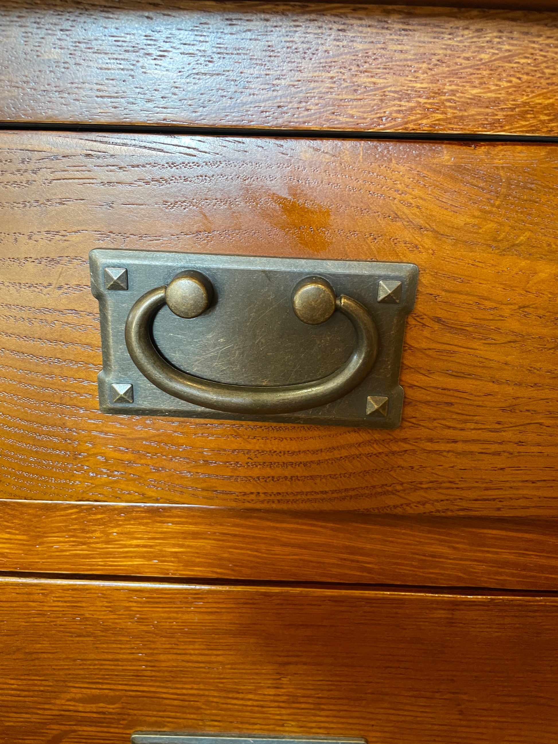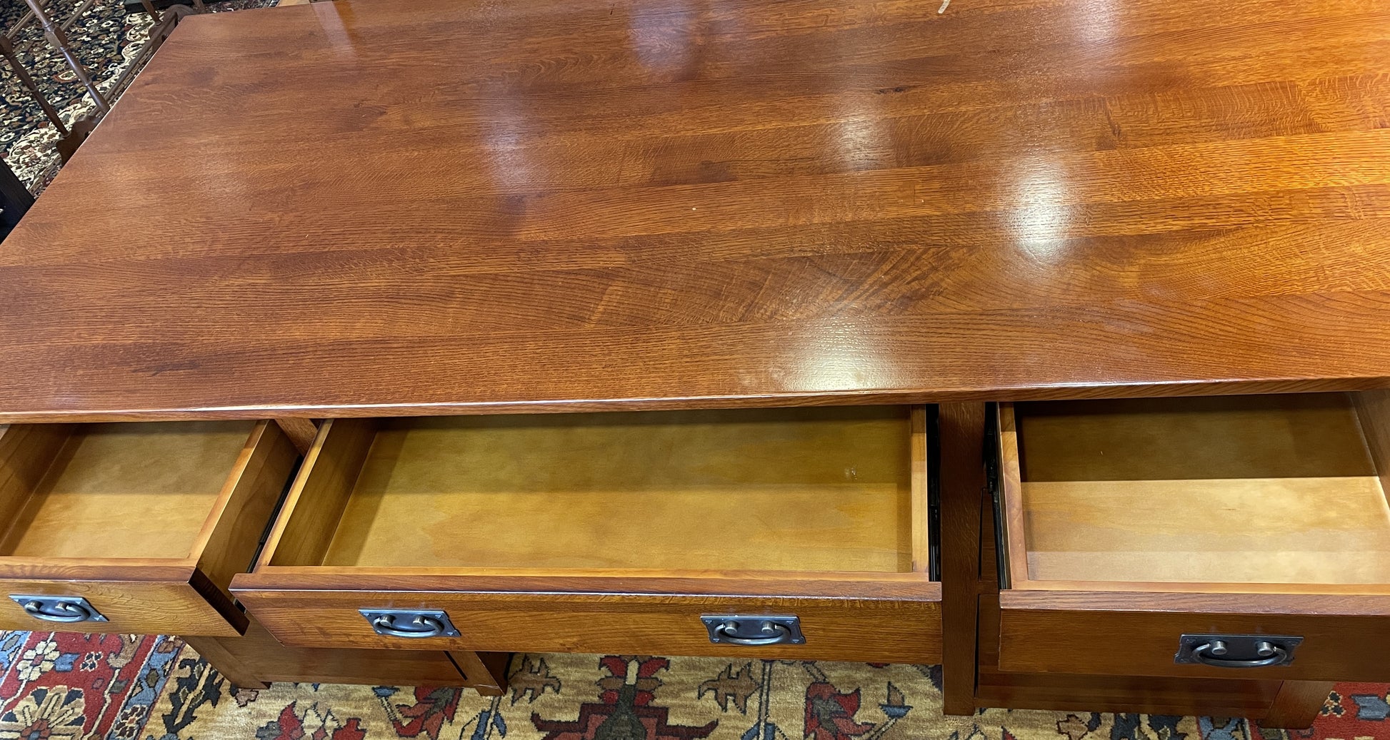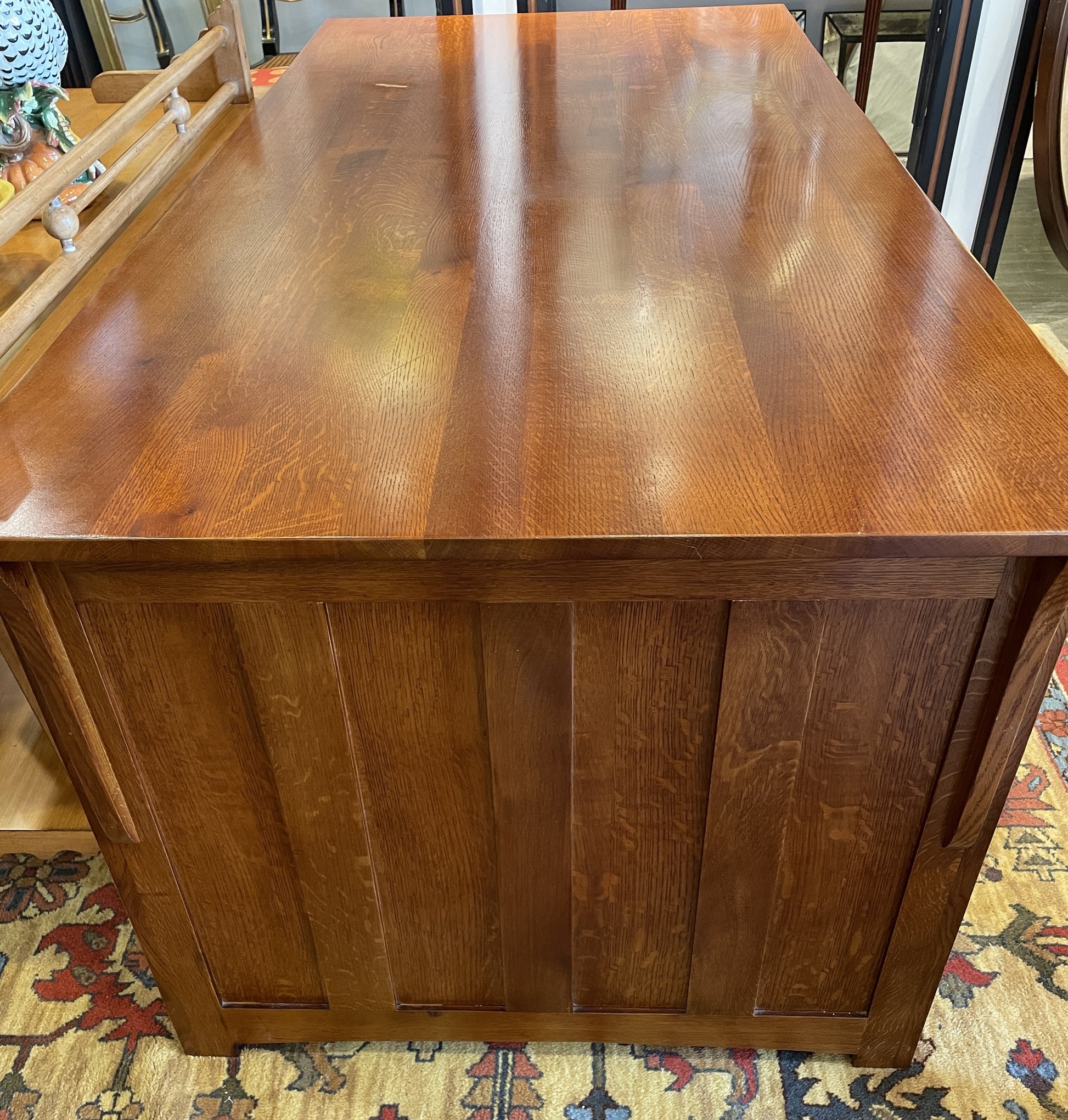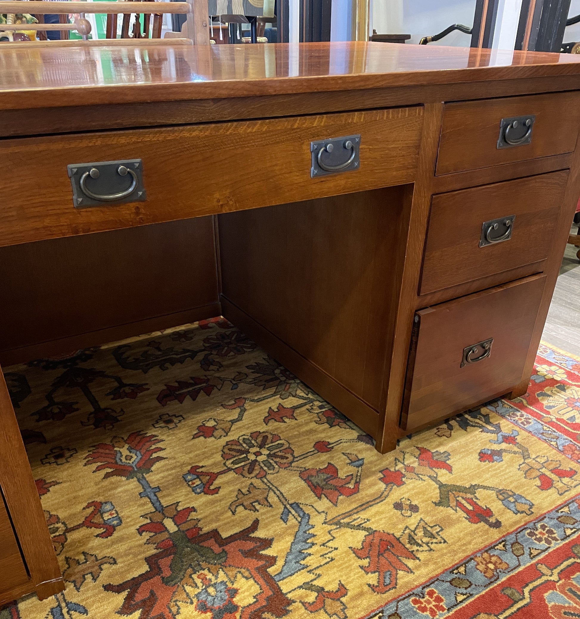 Arts and crafts style wooden desk. Features solid oak wood construction in a medium brown stain. The desk contains 7 drawers with a lower file drawer on each side, two medium drawers, two small drawers, and an elongated center drawer. There are paneled sides and missions style pulls. A beautiful, large desk with ample storage and surface space to create the ideal office setup!
