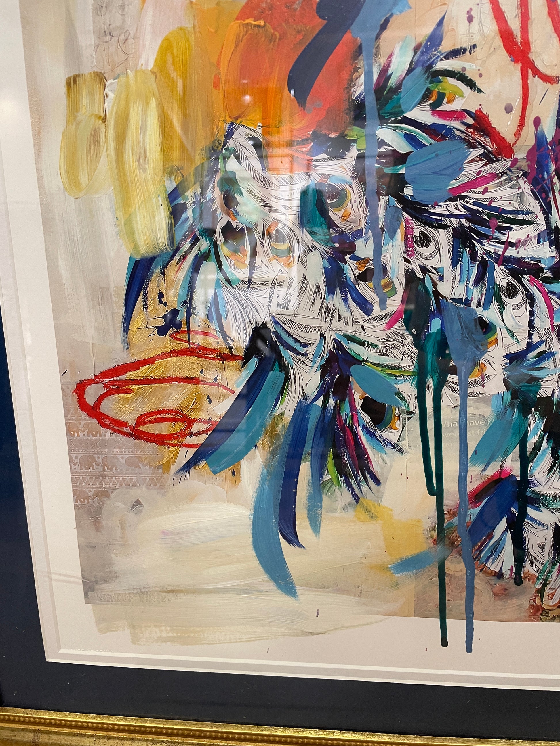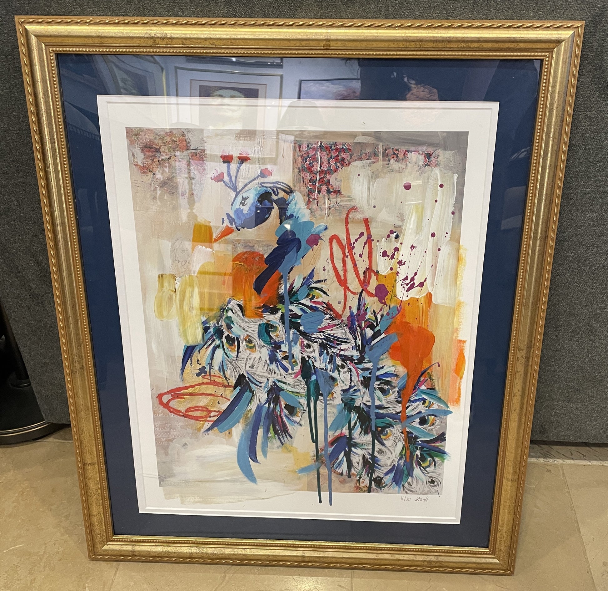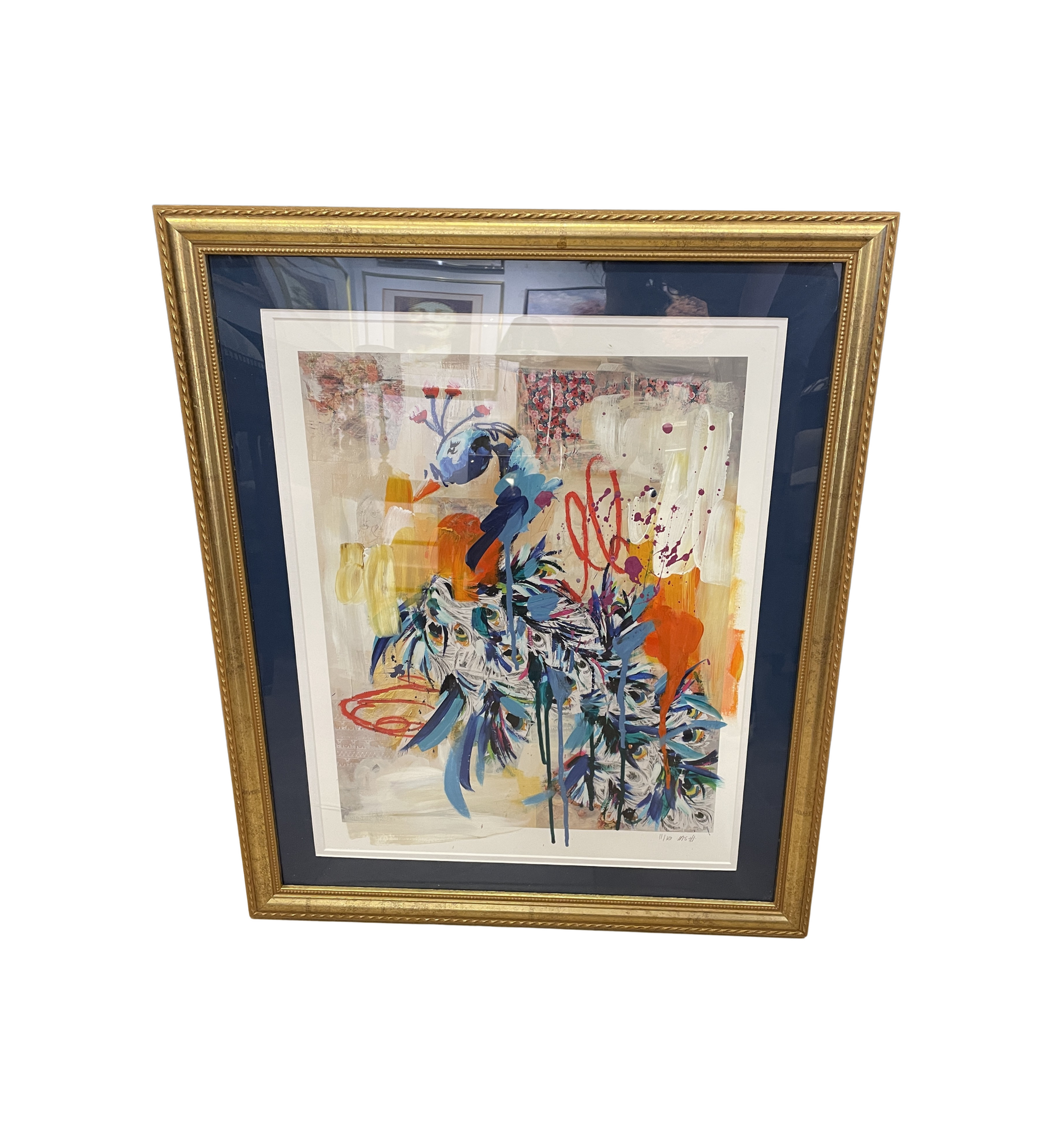 Ash Alamonte peacock print of a mixed media painting titled "Achievements" (11/12). Signed and numbered lower right. This beautiful mixed media piece is an abstract rendition of a peacock. The art is composed of streaks and drips of primarily blue, yellow, and red, with hints of green, and a neutral background. The piece is matted in teal and framed with a thin gold frame. Distinctive and bright, this beautiful mixed media piece is sure to liven up a room.