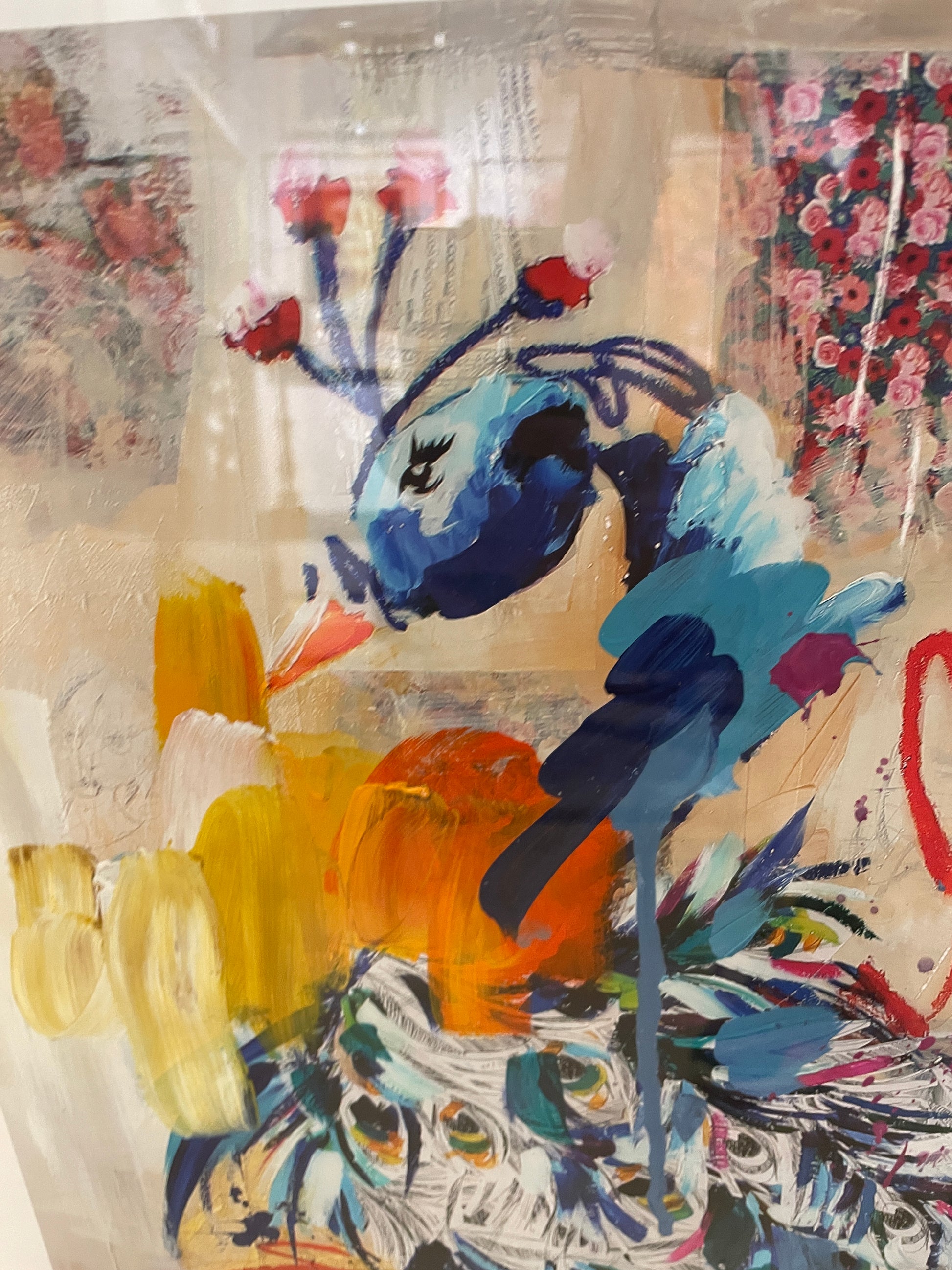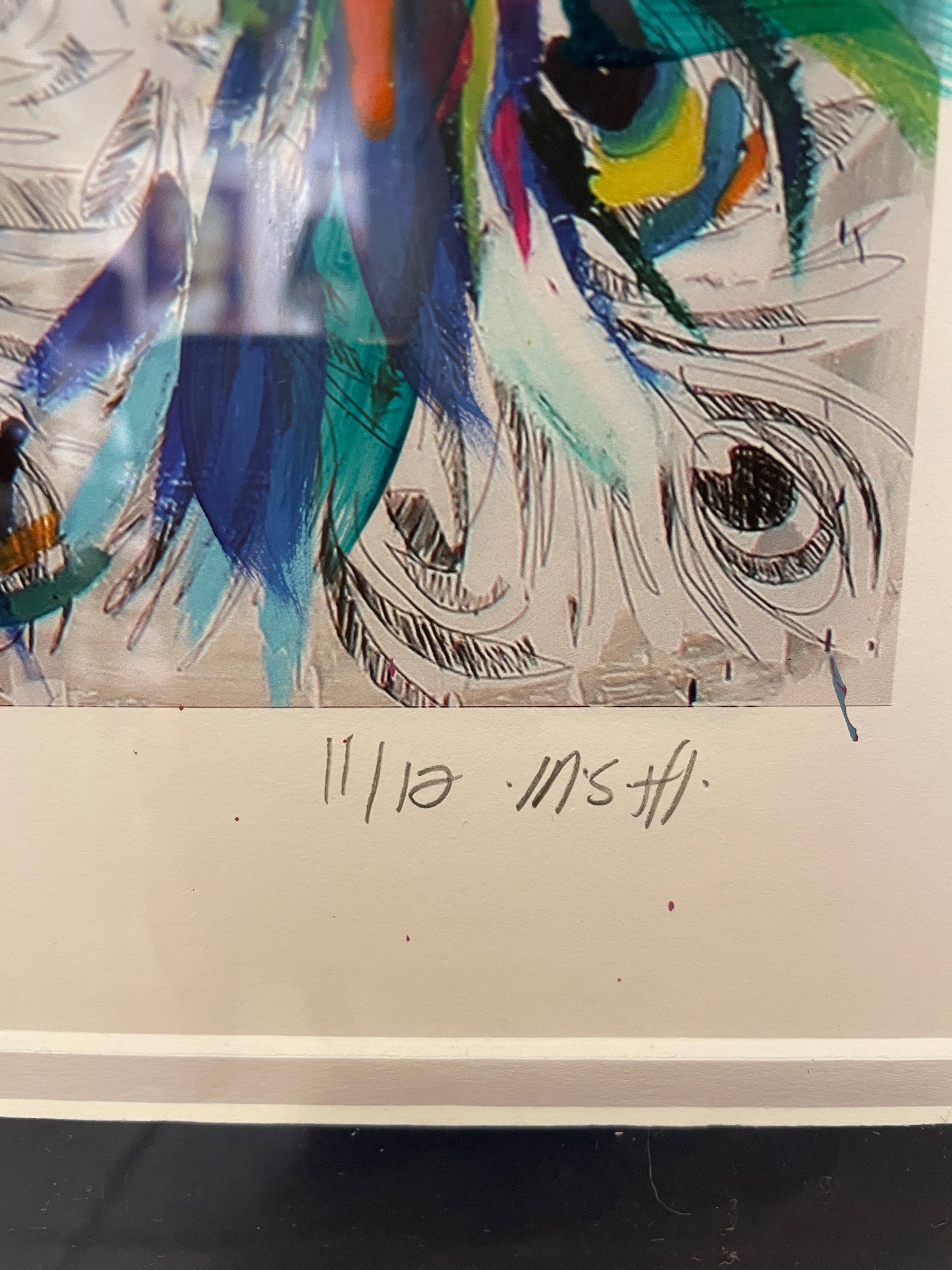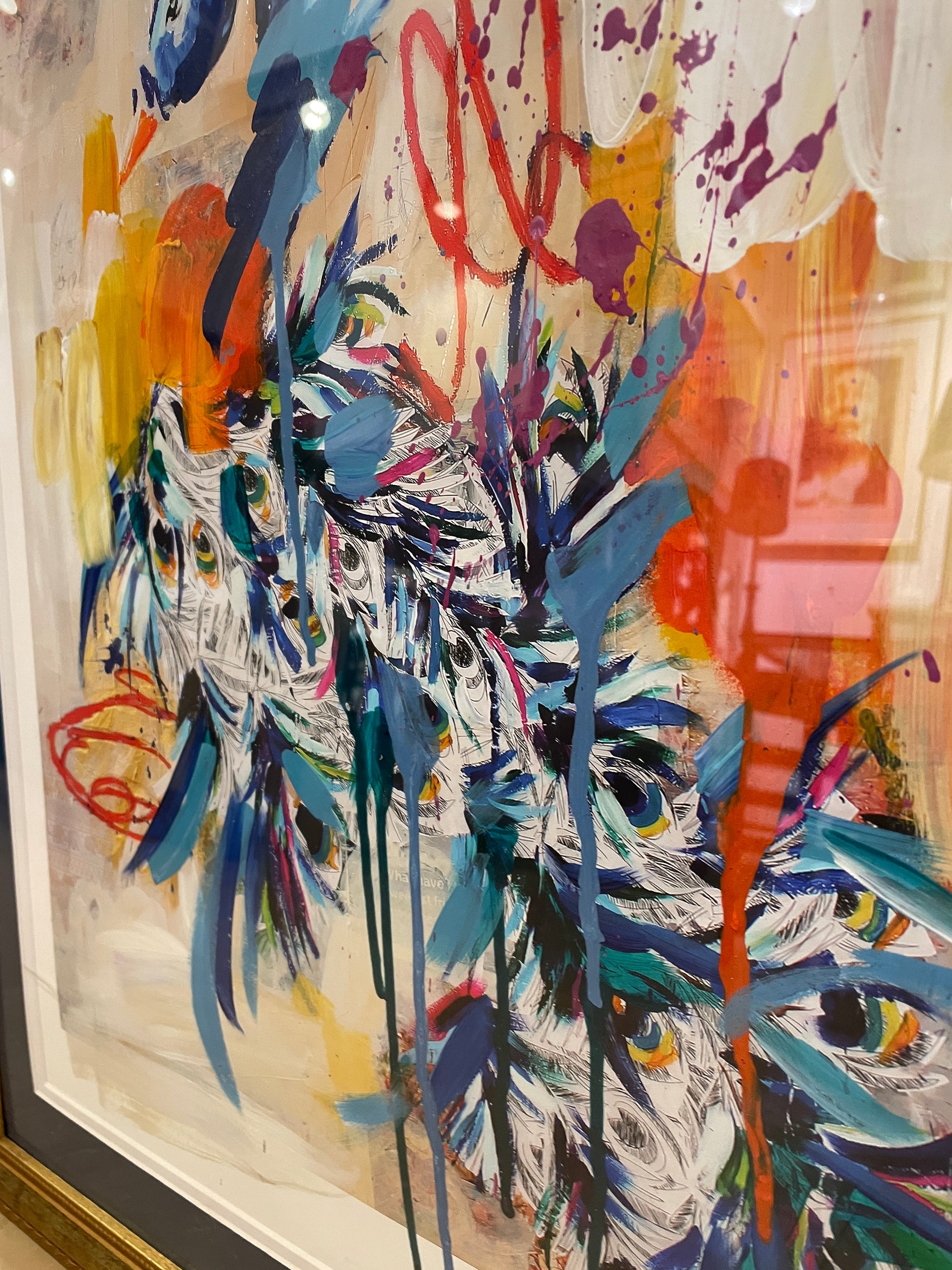 Ash Alamonte peacock print of a mixed media painting titled "Achievements" (11/12). Signed and numbered lower right. This beautiful mixed media piece is an abstract rendition of a peacock. The art is composed of streaks and drips of primarily blue, yellow, and red, with hints of green, and a neutral background. The piece is matted in teal and framed with a thin gold frame. Distinctive and bright, this beautiful mixed media piece is sure to liven up a room.