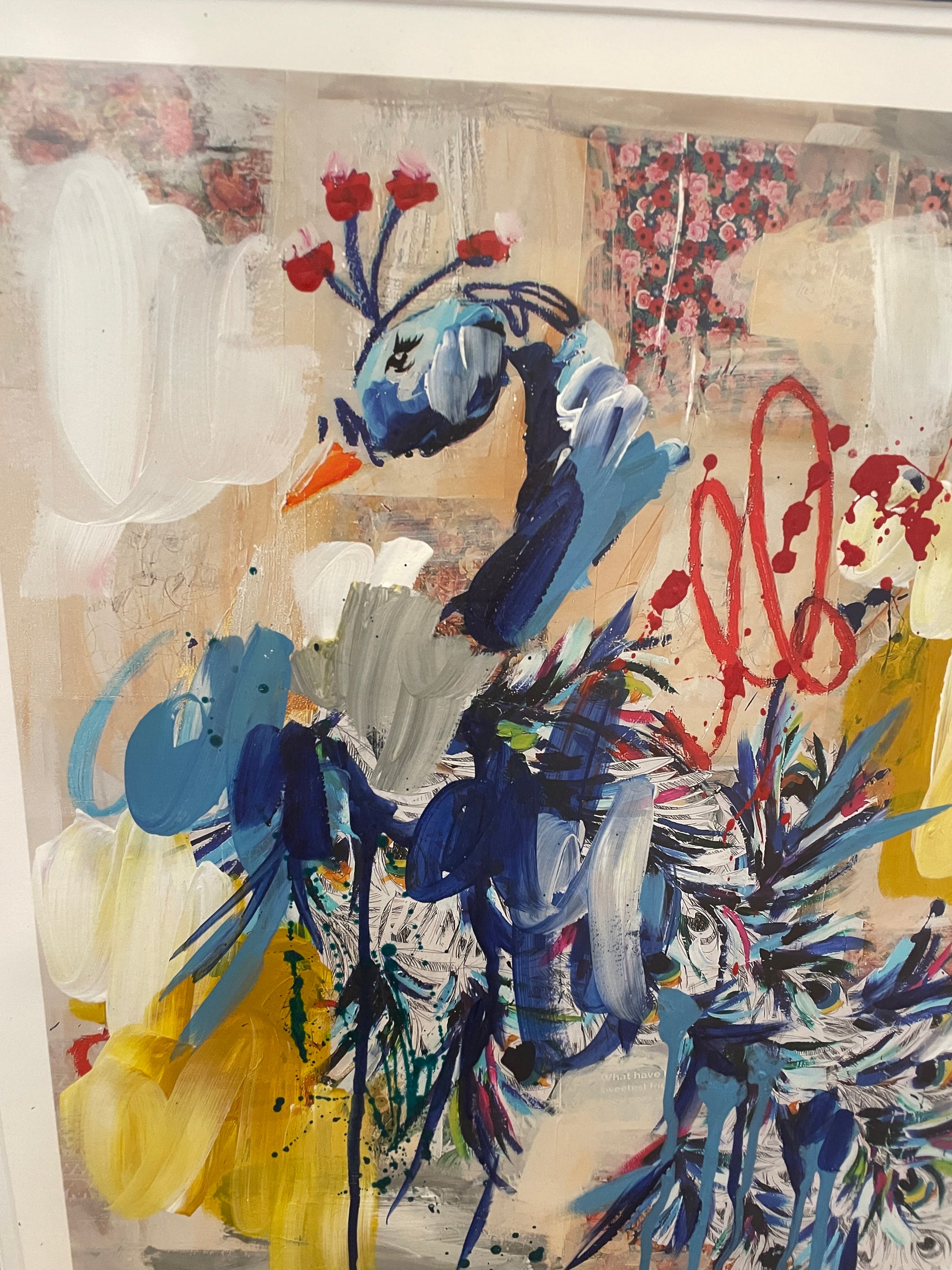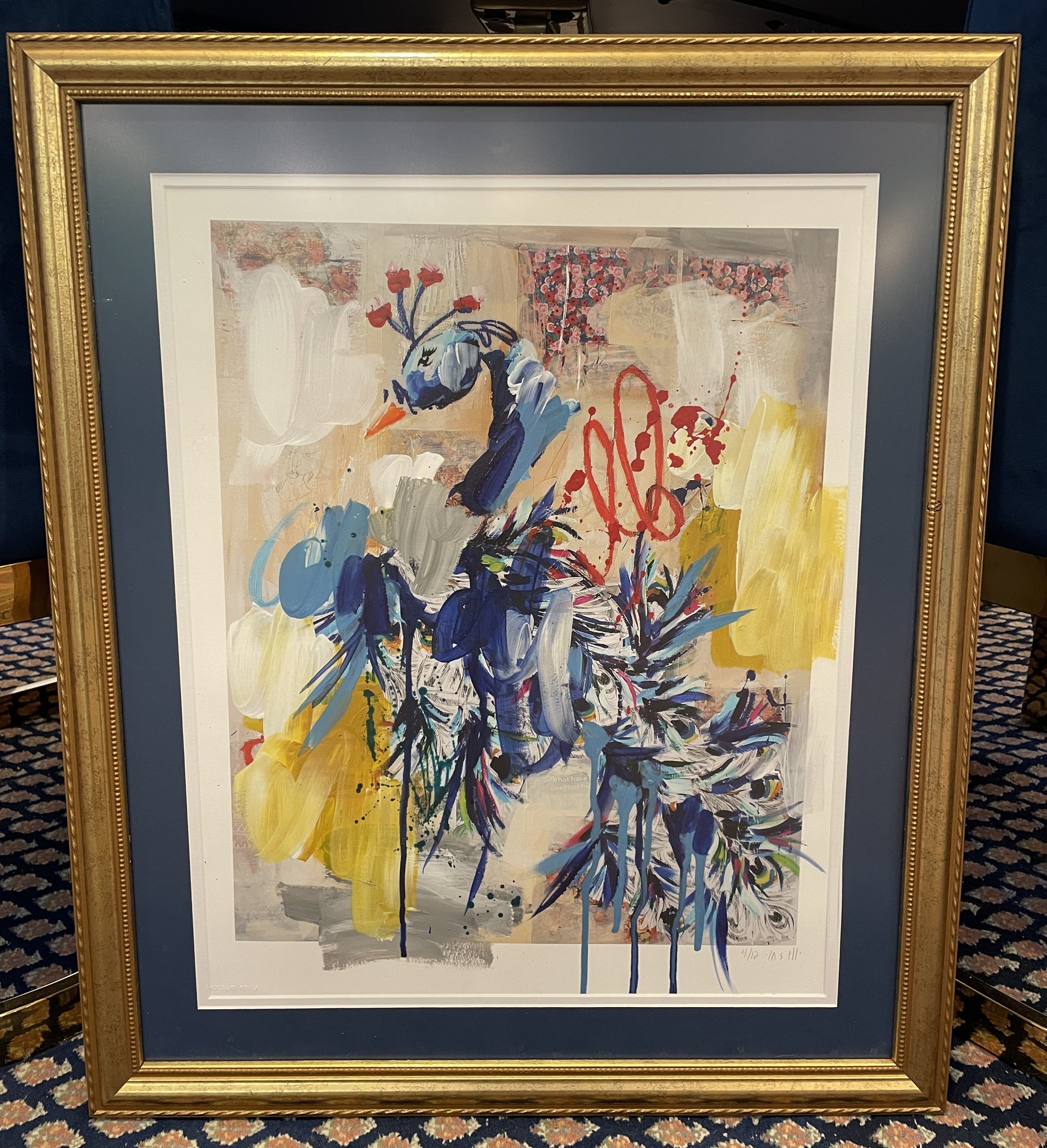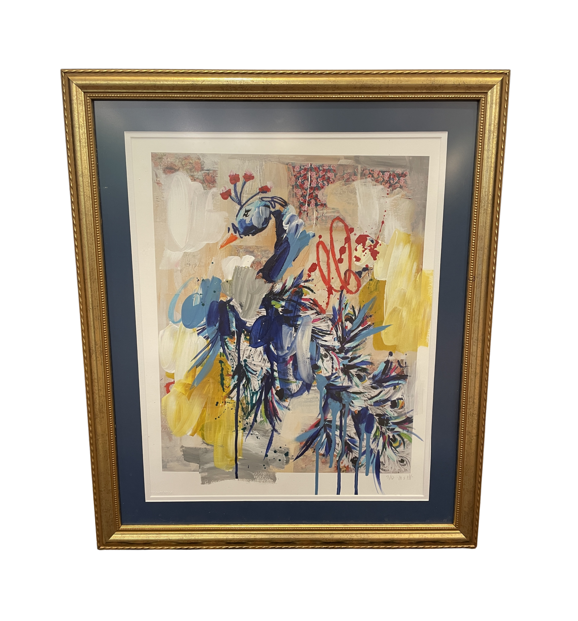 Ash Alamonte peacock print of a mixed media painting titled "Achievements" (4/12). Signed and numbered lower right. This beautiful mixed media piece is an abstract rendition of a peacock. The art is composed of streaks and drips of primarily blue, yellow, and red, with hints of green, and a neutral background. The piece is matted in teal and framed with a thin gold frame. Distinctive and bright, this beautiful mixed media piece is sure to liven up a room.