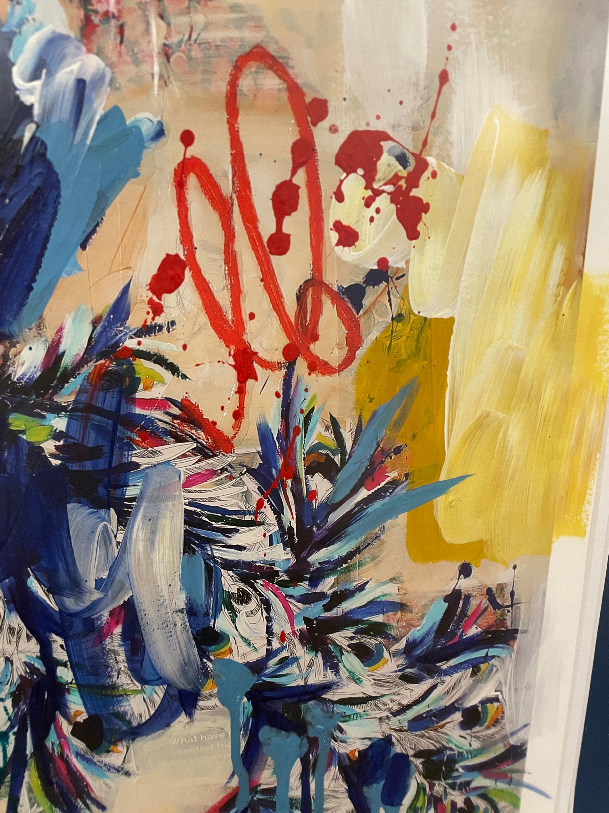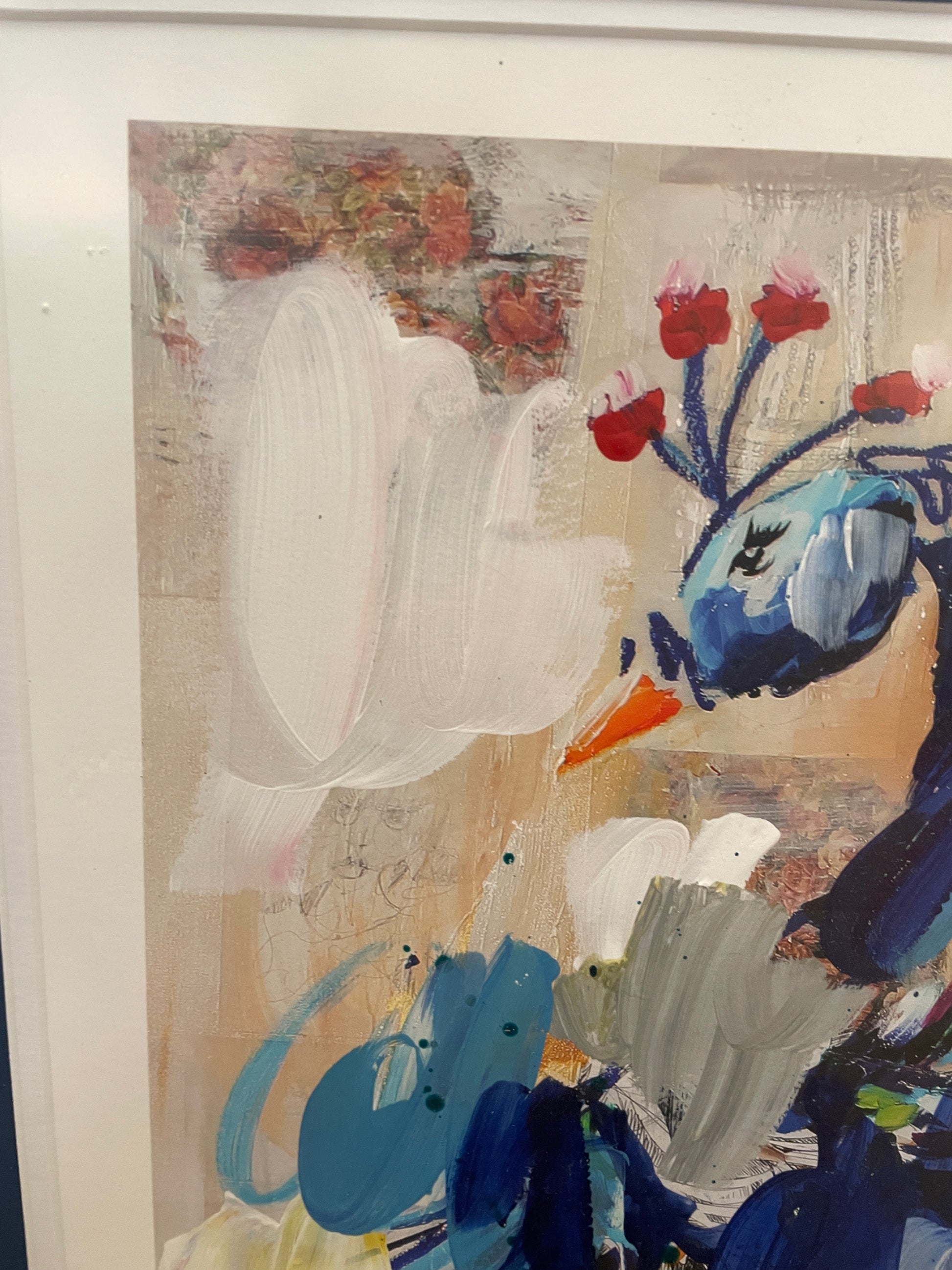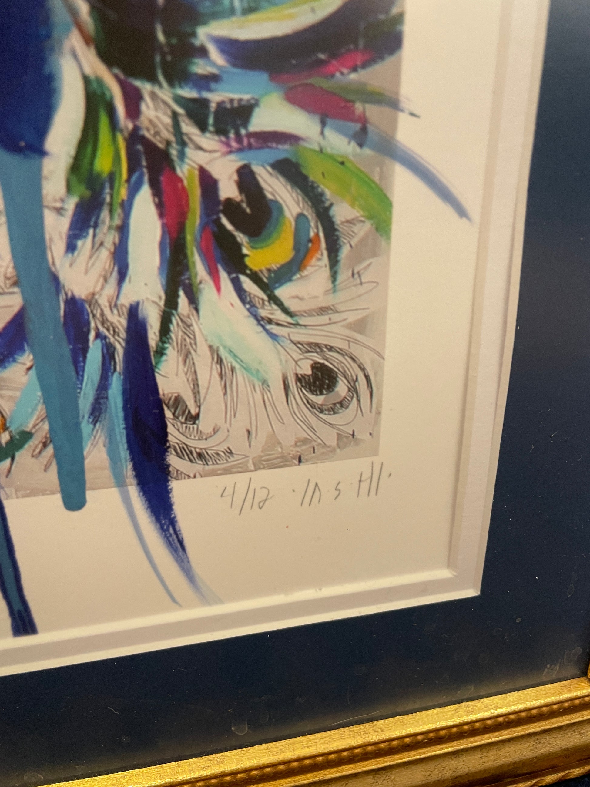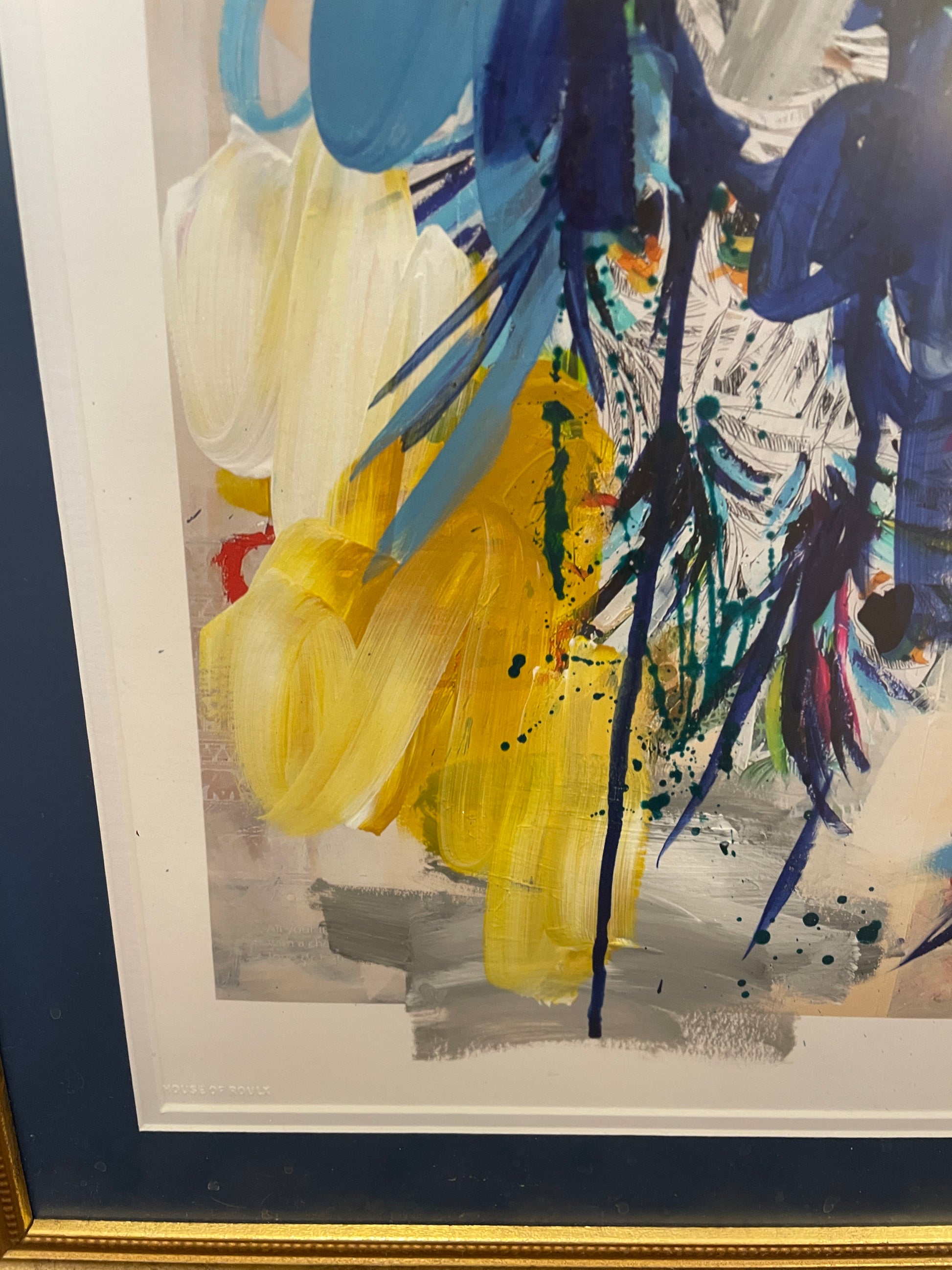 Ash Alamonte peacock print of a mixed media painting titled "Achievements" (4/12). Signed and numbered lower right. This beautiful mixed media piece is an abstract rendition of a peacock. The art is composed of streaks and drips of primarily blue, yellow, and red, with hints of green, and a neutral background. The piece is matted in teal and framed with a thin gold frame. Distinctive and bright, this beautiful mixed media piece is sure to liven up a room.