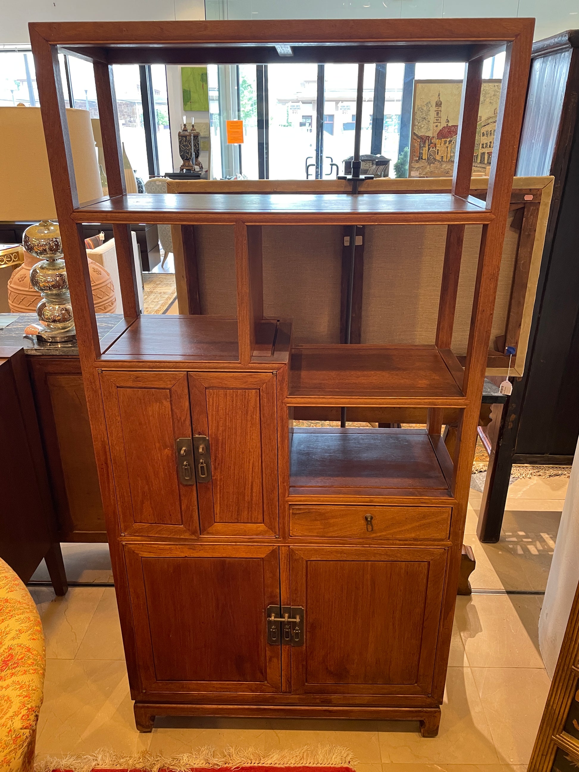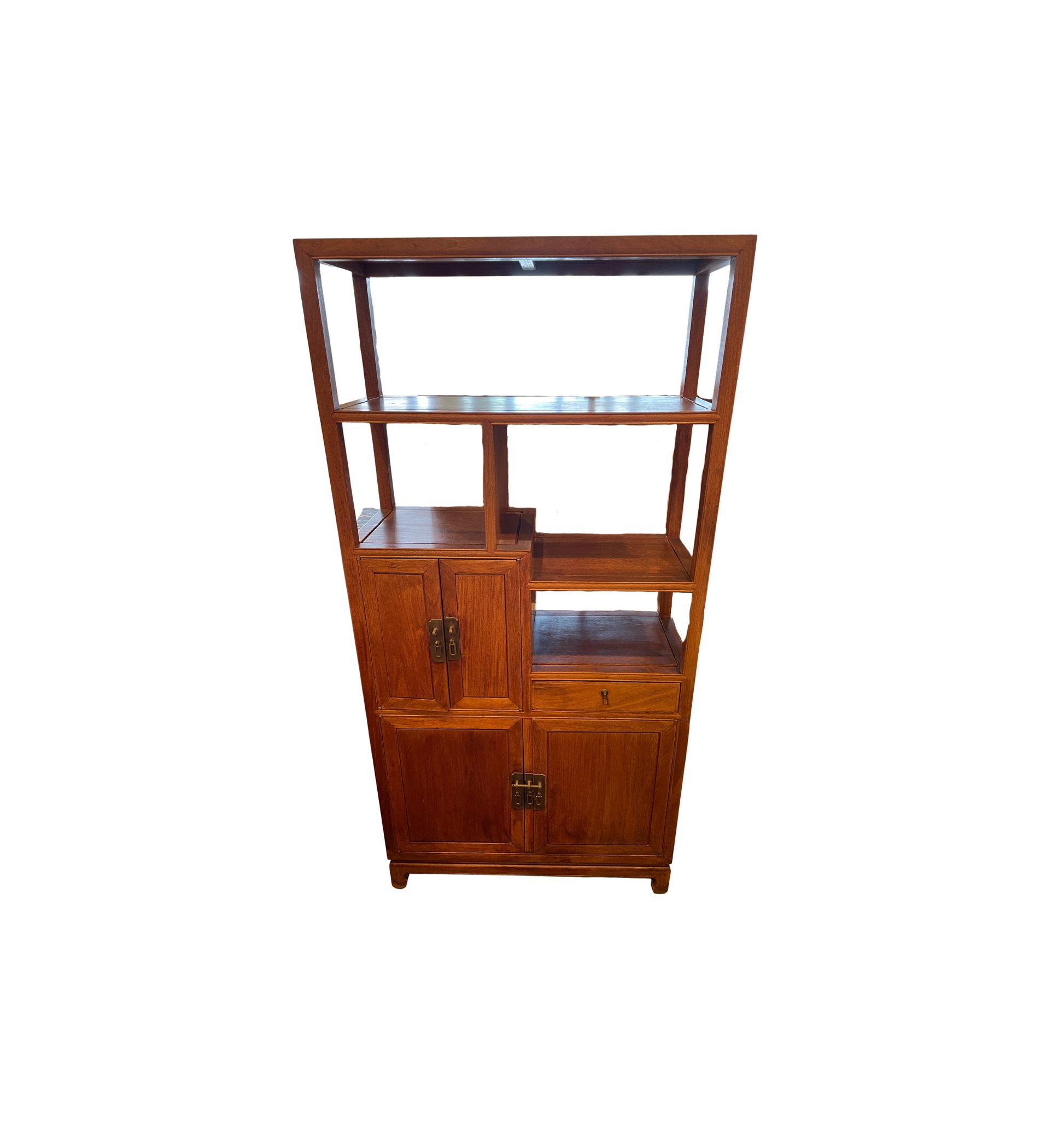 Wooden Asian dual-side etagere. This historically-styled curio cabinet is made of rosewood and is adorned with brass hardware. The top portion features open shelves, and the bottom contains three compartments of varying sizes that can be accessed from both sides. The hardware includes brass pins that keep the cabinets closed. The cabinet is a versatile display that can be used to store and showcase prized items.