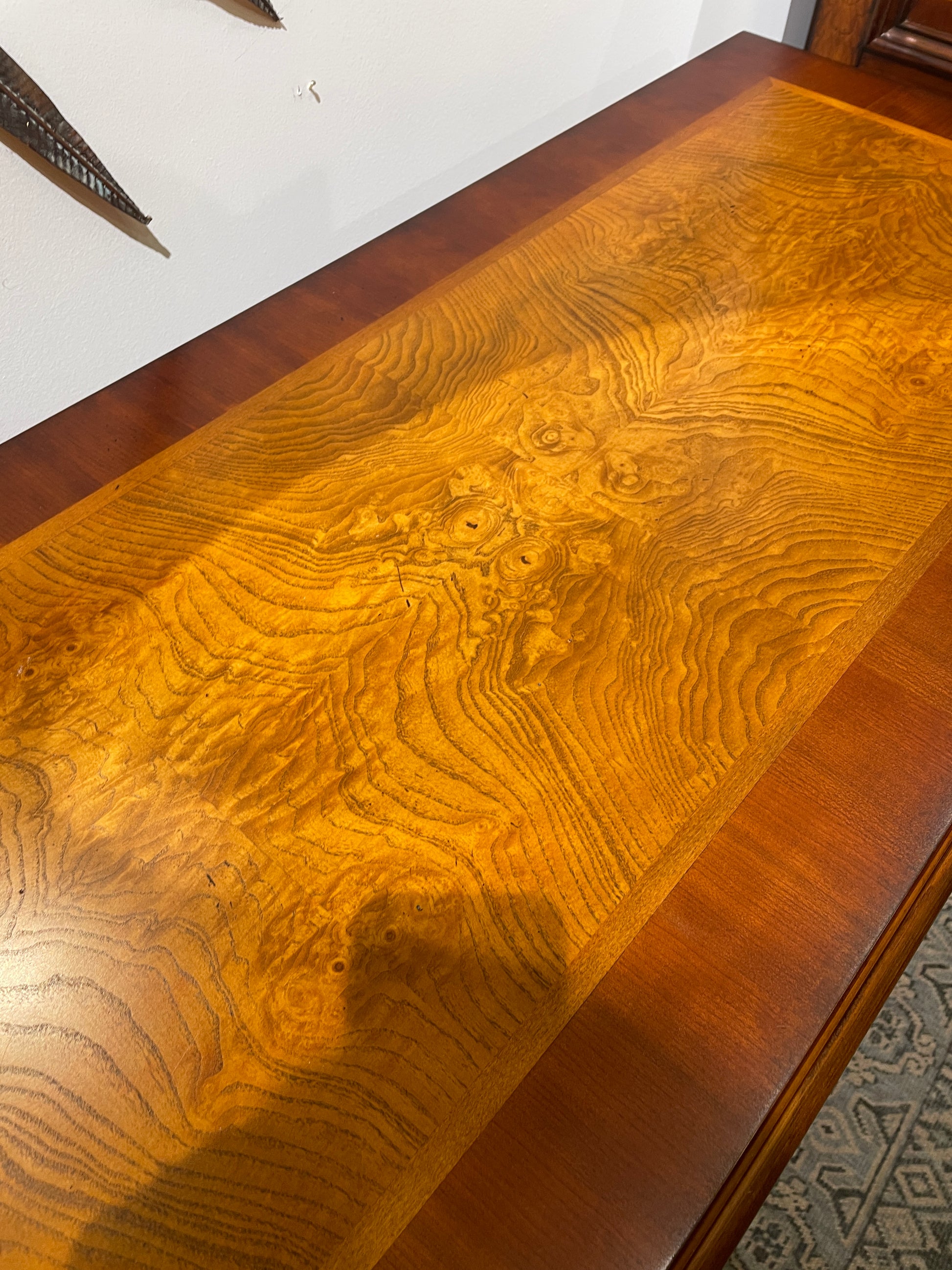 Aspenhome dresser. This gorgeous dresser crafted from medium toned wood features eight drawers, each of which has one pull handle in antique brass. The top of the dresser has a sleek inlay design that includes a lighter and warmer toned wood. The piece sits on very short legs that lift it ever so slightly off the ground. The dresser is further accented with carved details including twists and grape details that adorn the corners. A stunning piece full of charm and functionality sure to elevate any space.