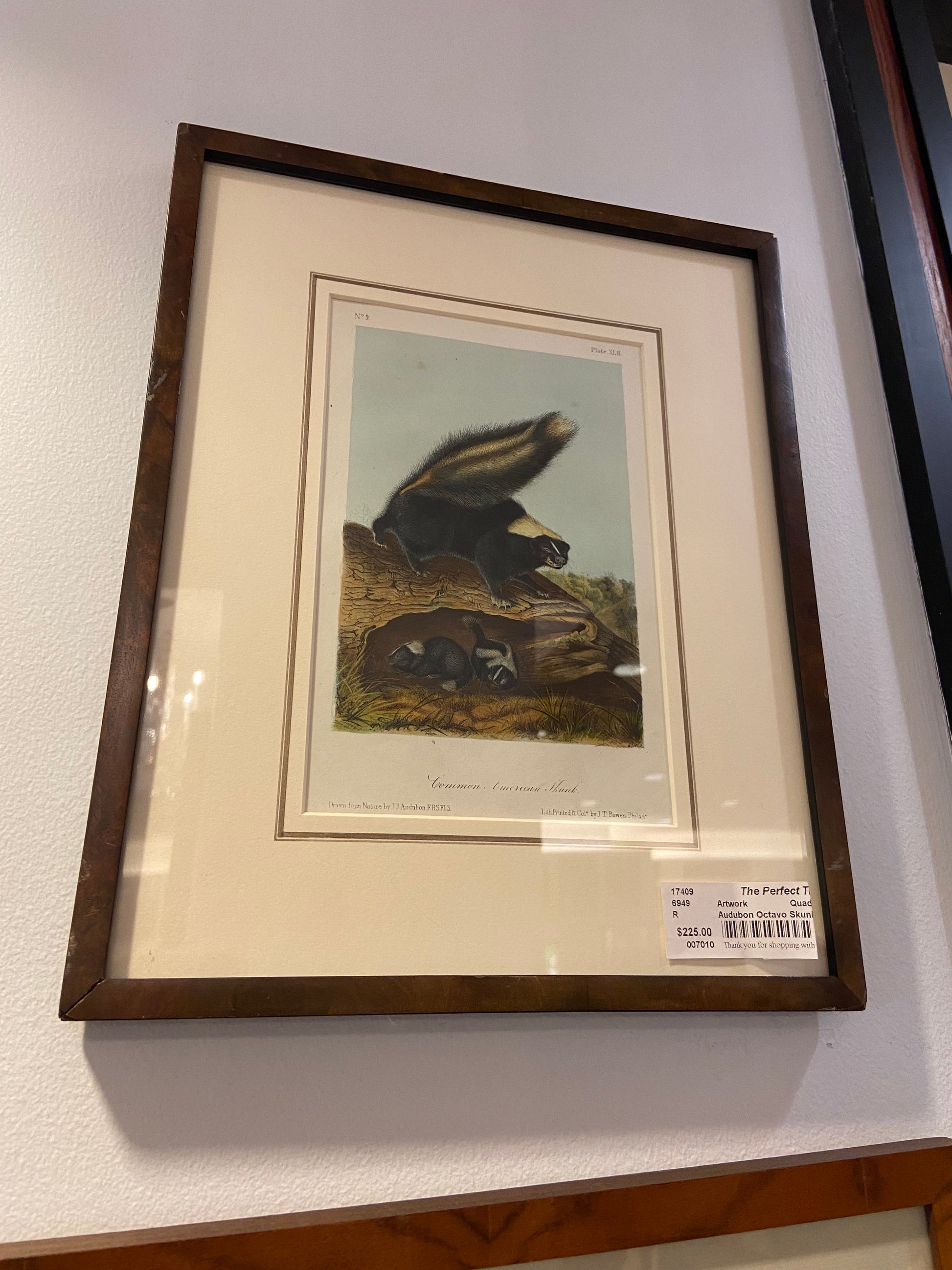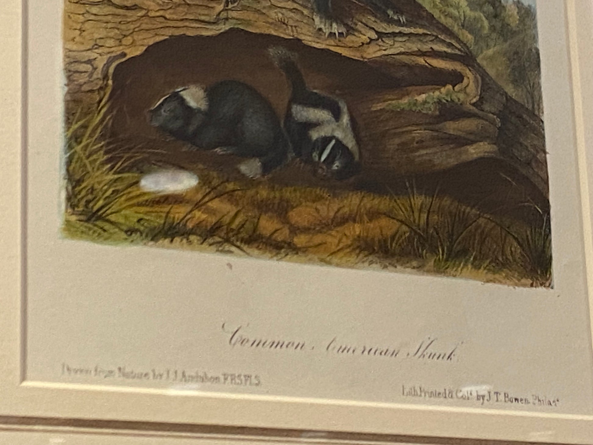 Audubon Octavo print from The Quadrupeds Octavo Edition – Oppenheimer Edition. Shown is a Common American Skunk. The mother is standing on a log protecting her two kits.
