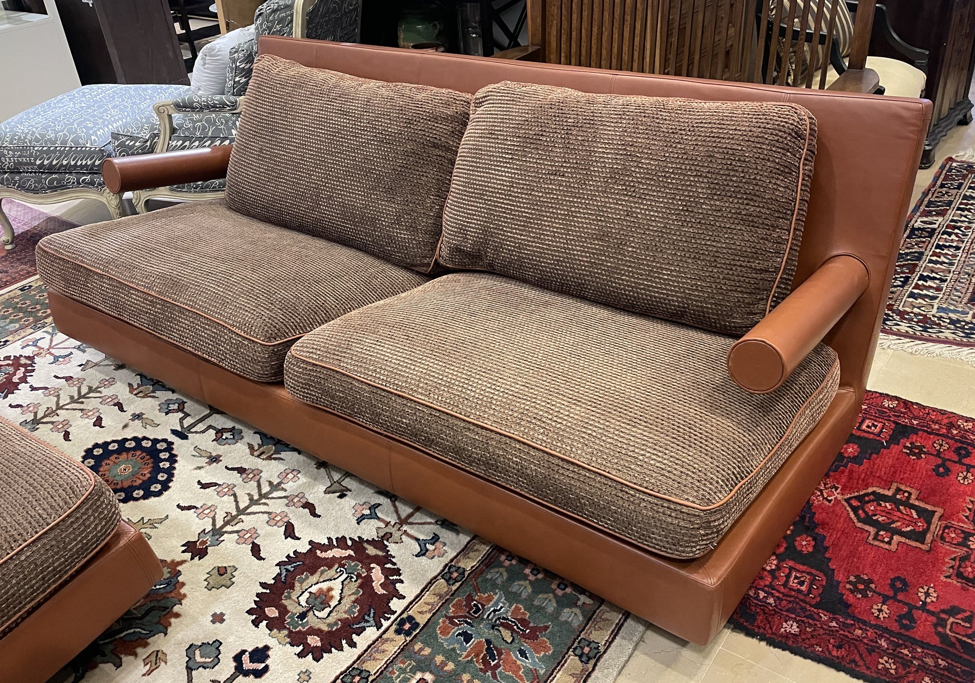 B&B Italia by Antionio Citterio "Baisity" vintage sofa. This charming sofa exudes mid-century modern design. The sofa frame is covered with a caramel brown leather and has two large seats with both a back cushion and seat cushion. The cushions have an inviting, plush, brown fabric with a playful texture. They are further accented with leather piping around the edges that matches the rest of the piece. The sofa sits very low to the ground on casters for easy moveability. A focal point of this piece is its unique cylindrical arms that extend out from the back of the piece. A unique and inviting sofa that is sure to complement a space with mid-century modern flare.