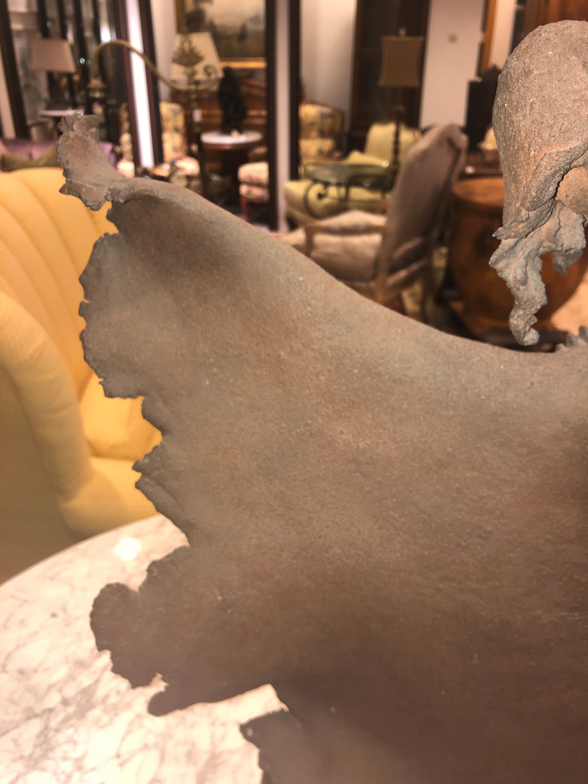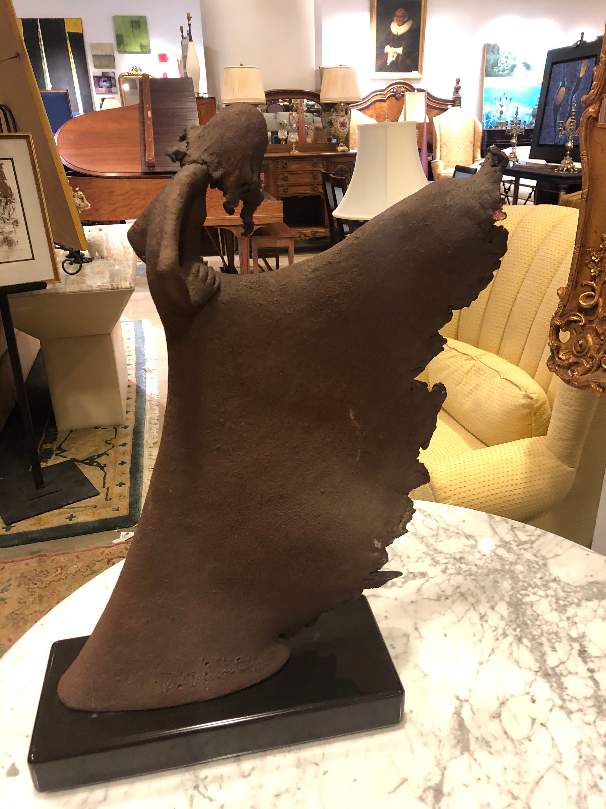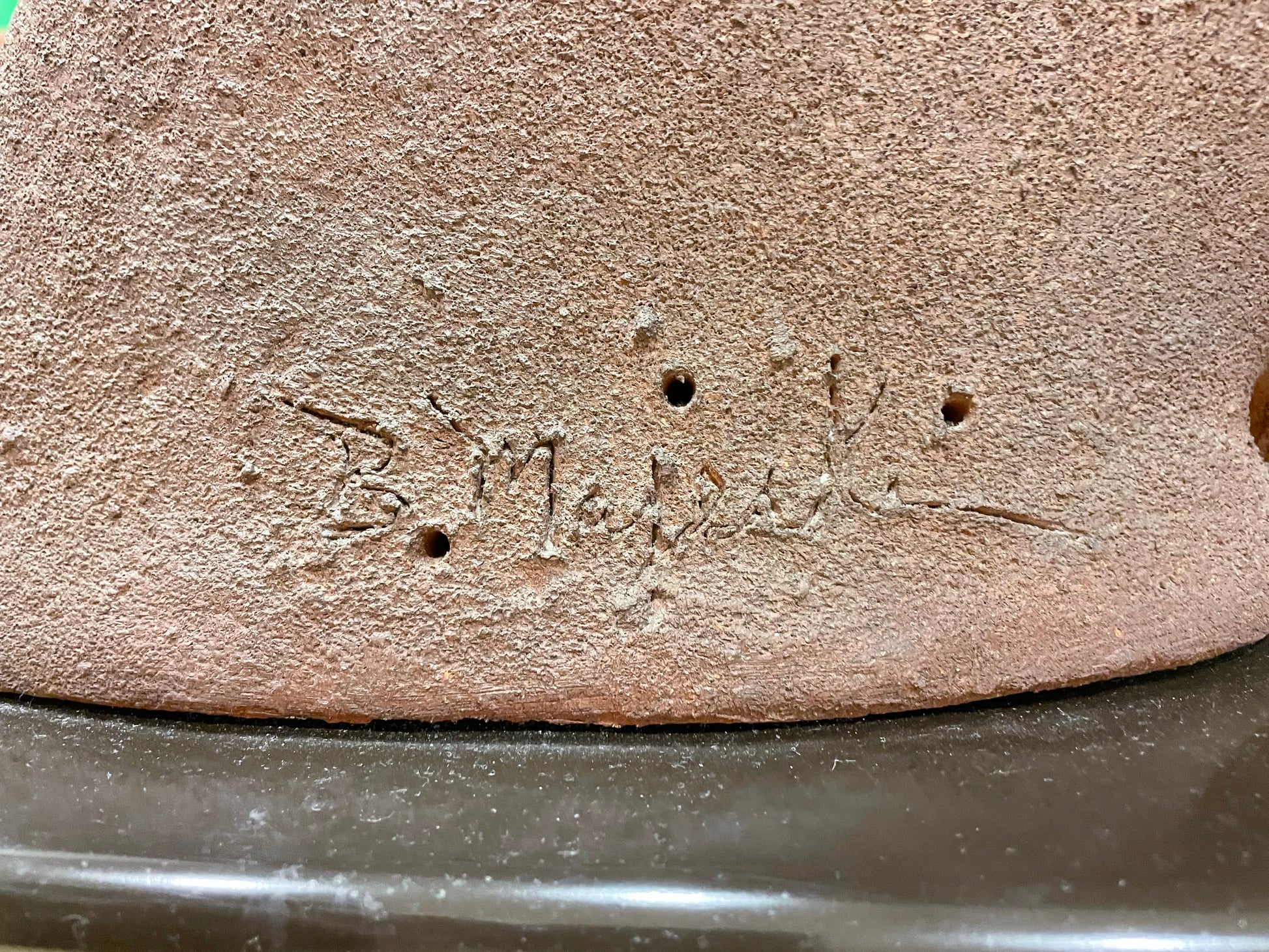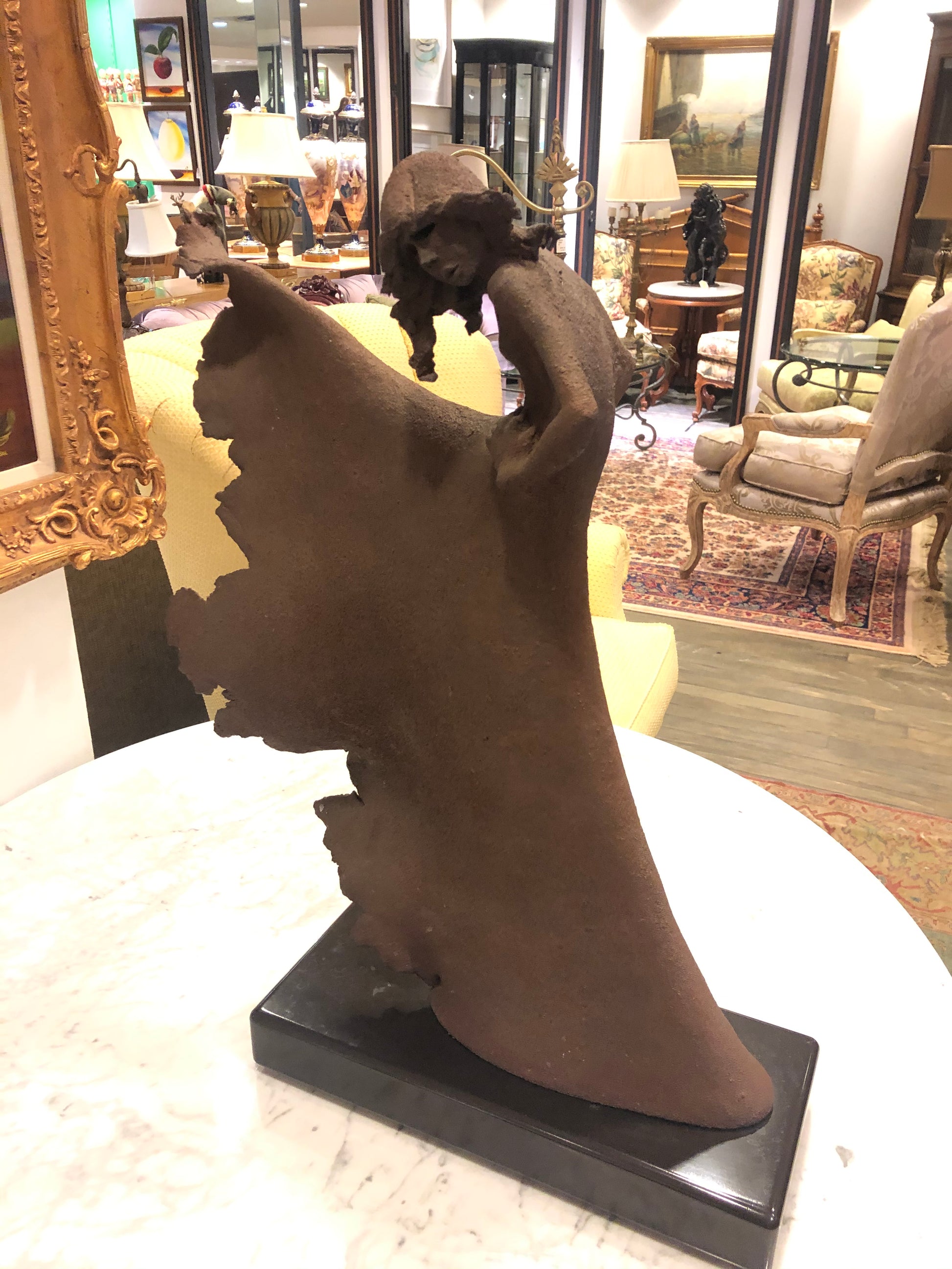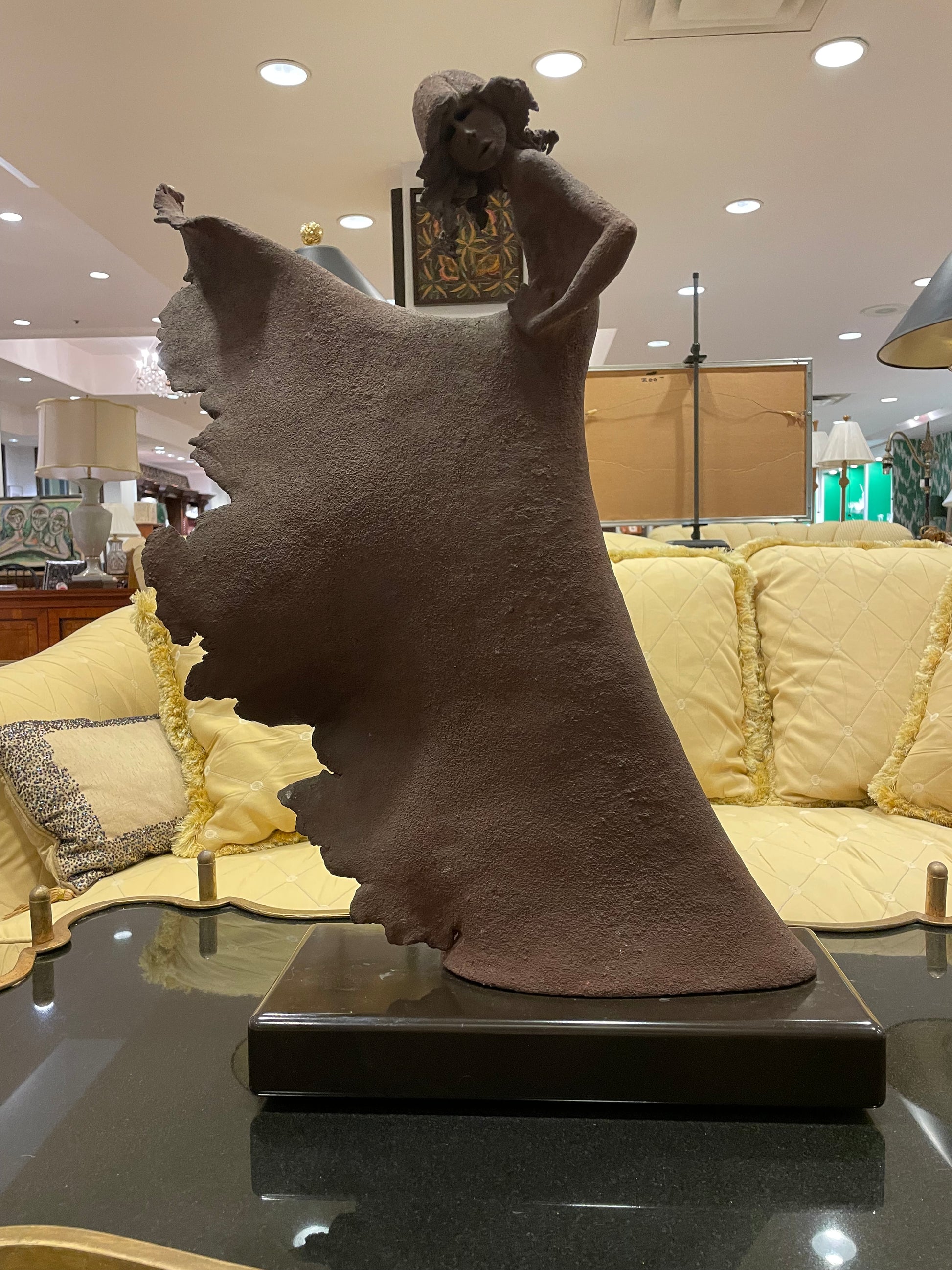 Clay sculpture of female dancer by B. Majeski. Features a figural female in mid-dance position with hands at hips and leg pointed upwards with dress flowing. Rough and ragged texture in earth tones. Figure stands on ebonized acrylic base. Etched "B.Majeski" within sculpture at lower back side.